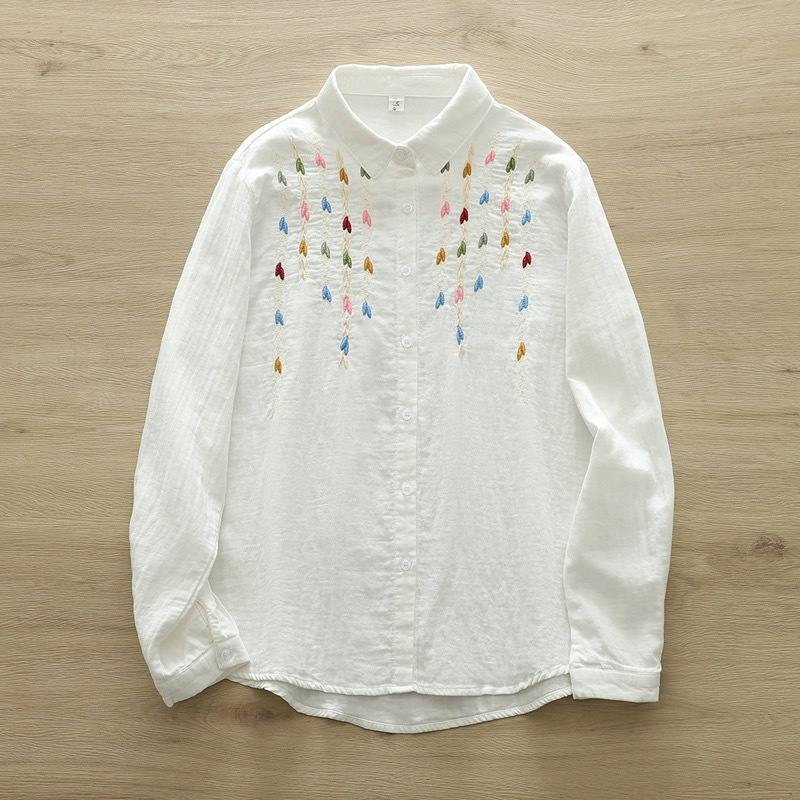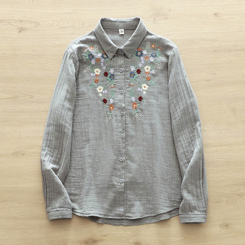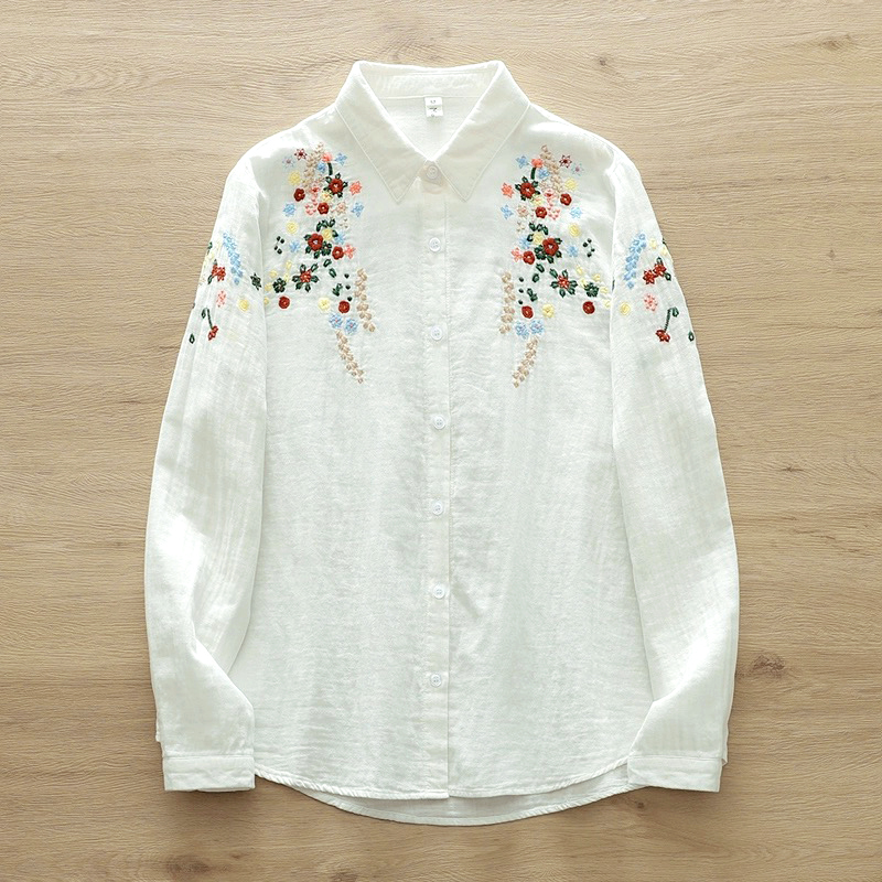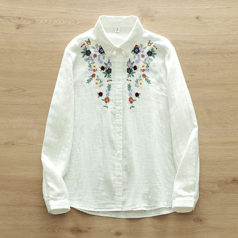 면사 긴팔 셔츠 여성용 숲속풍 문예 꽃자수 부드럽고 피부 친화적인 순면 루즈핏 이너웨어 봄옷스토어 가기