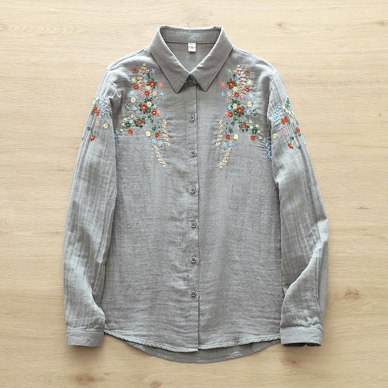 면사 긴팔 셔츠 여성용 숲속풍 문예 꽃자수 부드럽고 피부 친화적인 순면 루즈핏 이너웨어 봄옷
