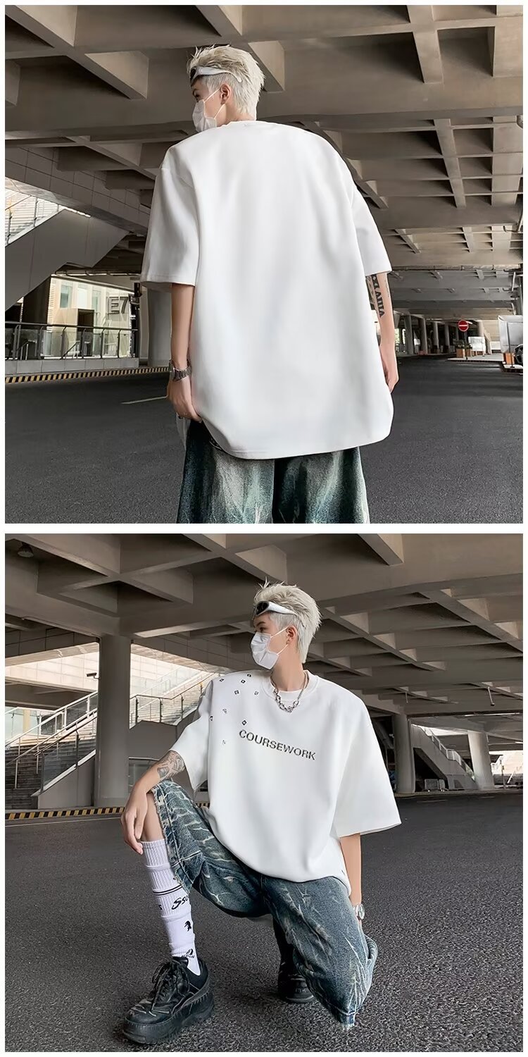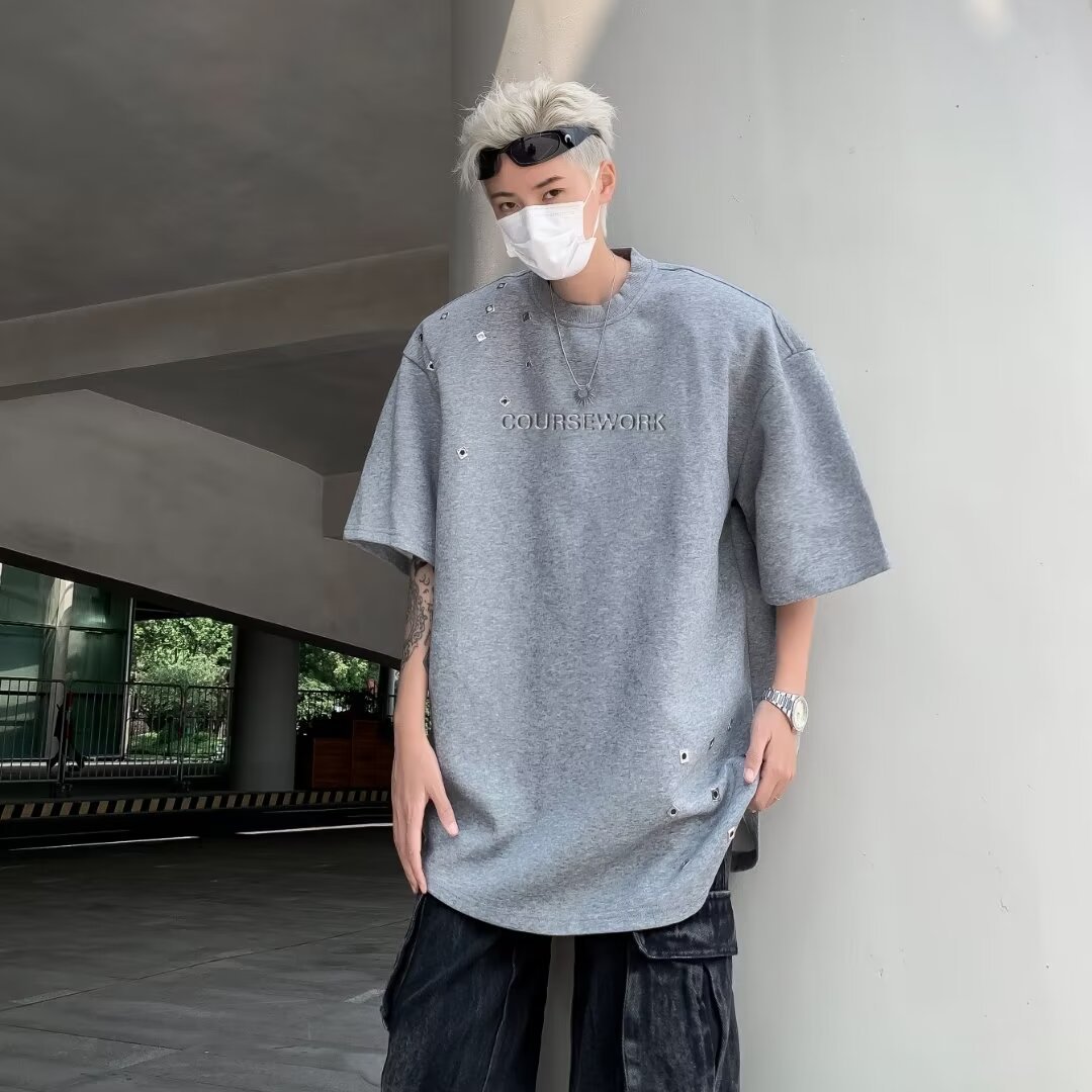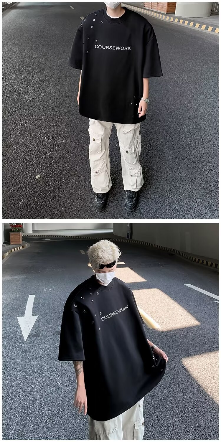 여름 패션 틈새 금속 3 차원 문자 인쇄 디자인 어깨 패드 짧은 소매 실루엣 느슨한 올 매치 캐주얼 티셔츠