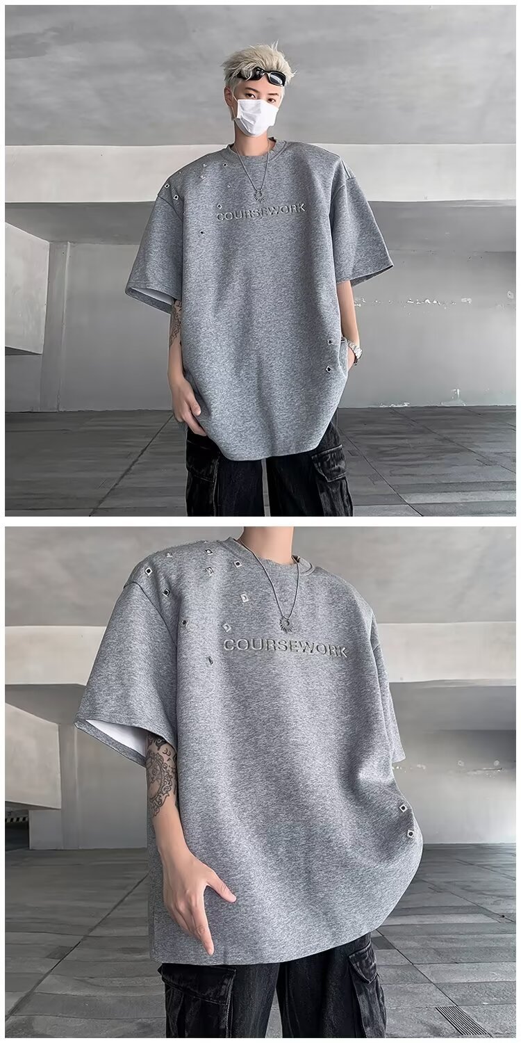 여름 패션 틈새 금속 3 차원 문자 인쇄 디자인 어깨 패드 짧은 소매 실루엣 느슨한 올 매치 캐주얼 티셔츠스토어 가기
