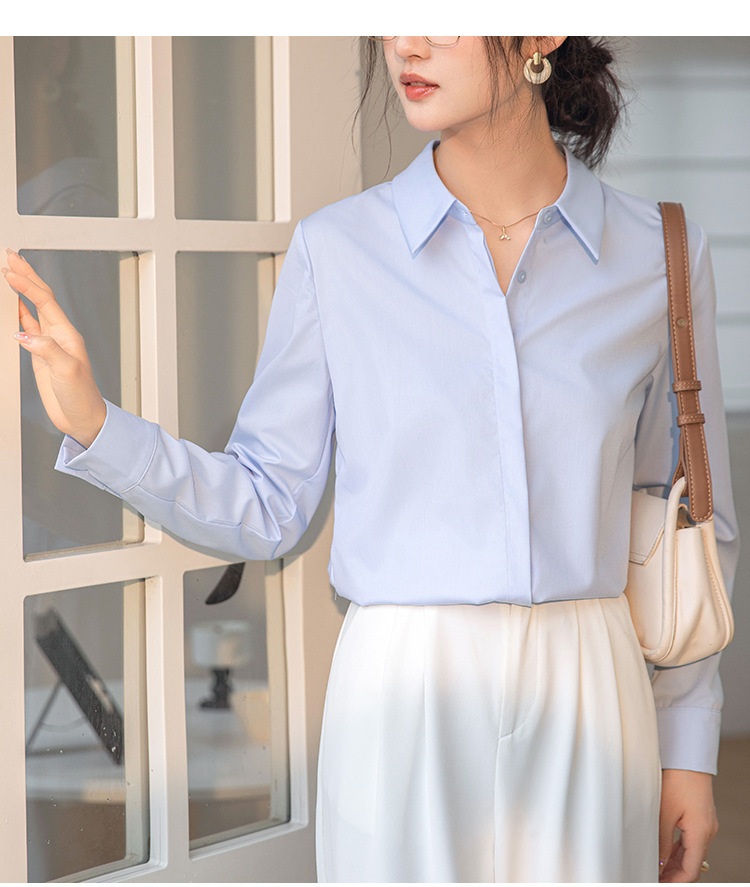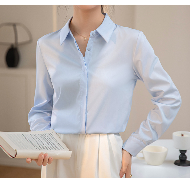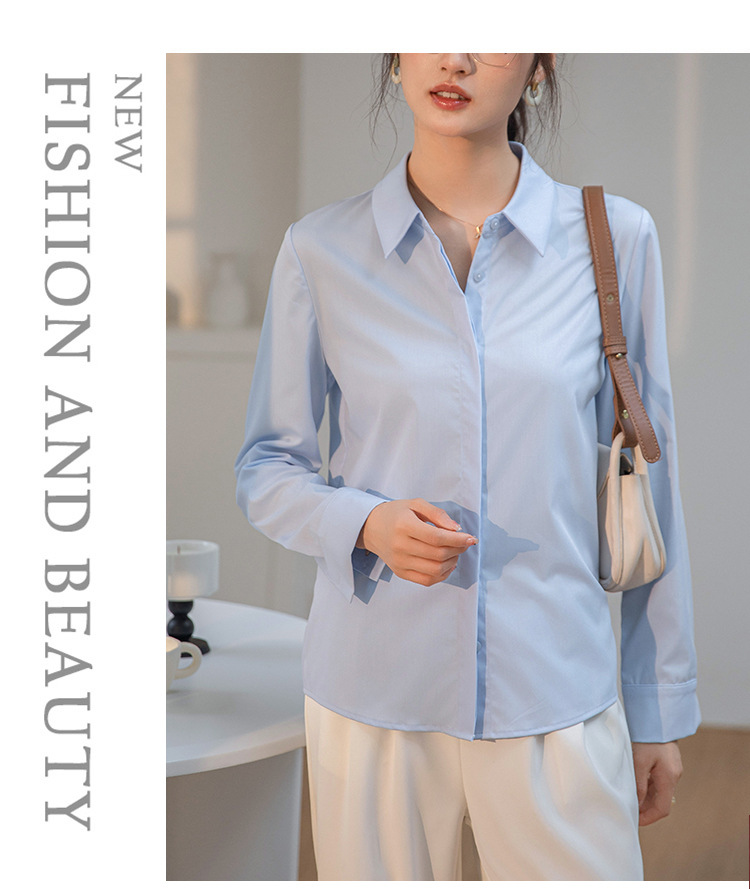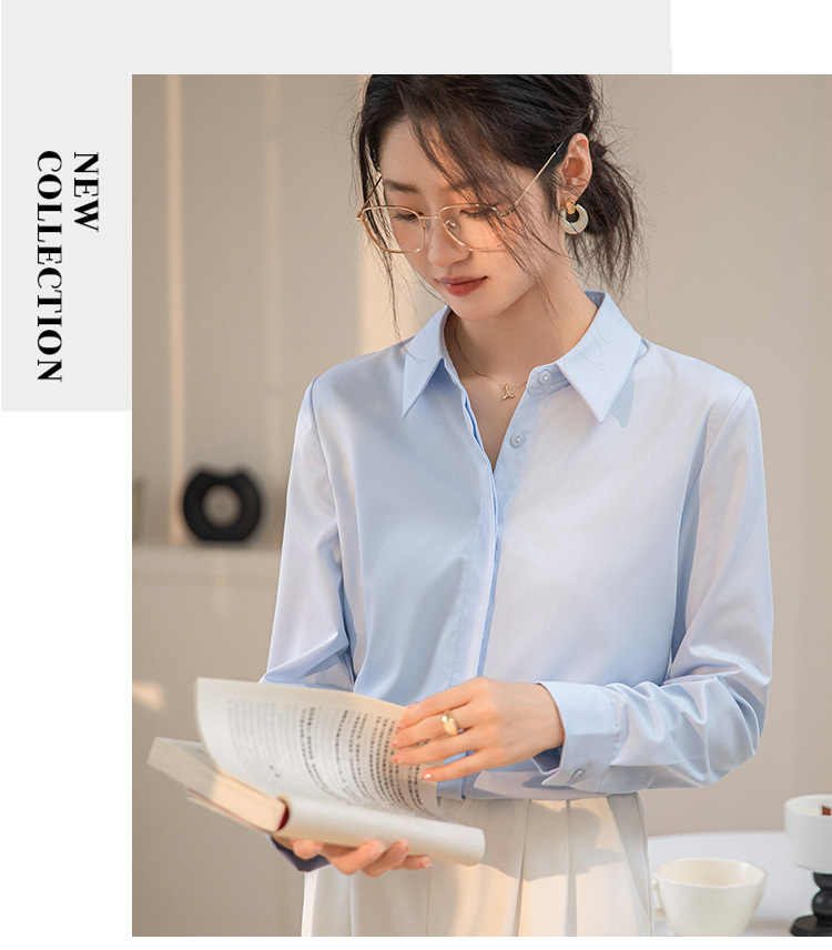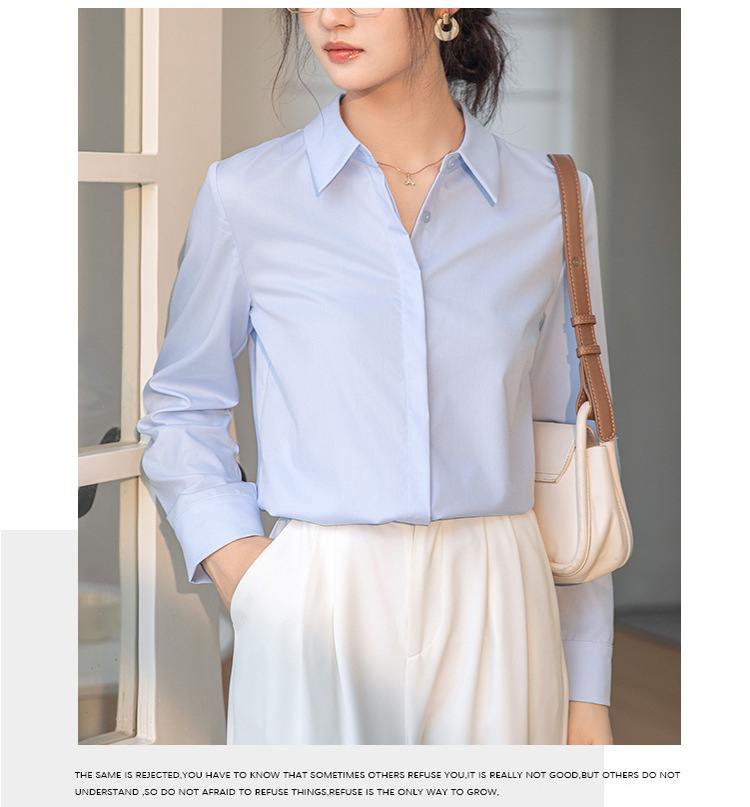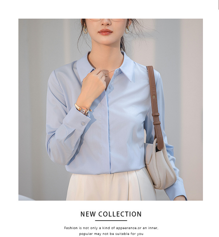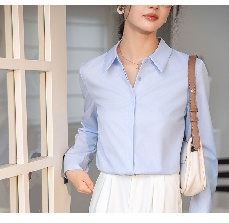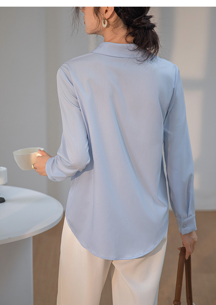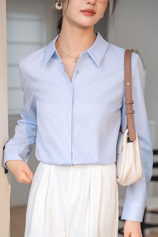 2024 리얼 샷 새로운 라이트 블루 셔츠 긴 소매 가을 다크 플래켓 POLO 칼라 모달 통근 기질 탑스토어 가기
