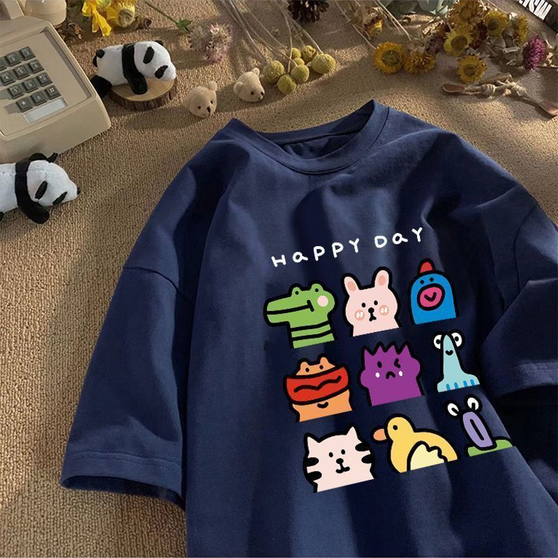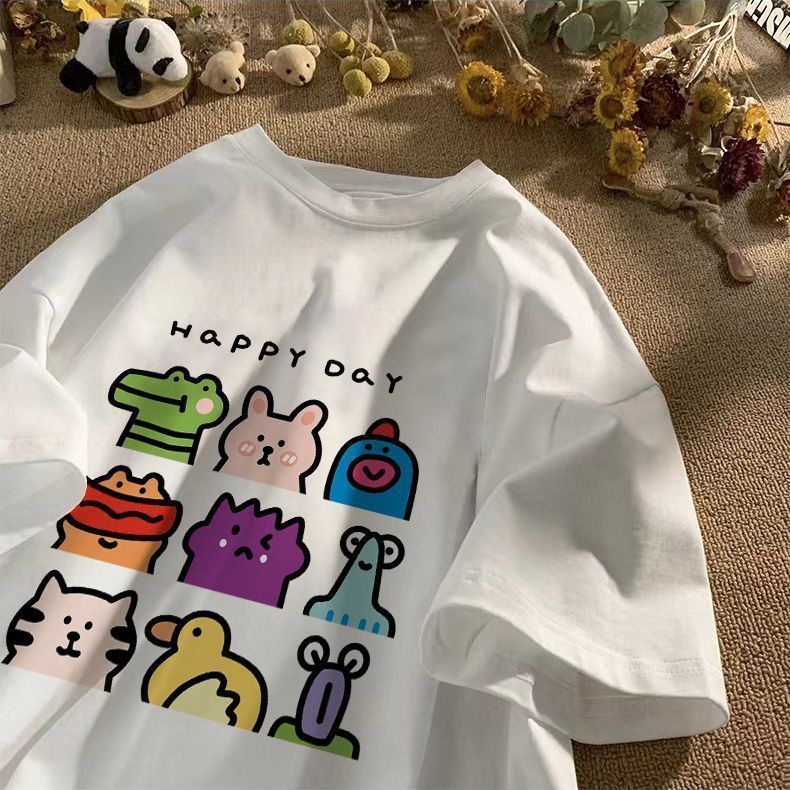 [목선 테두리] 코튼 반팔 외국 스타일의 유행하지 않은 느슨한 만화 인쇄 티셔츠 여성의 게으른 바람스토어 가기