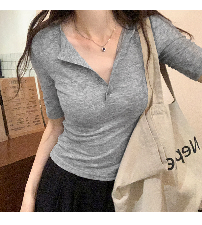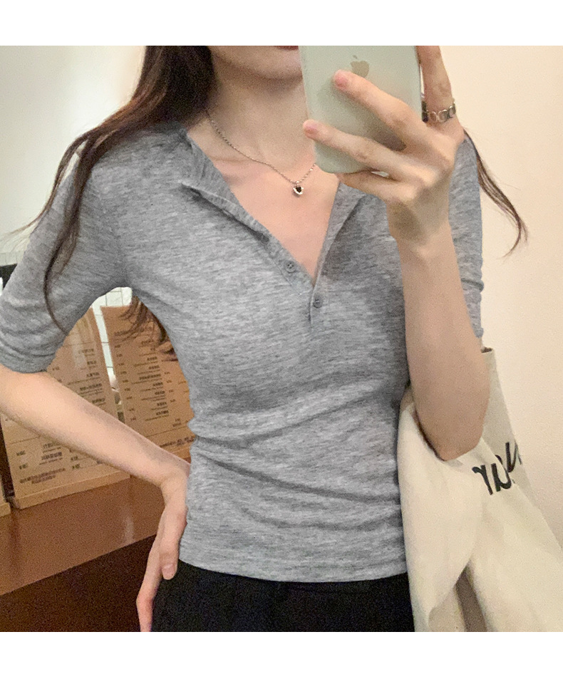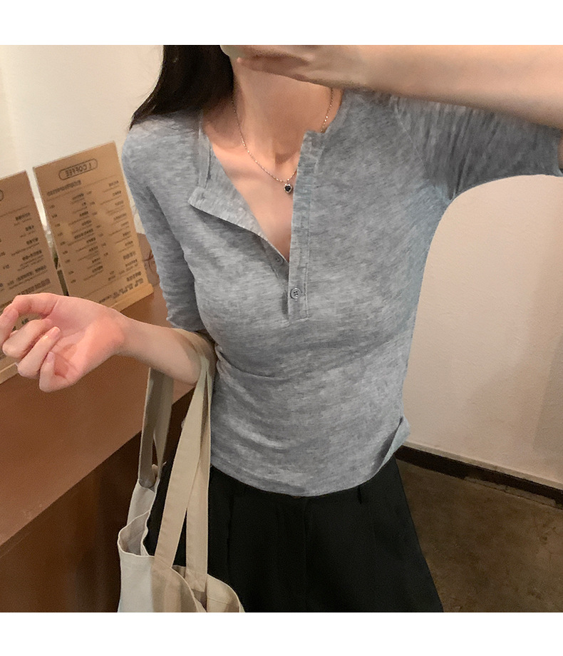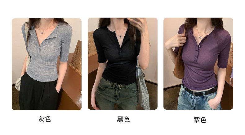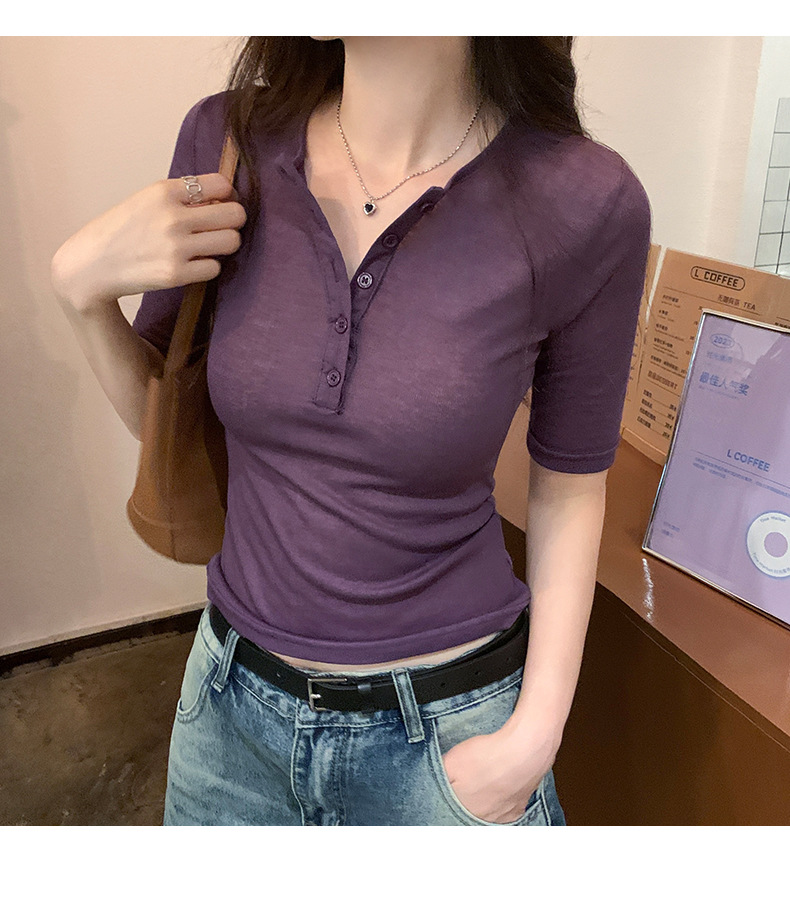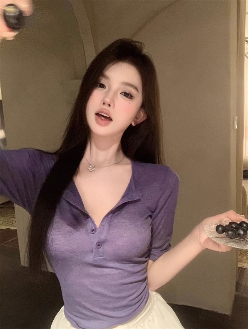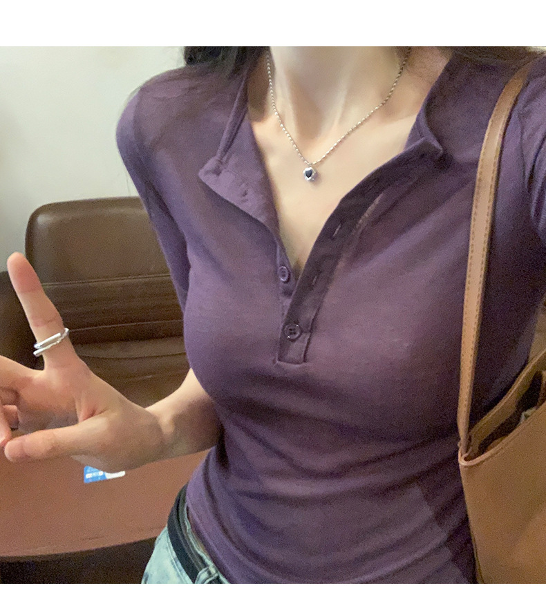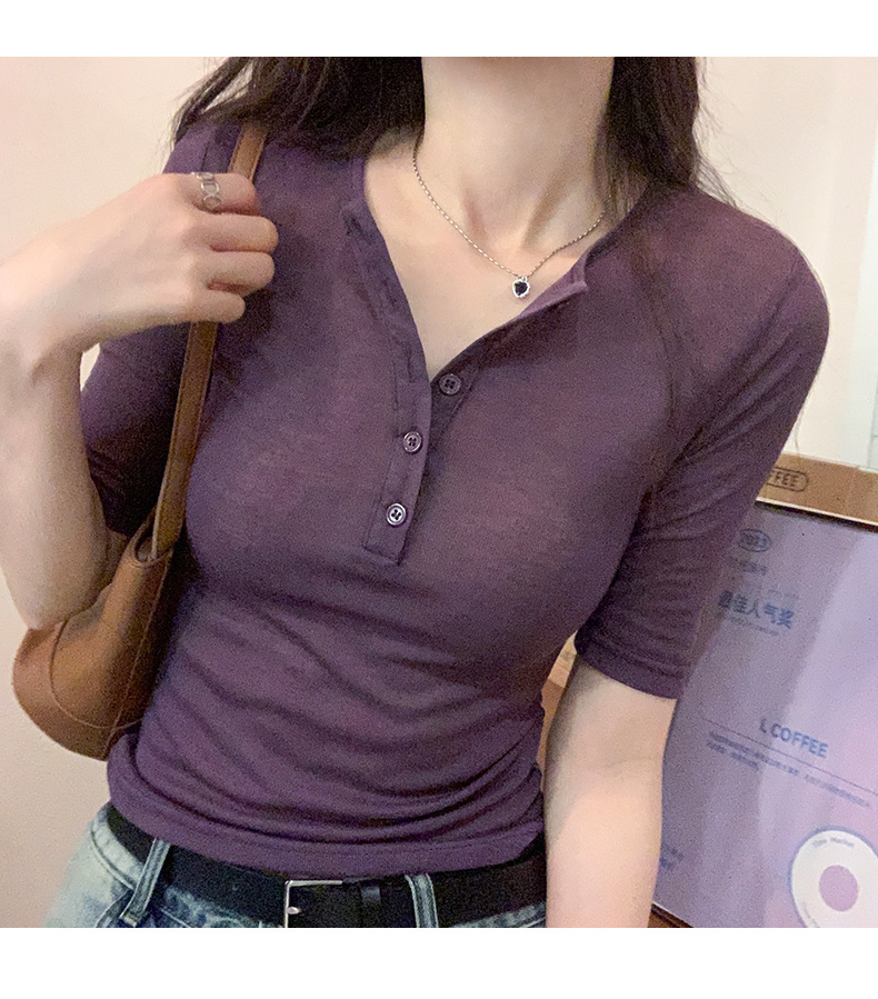 달콤하고 매콤한 브이넥 로얄시스 스타일 싱글 버튼 티셔츠 여성용 7부소매 탑 2025 여름 보라색 화이트 바닥 셔츠스토어 가기