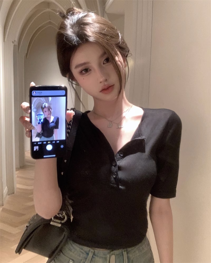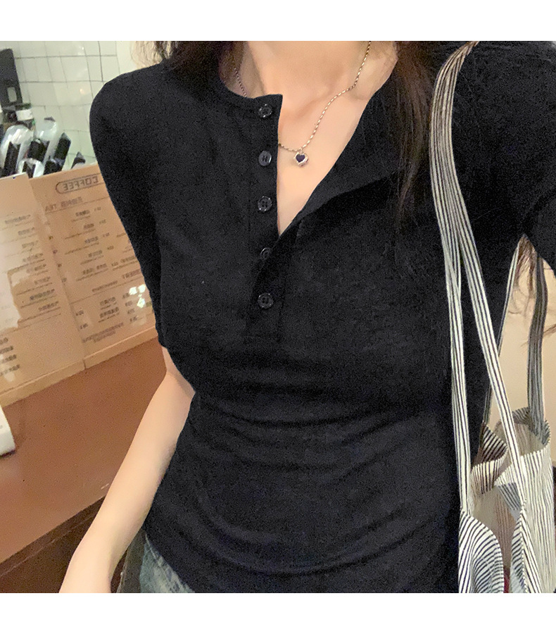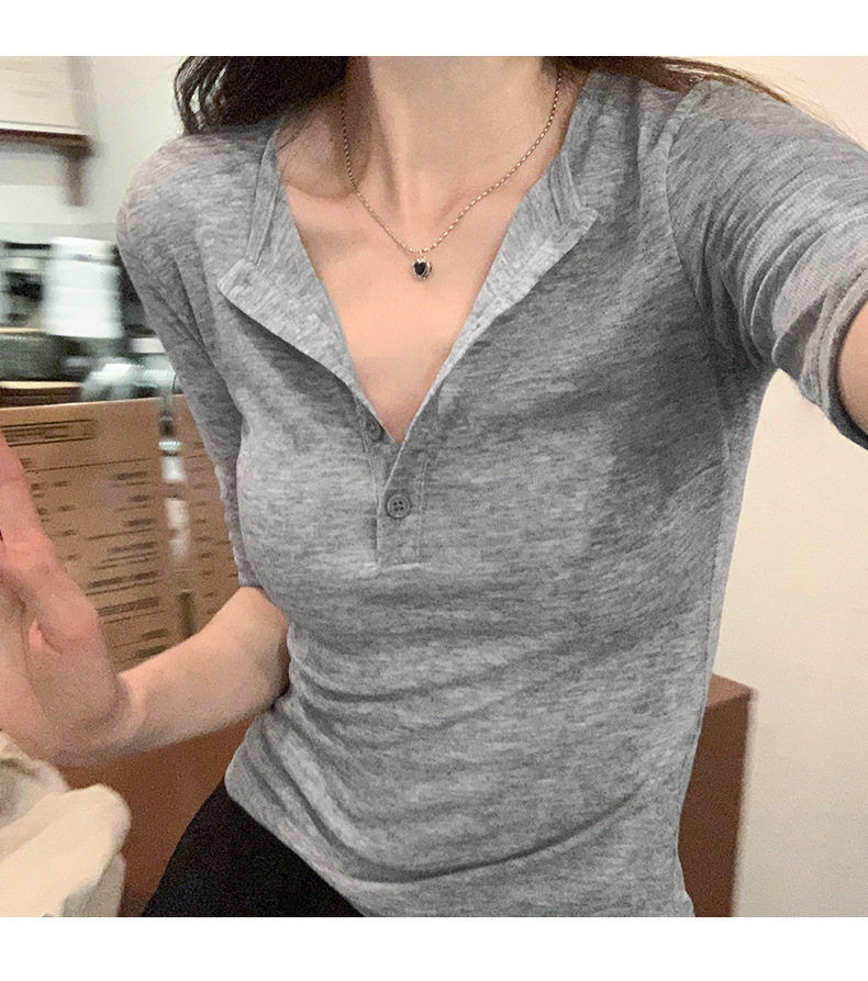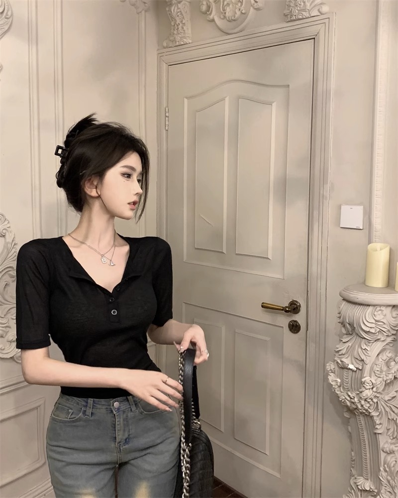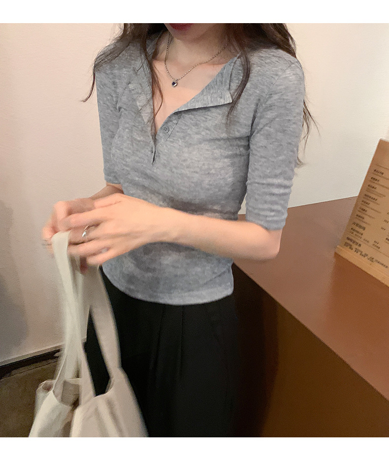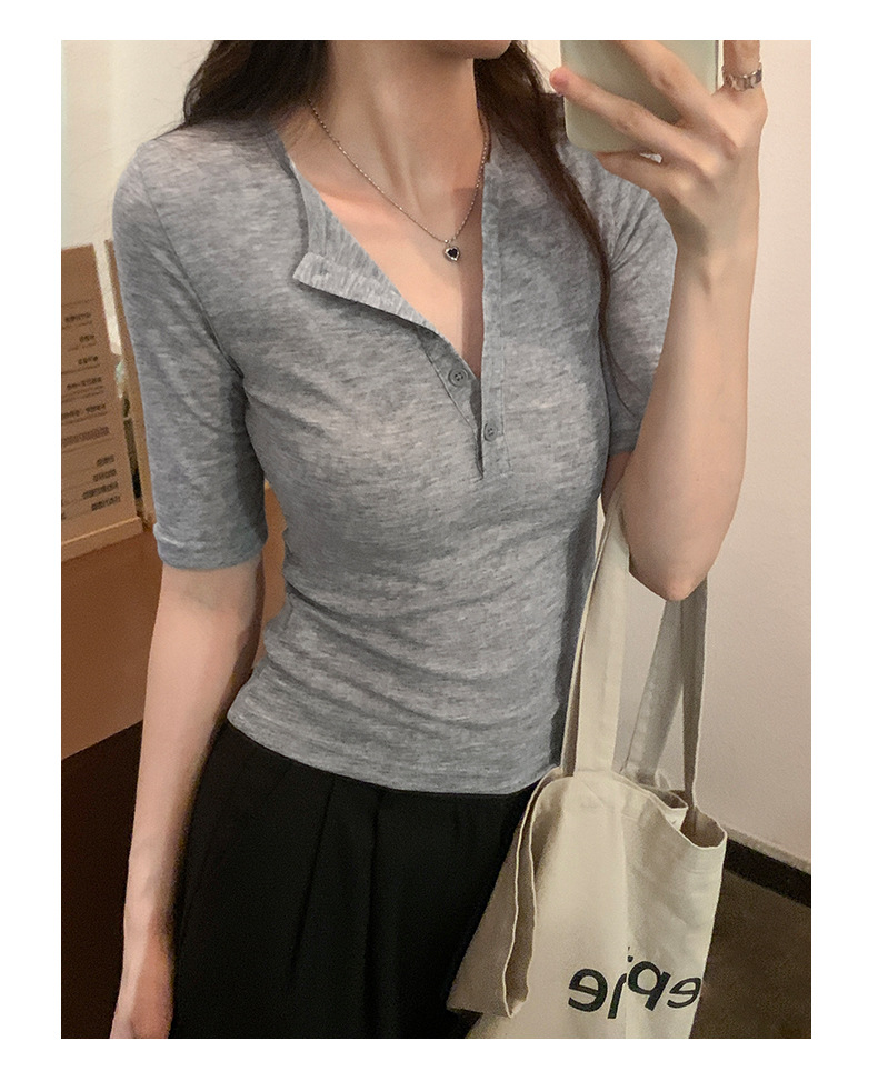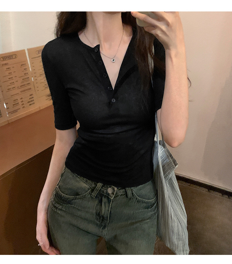 달콤하고 매콤한 브이넥 로얄시스 스타일 싱글 버튼 티셔츠 여성용 7부소매 탑 2025 여름 보라색 화이트 바닥 셔츠스토어 가기