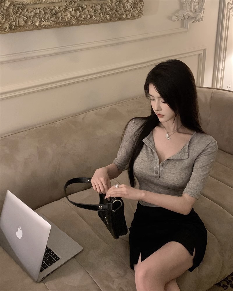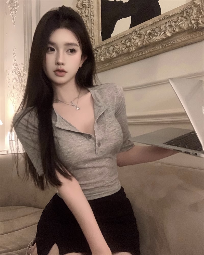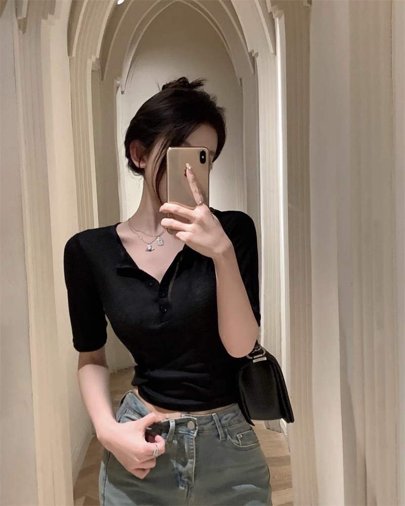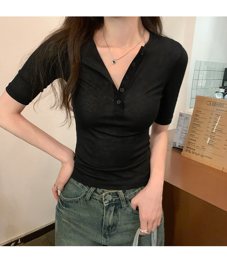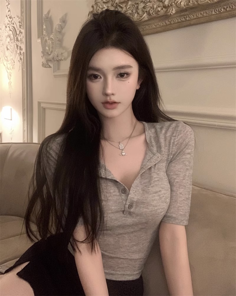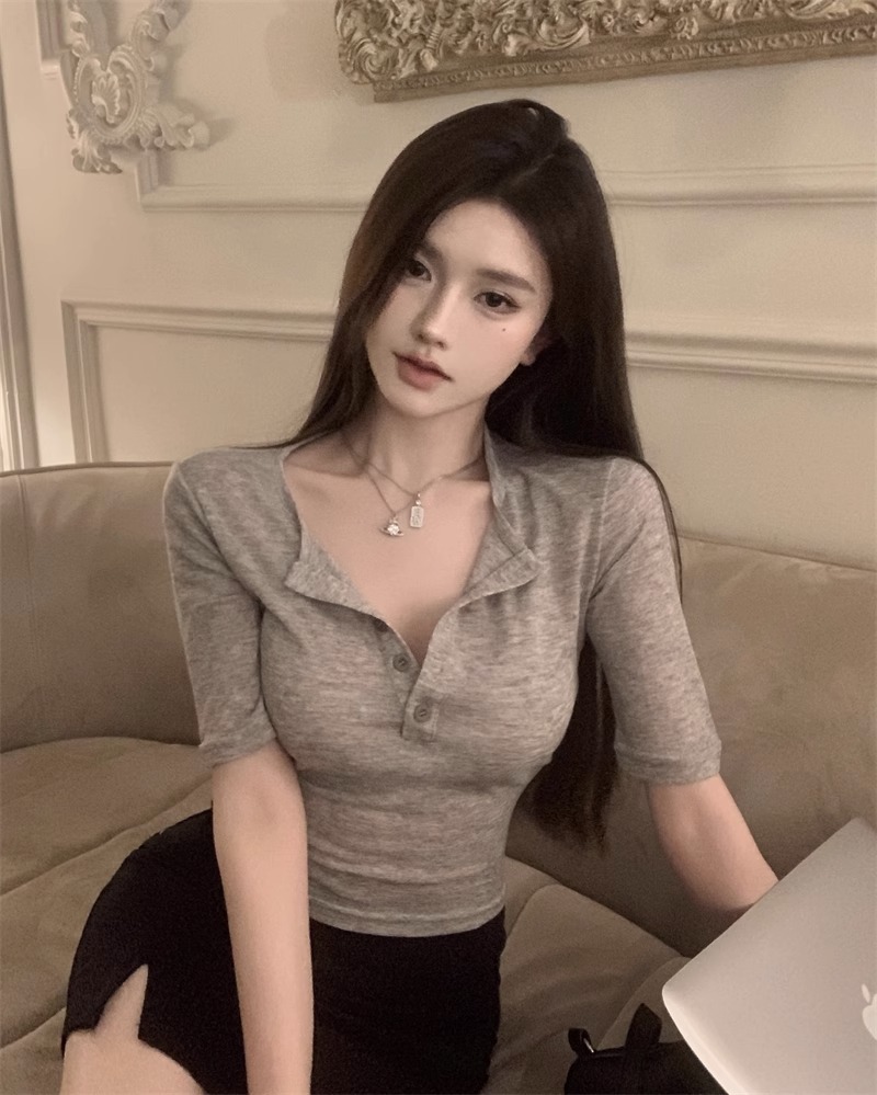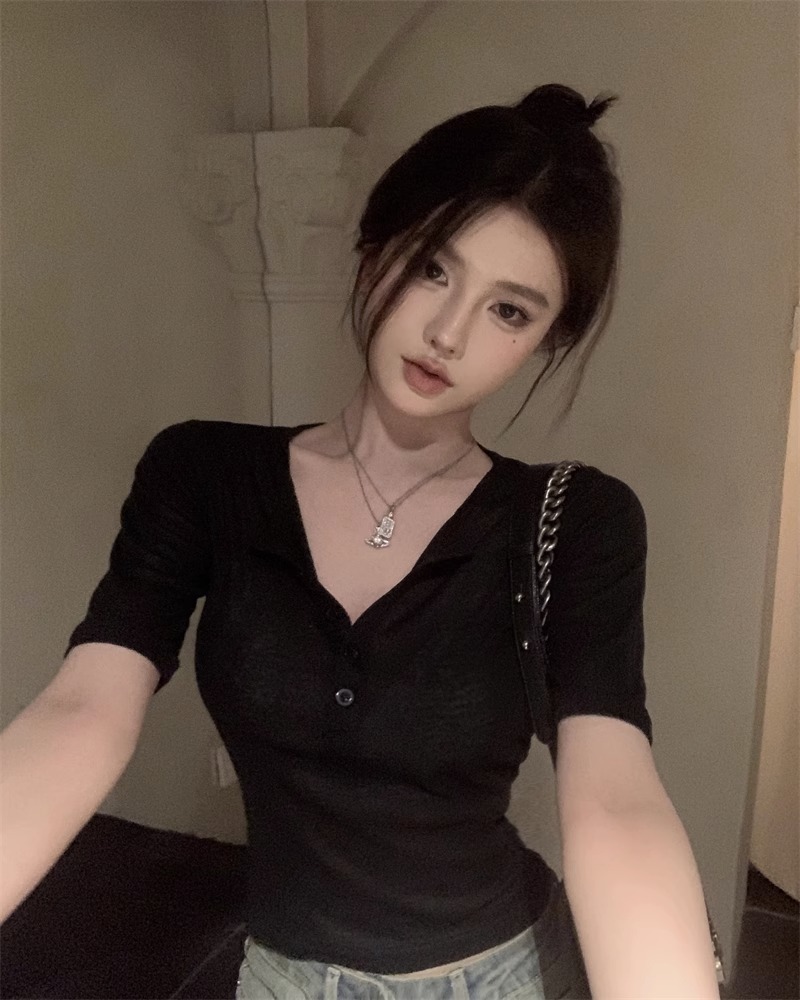 달콤하고 매콤한 브이넥 로얄시스 스타일 싱글 버튼 티셔츠 여성용 7부소매 탑 2025 여름 보라색 화이트 바닥 셔츠스토어 가기