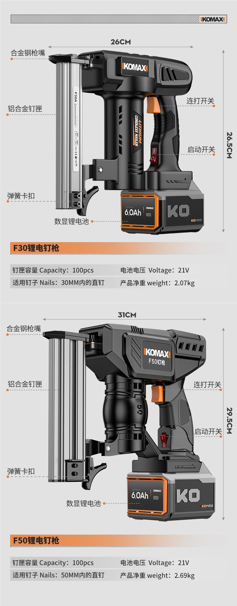 • F30 리튬 배터리 네일건 [6.0Ah 전자 디스플레이] 배터리 2개 및 충전기 1개 + 무료 직선 못 1000개
