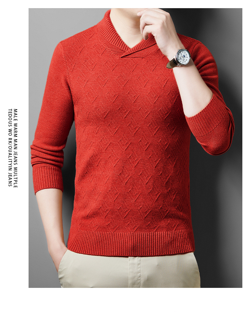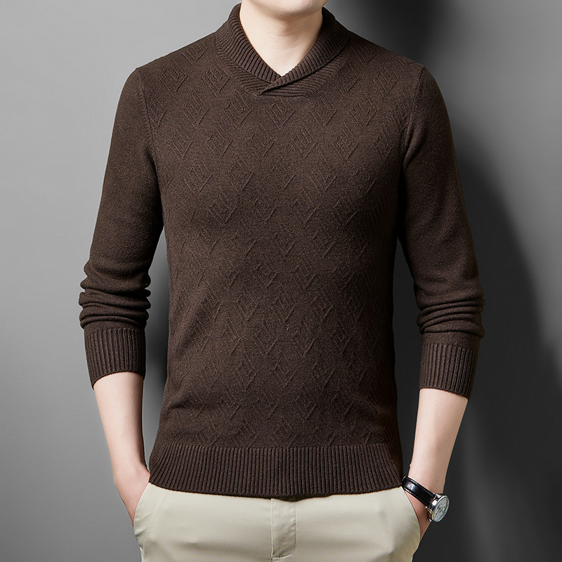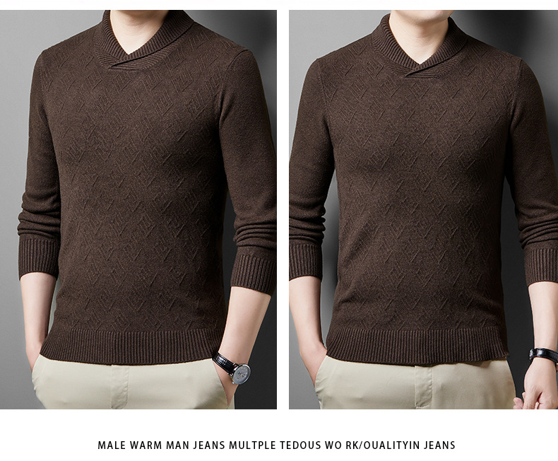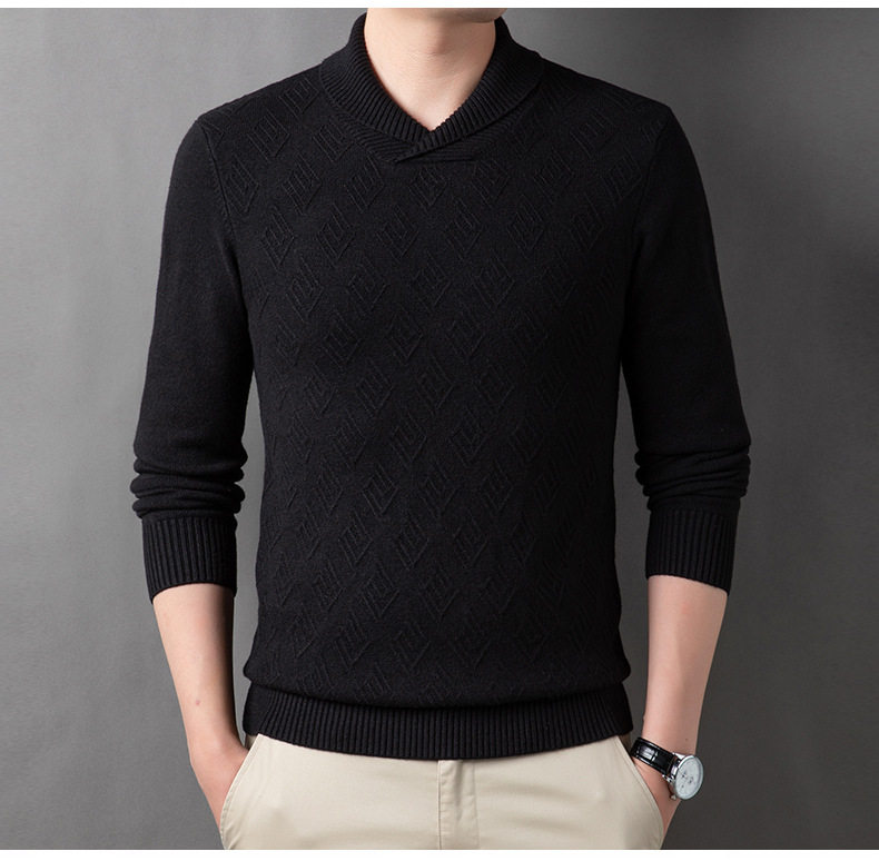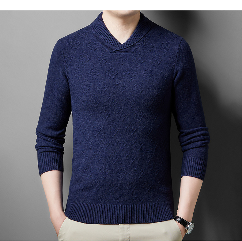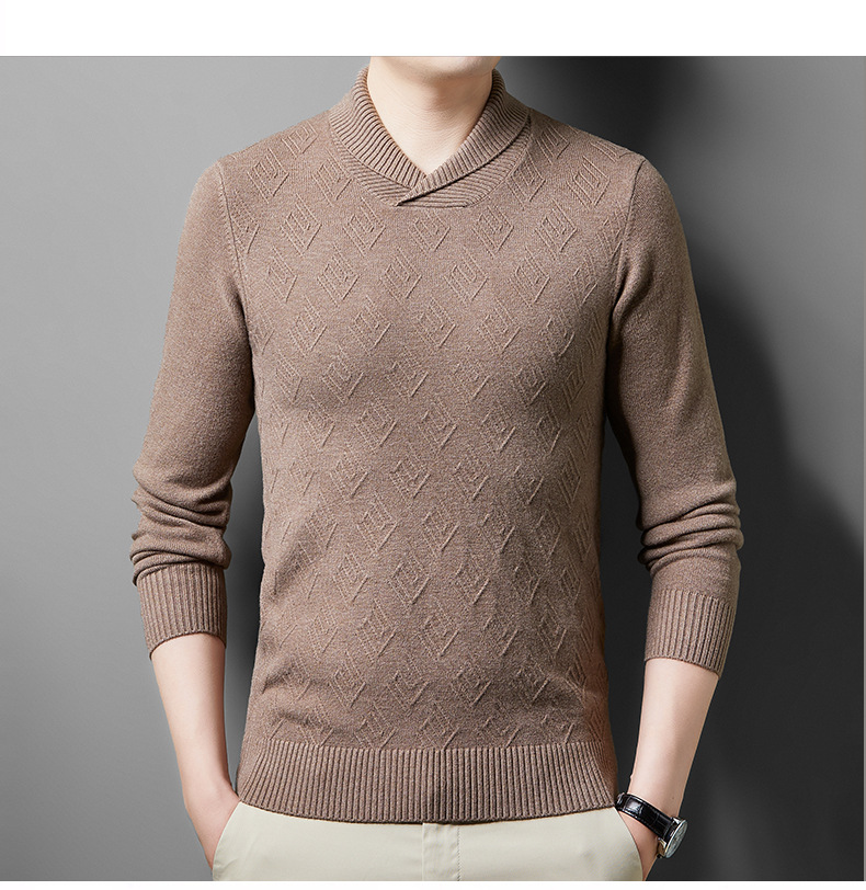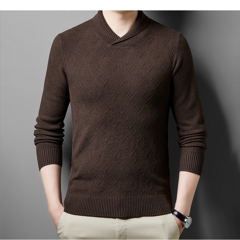 남자 한국식 패션 가을과 겨울 캐주얼 자카드 니트 스웨터 긴팔 스카프 칼라 고급 보텀 아빠 셔츠