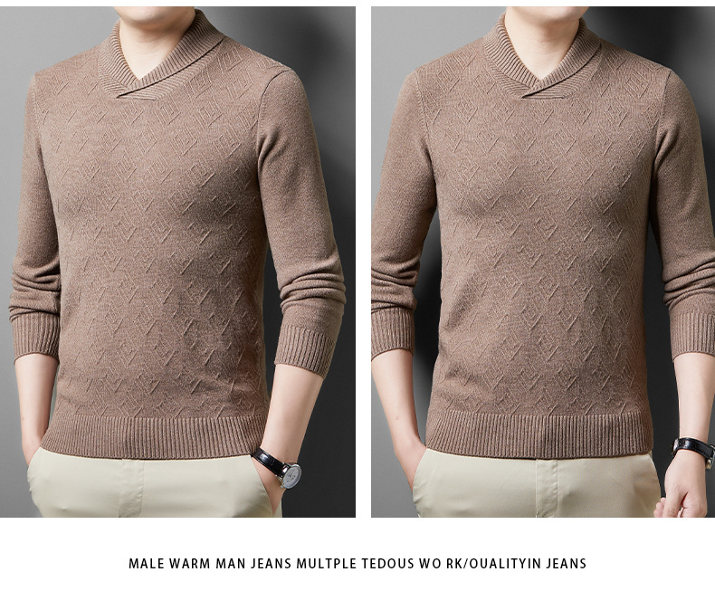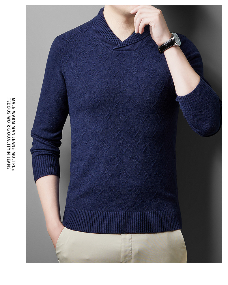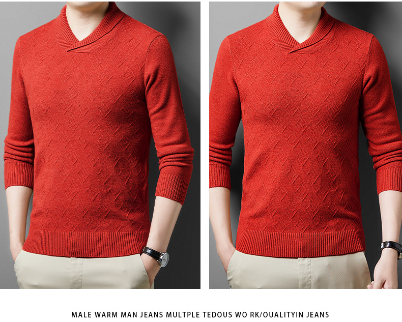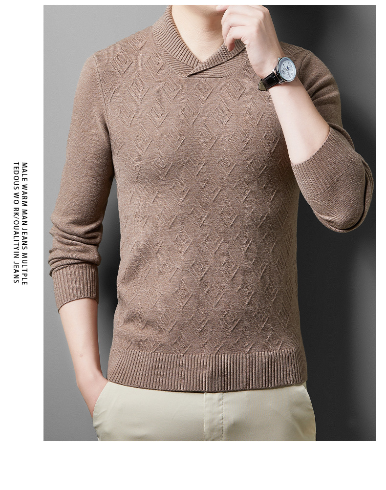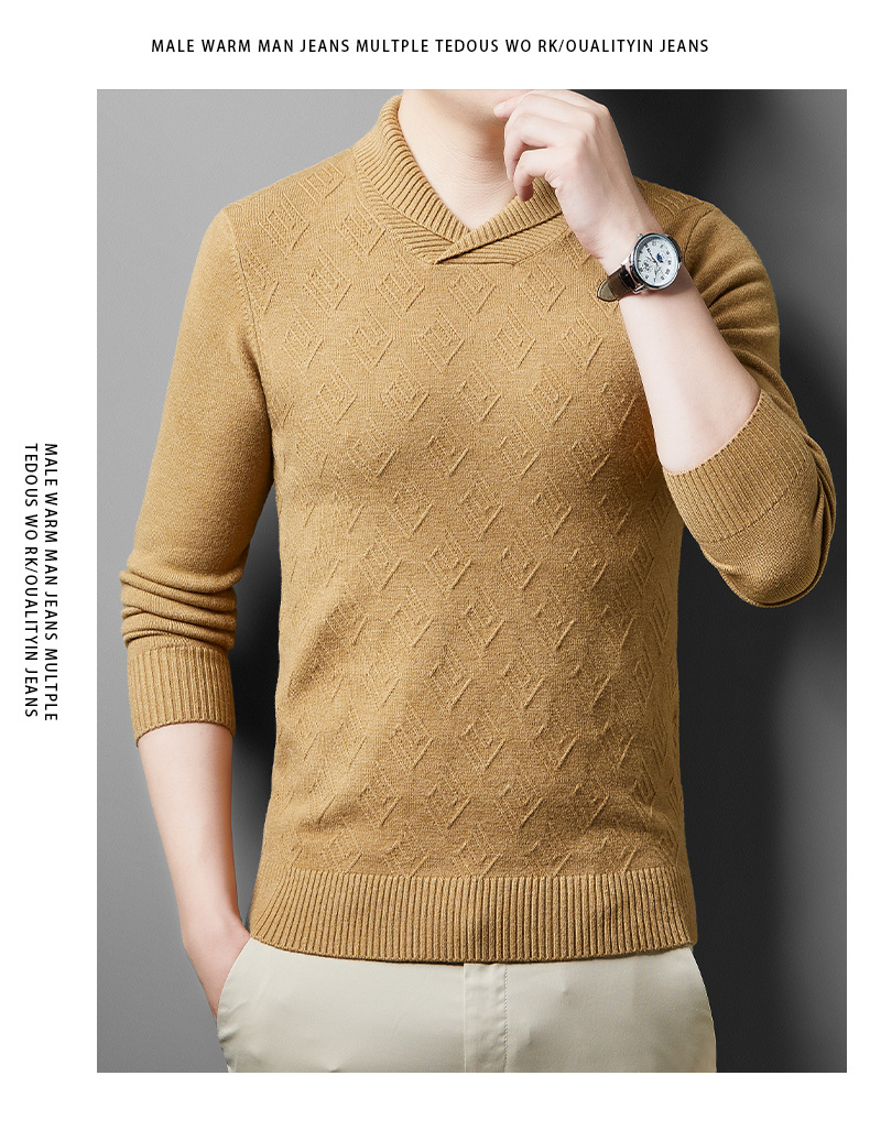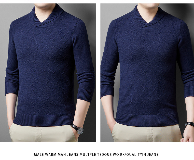 남자 한국식 패션 가을과 겨울 캐주얼 자카드 니트 스웨터 긴팔 스카프 칼라 고급 보텀 아빠 셔츠