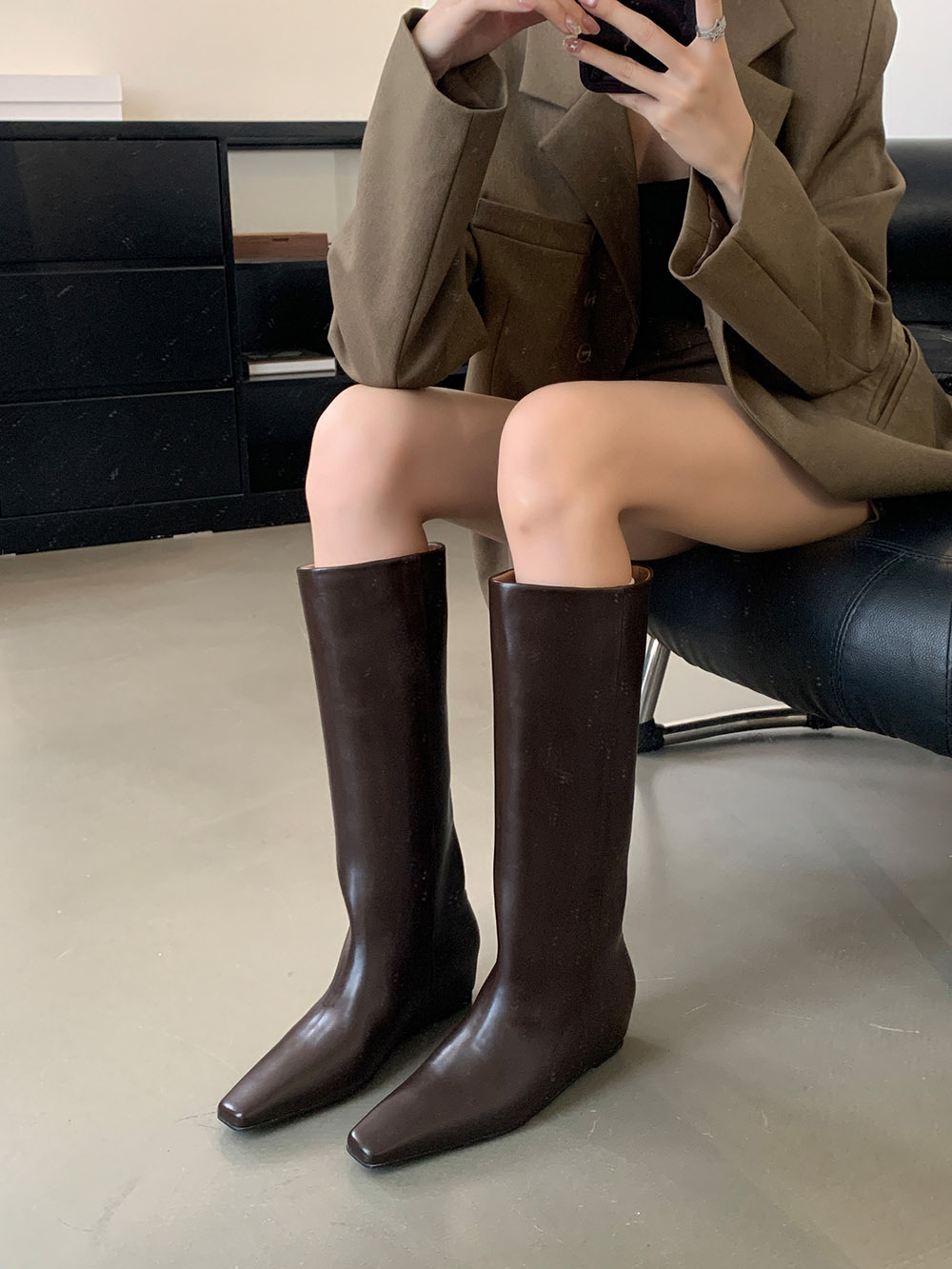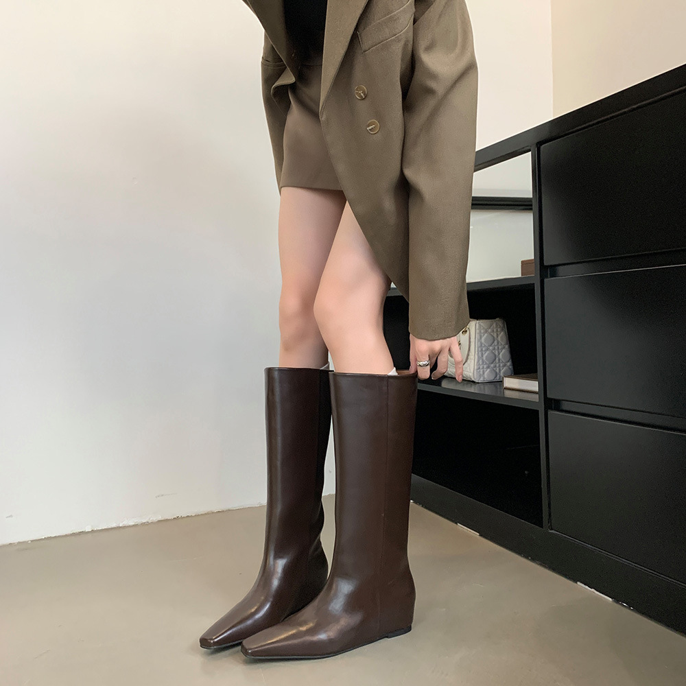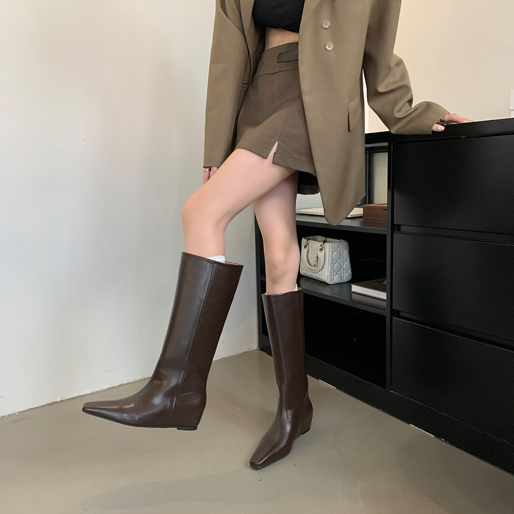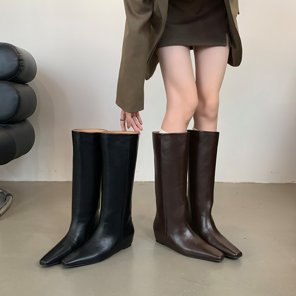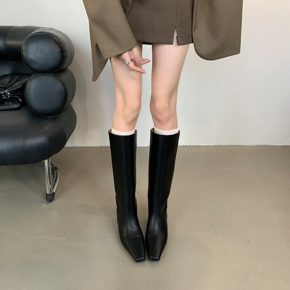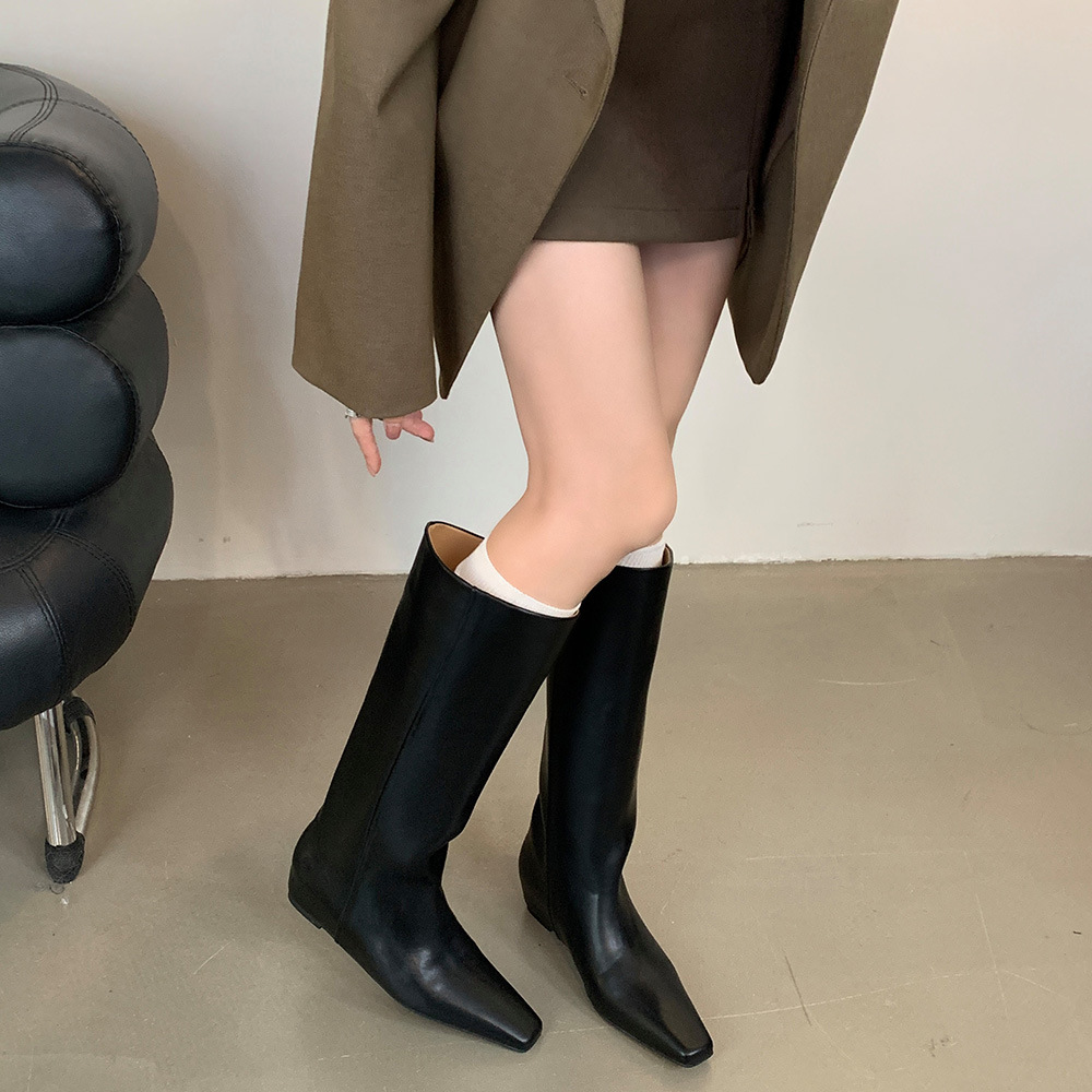 하이 부츠 2025 가을 겨울 신상 블랙 복고풍 무릎 위 패션 부츠 여성 심플 포인티드 스트레이트 라이더 부츠스토어 가기