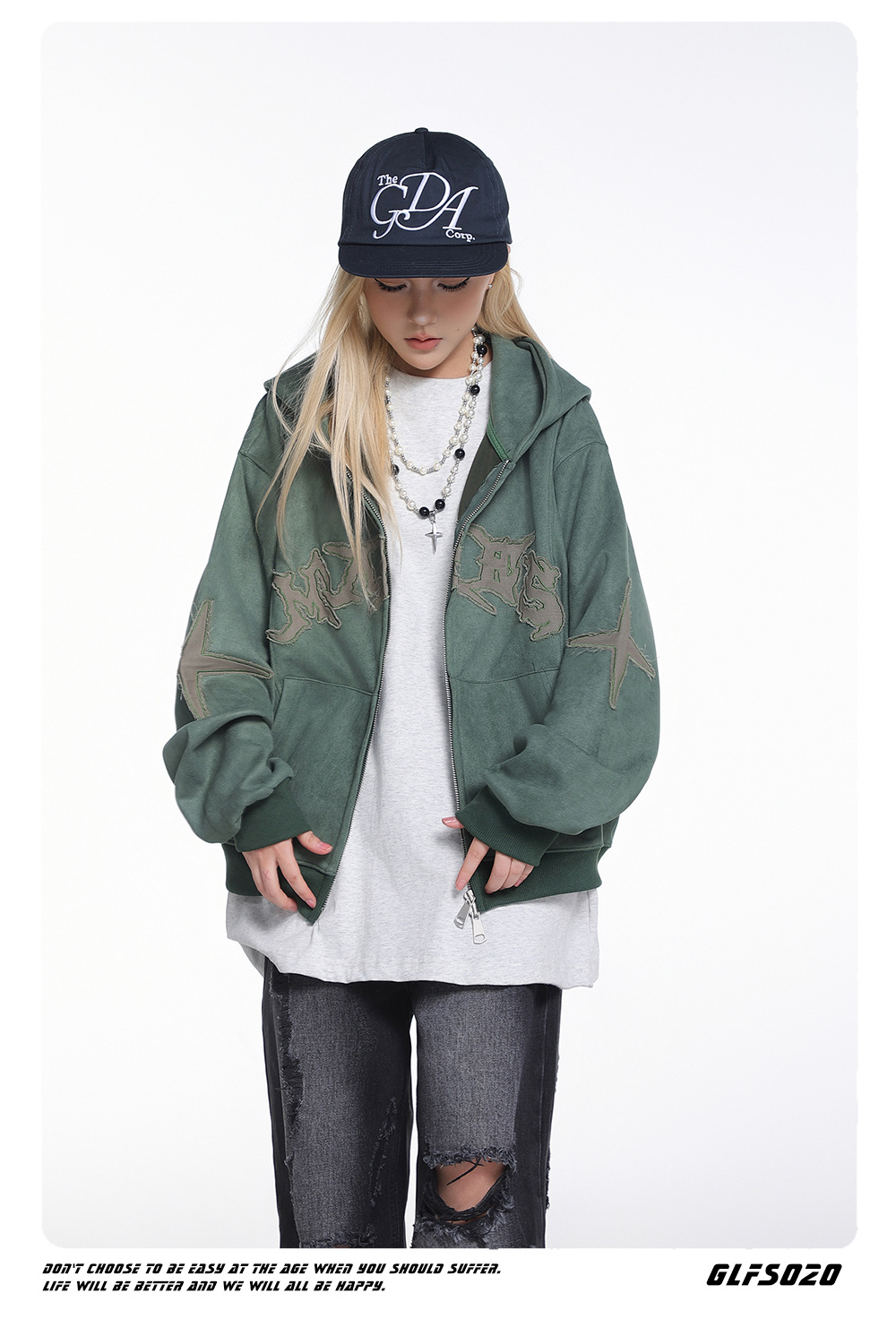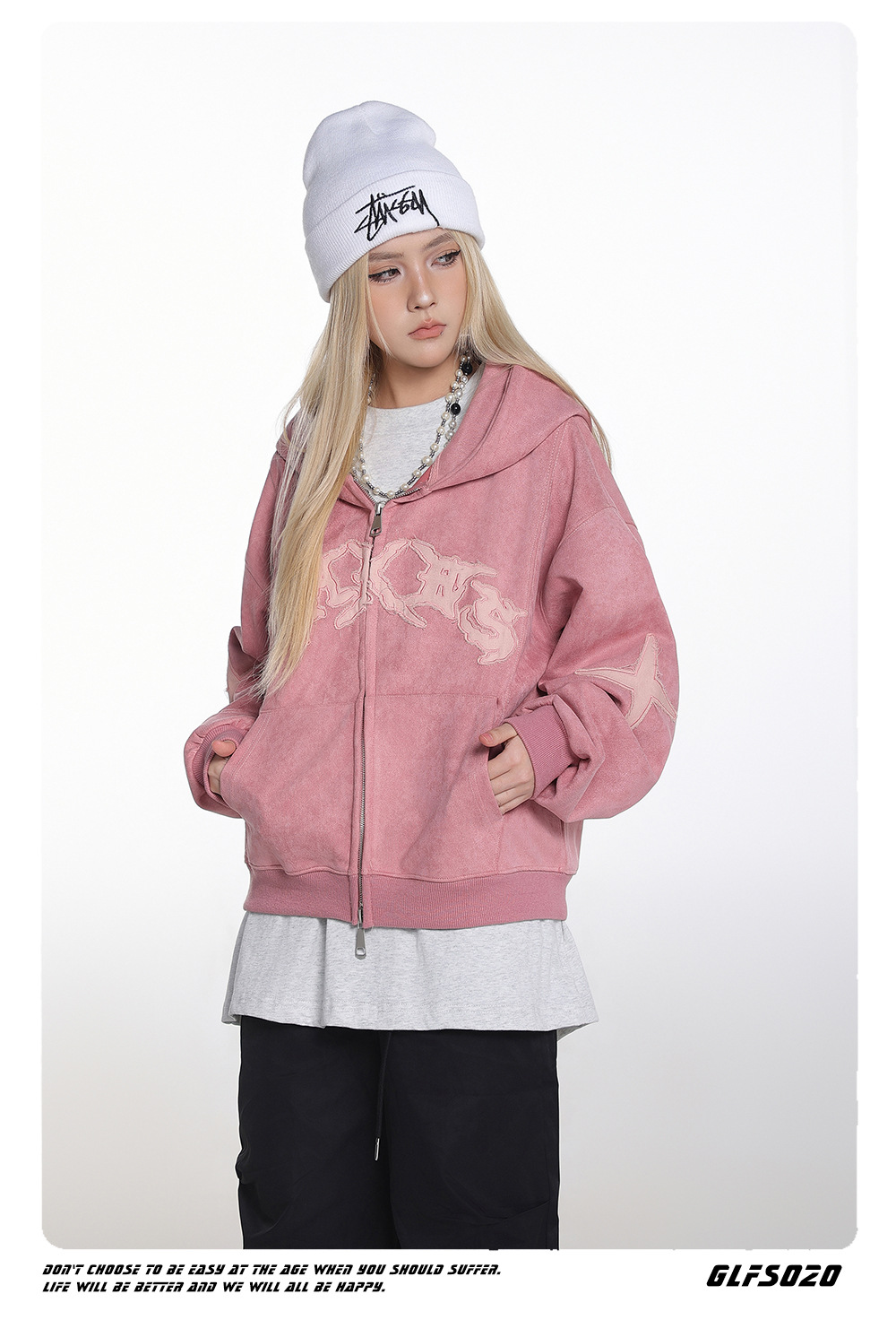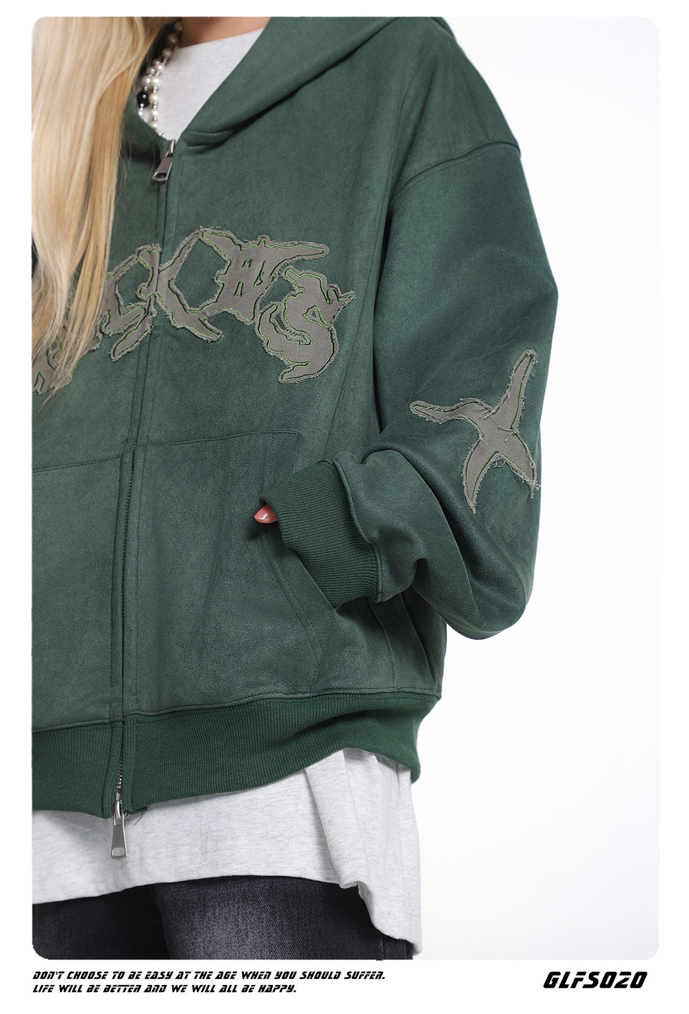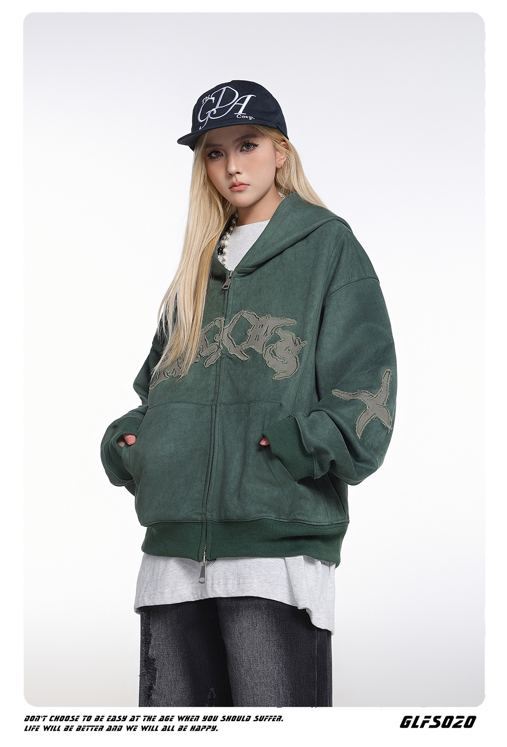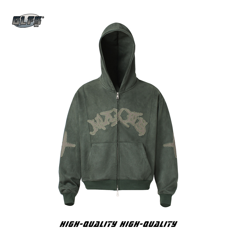 GLFS2025 가을 남성과 여성의 느슨한 짧은 미국 문자 자수 스플 라이스 카디건 지퍼 스웨이드 스웨트 후드