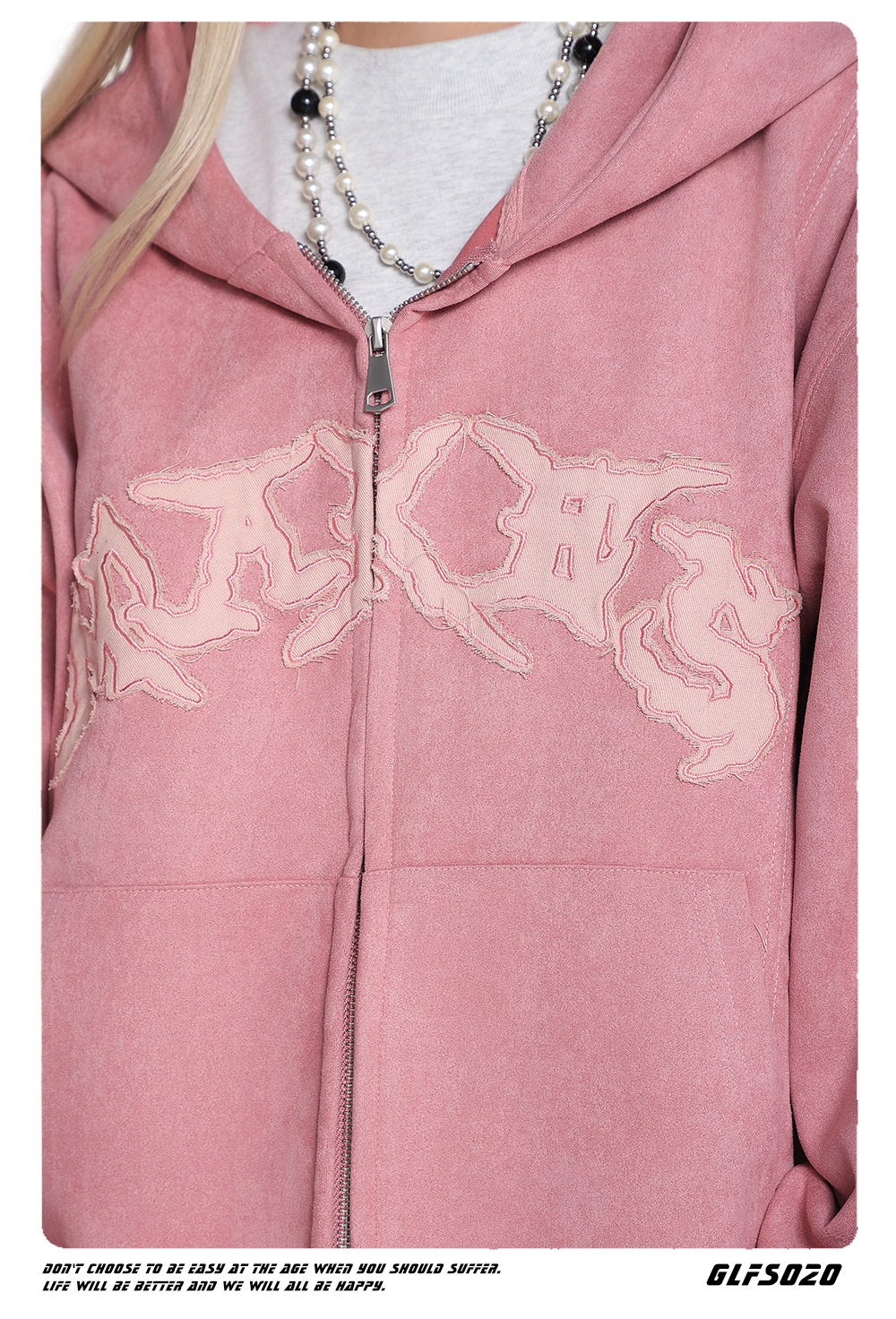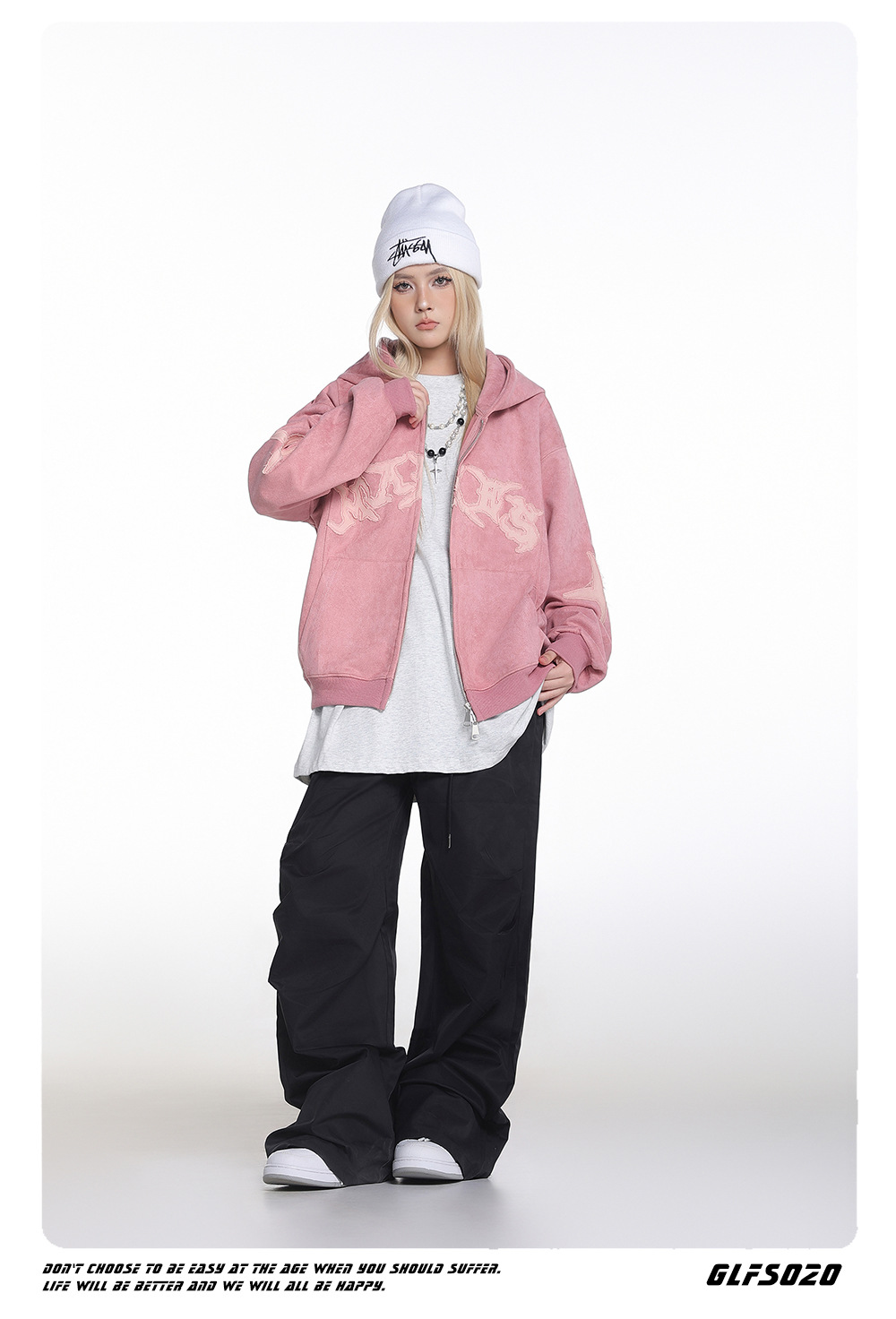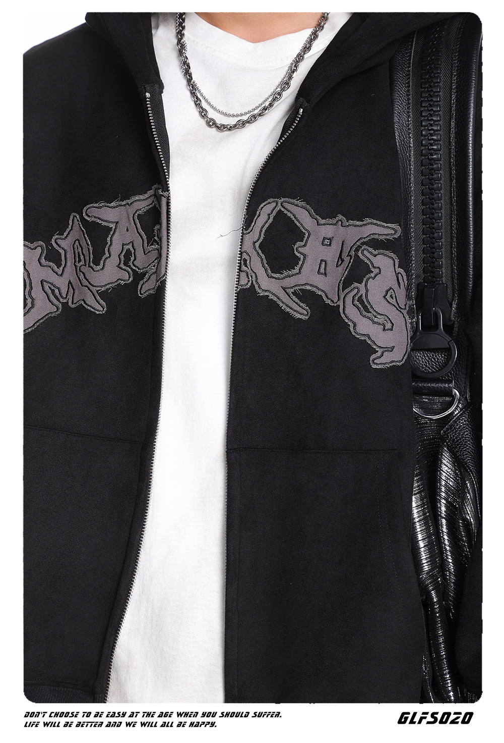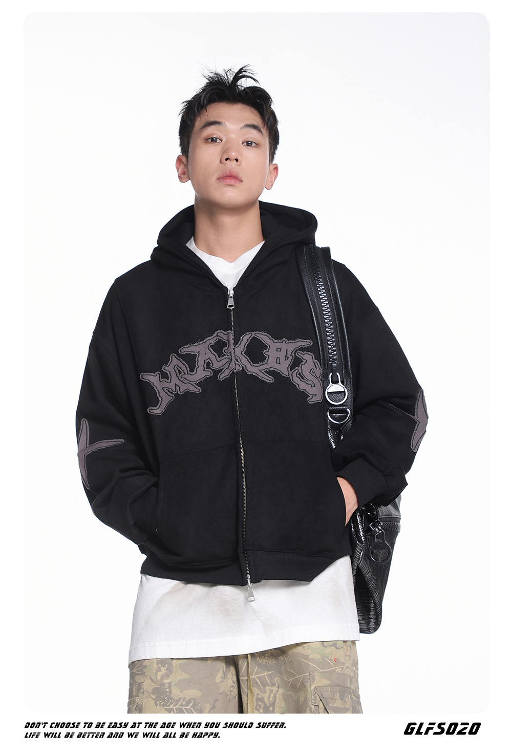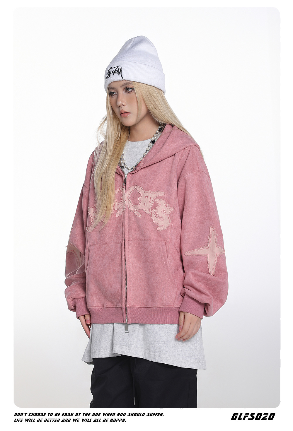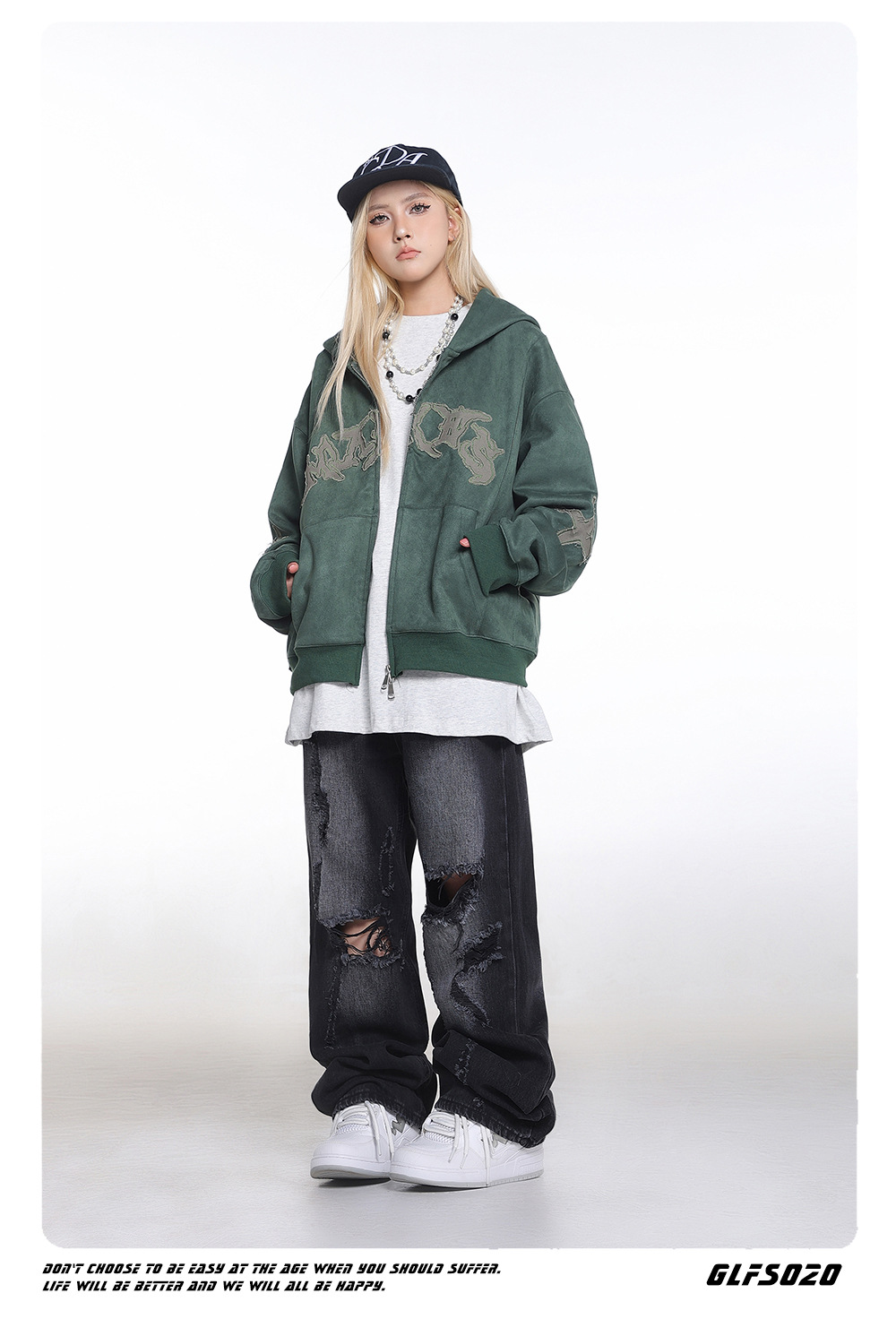GLFS2025 가을 남성과 여성의 느슨한 짧은 미국 문자 자수 스플 라이스 카디건 지퍼 스웨이드 스웨트 후드