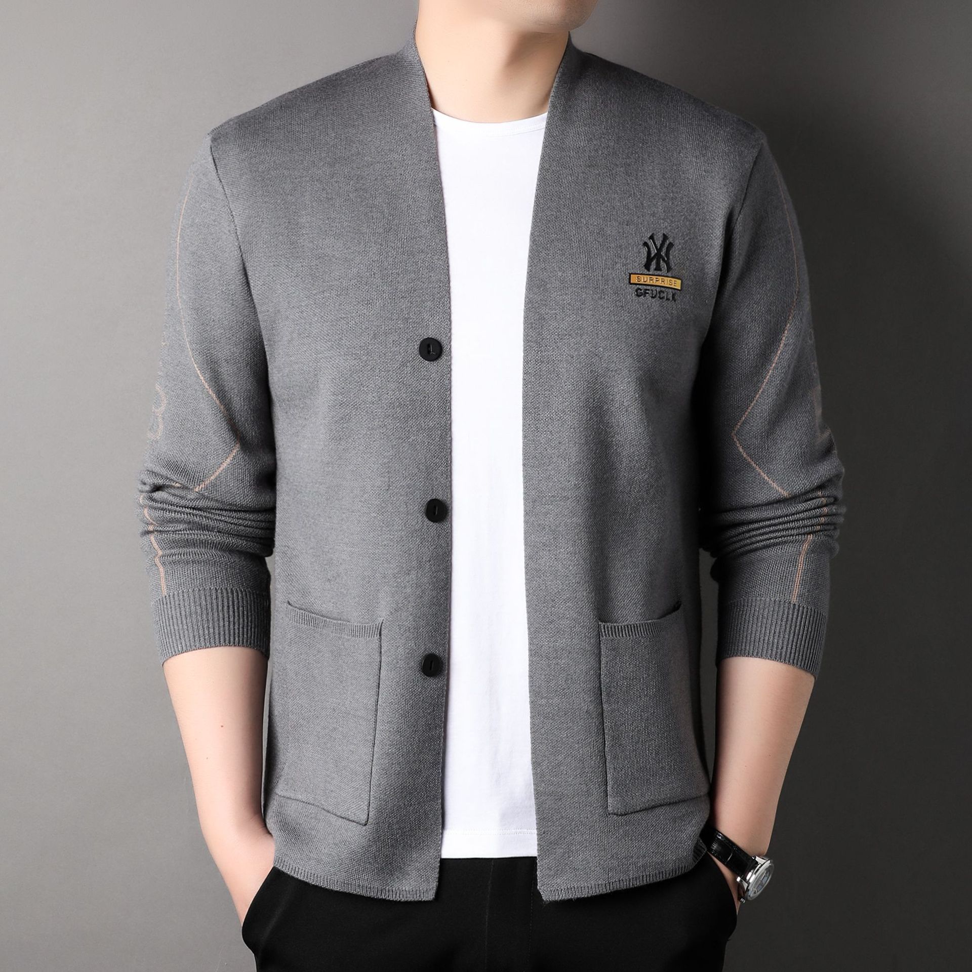 남자 가을 겨울 새 인쇄 리얼 포켓 3 버튼 니트 긴 소매 카디건 재킷 한국 캐주얼 올 매치 탑스토어 가기
