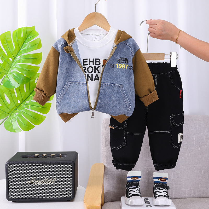 소년 가을 세트 2024 새로운 아동복 잘 생긴 소년 아기 봄과 가을 옷 3 피스 코트 조수스토어 가기