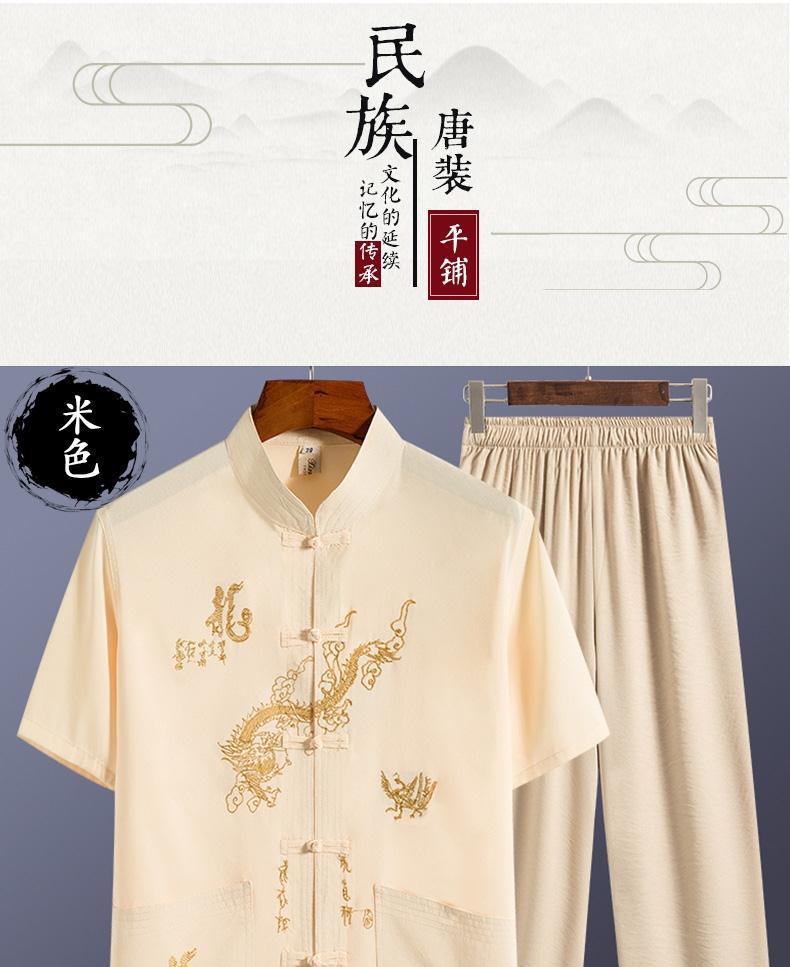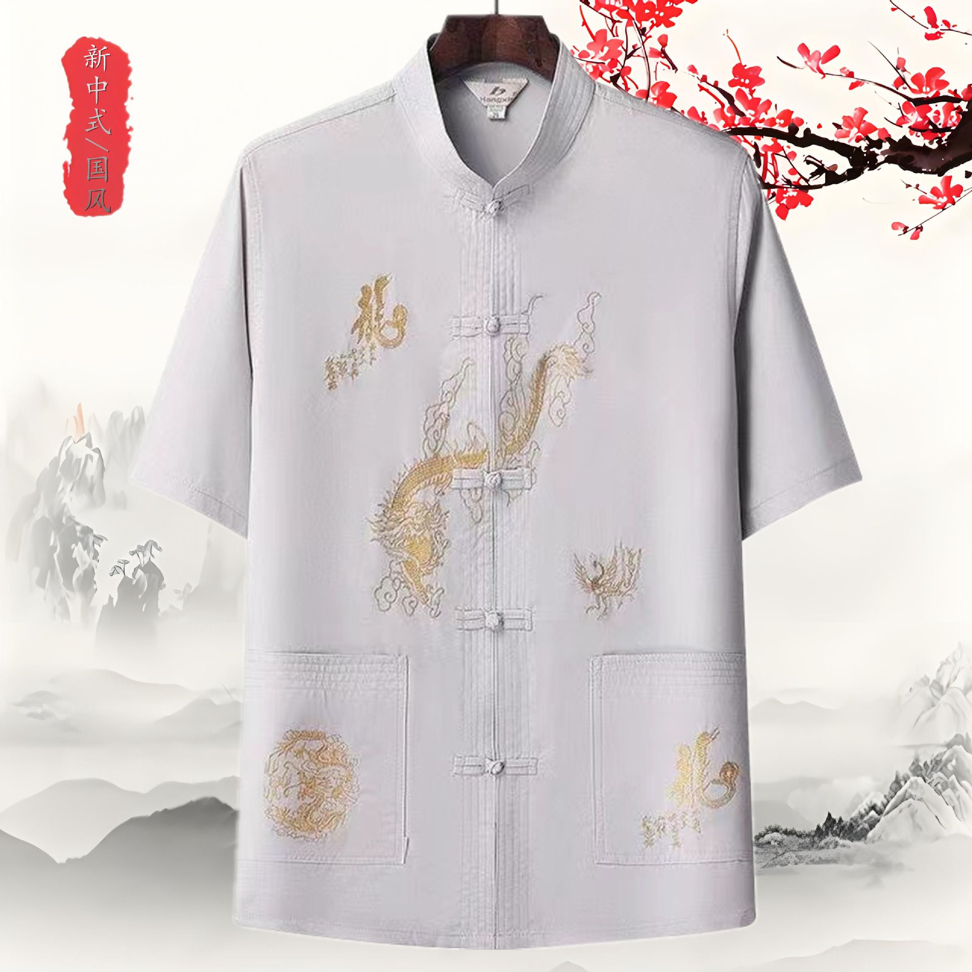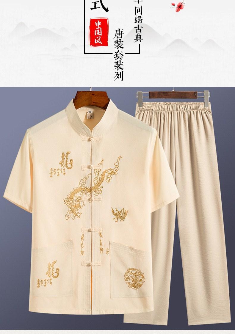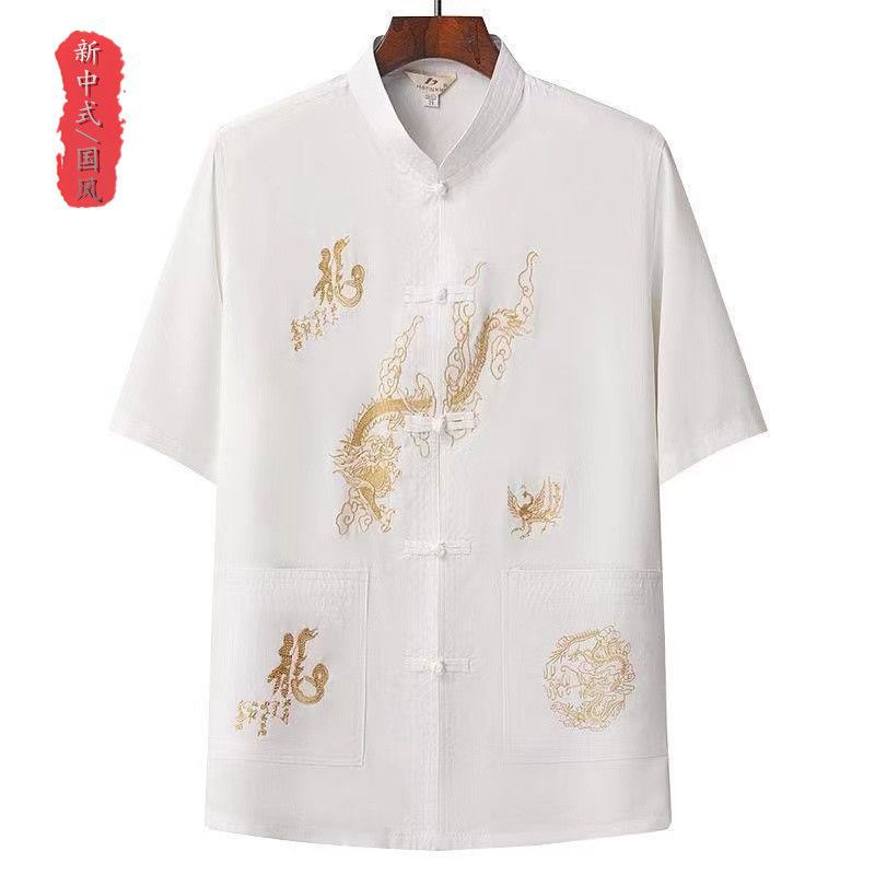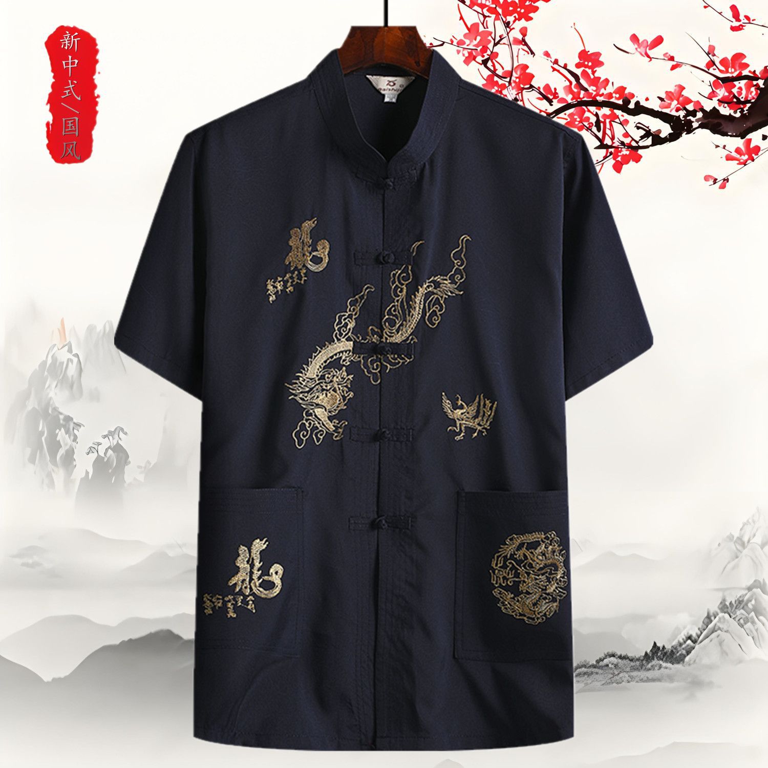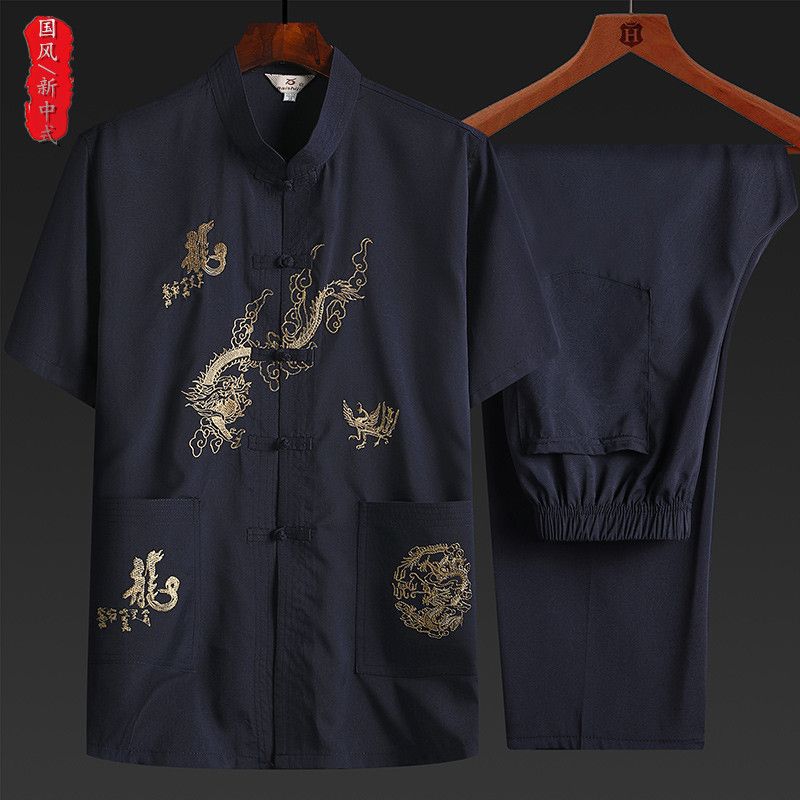새로운 중국 여름 중년 및 노인 당나라 원피스 남자 반팔 세트 중국 스타일 자수 드래곤 아빠 원피스 노인 할아버지 여름 원피스스토어 가기
