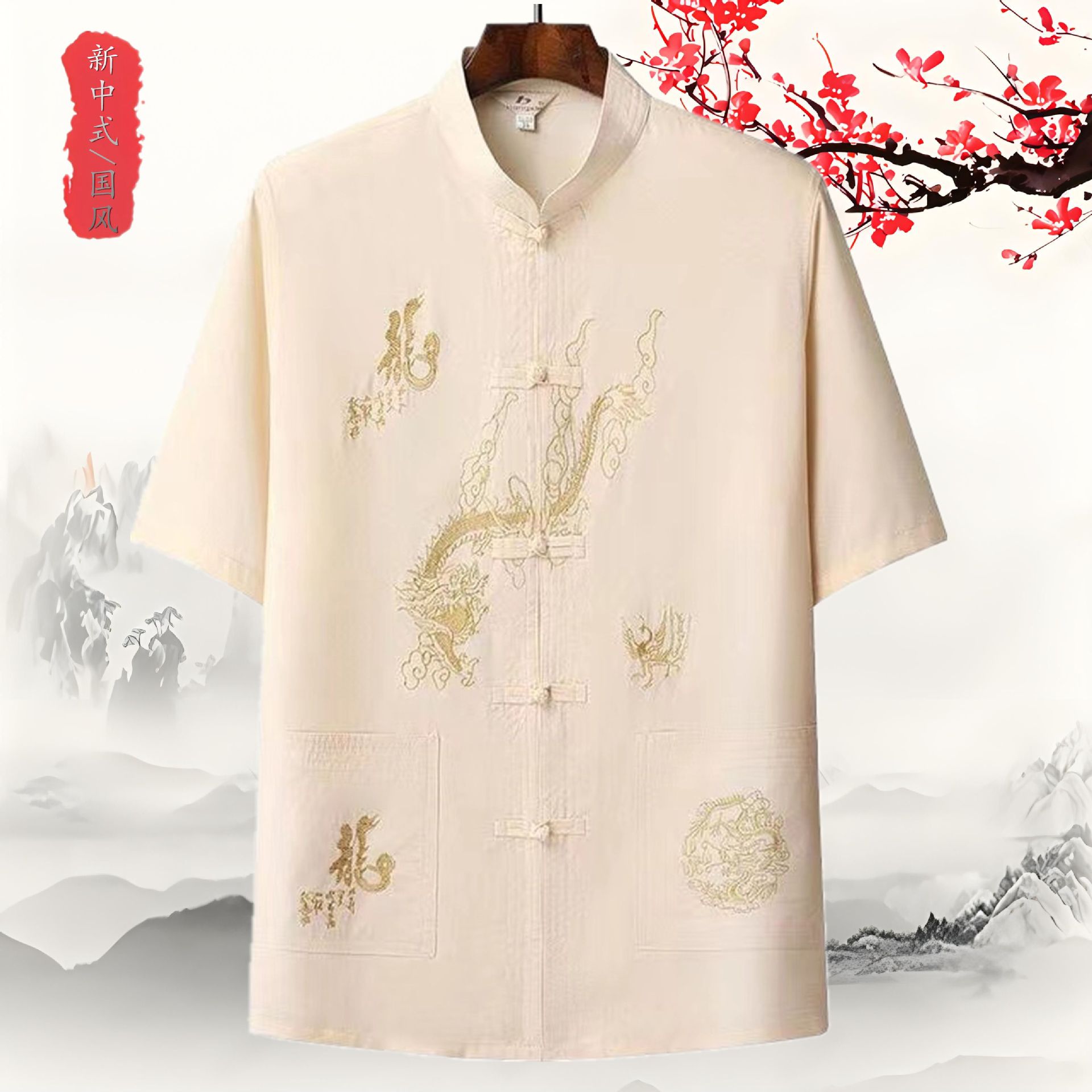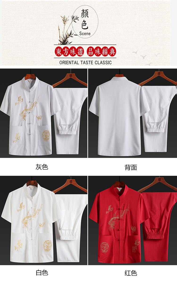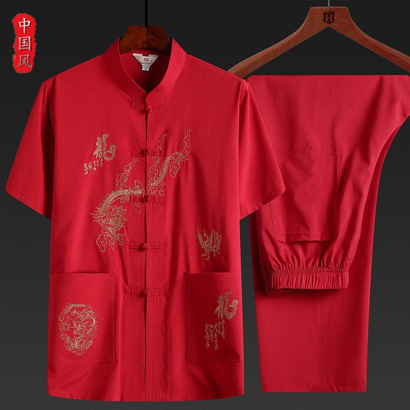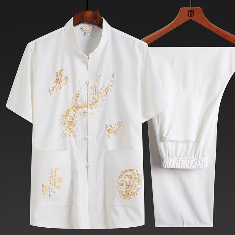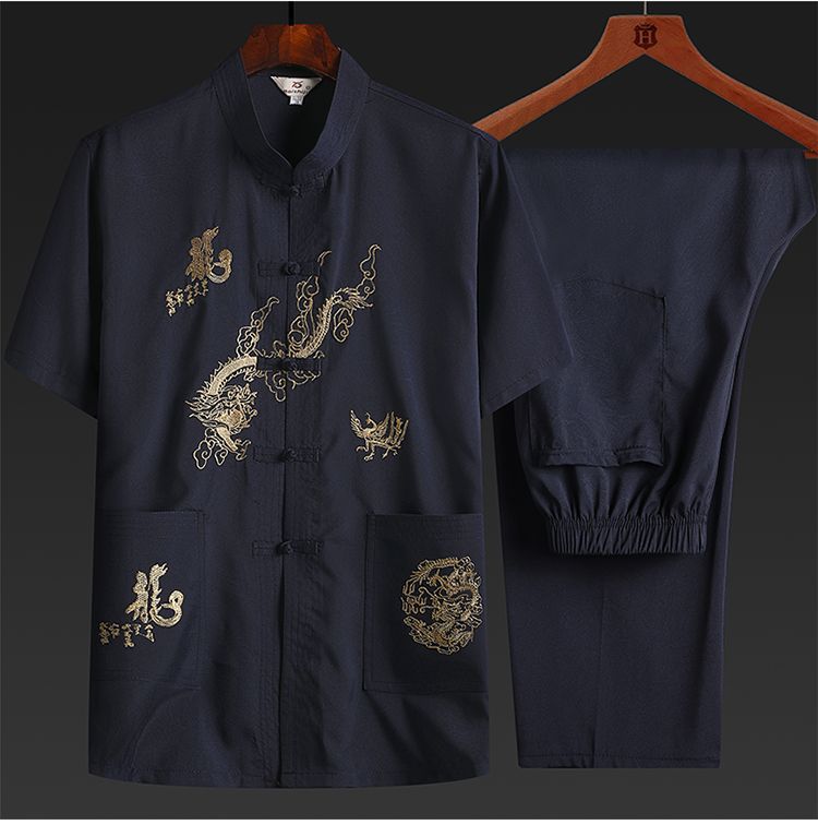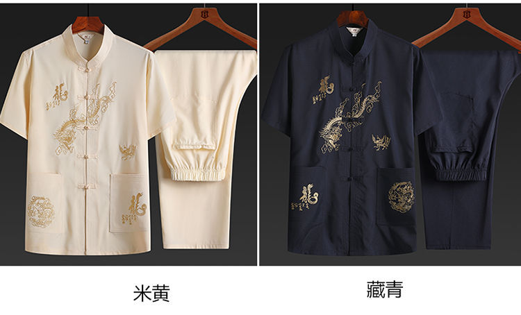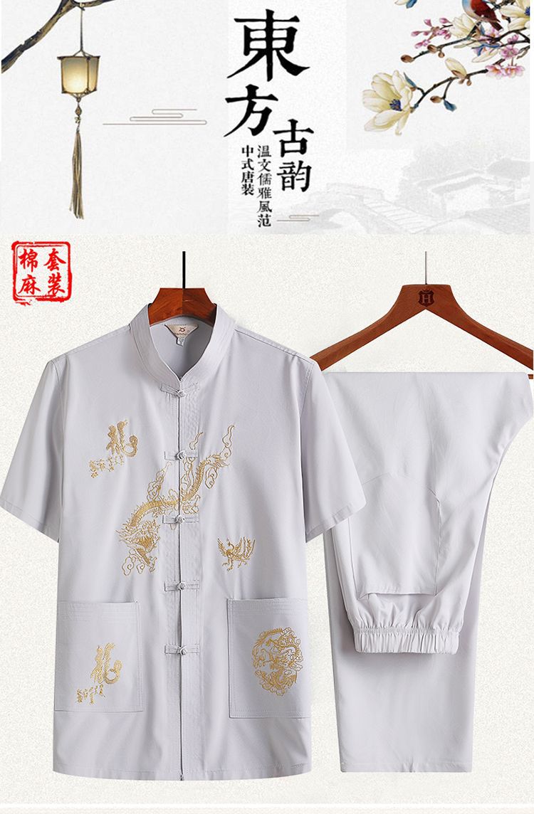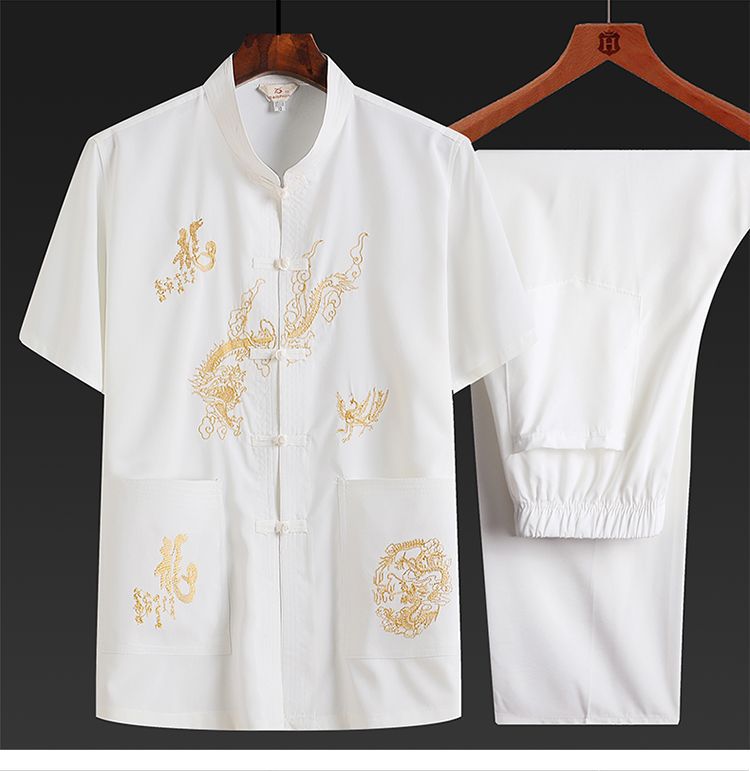 새로운 중국 여름 중년 및 노인 당나라 원피스 남자 반팔 세트 중국 스타일 자수 드래곤 아빠 원피스 노인 할아버지 여름 원피스스토어 가기