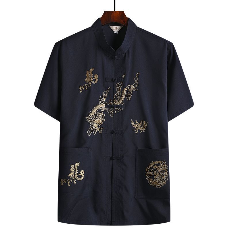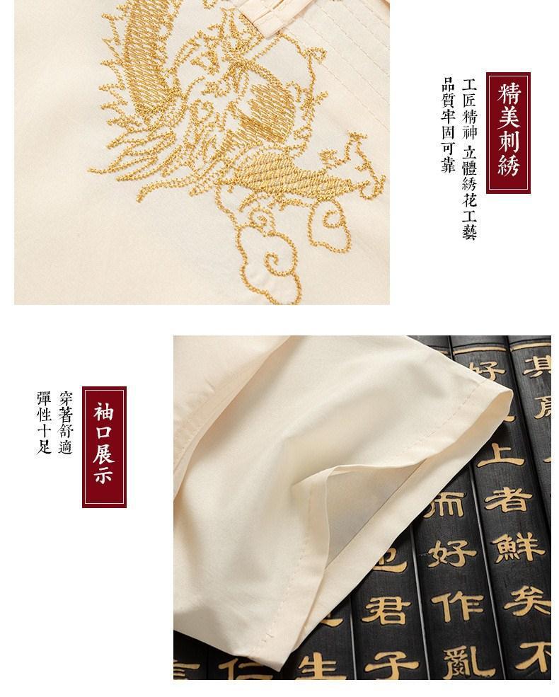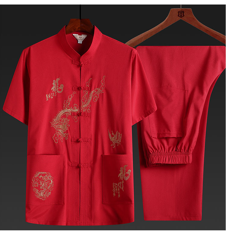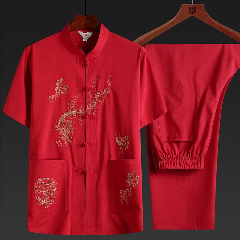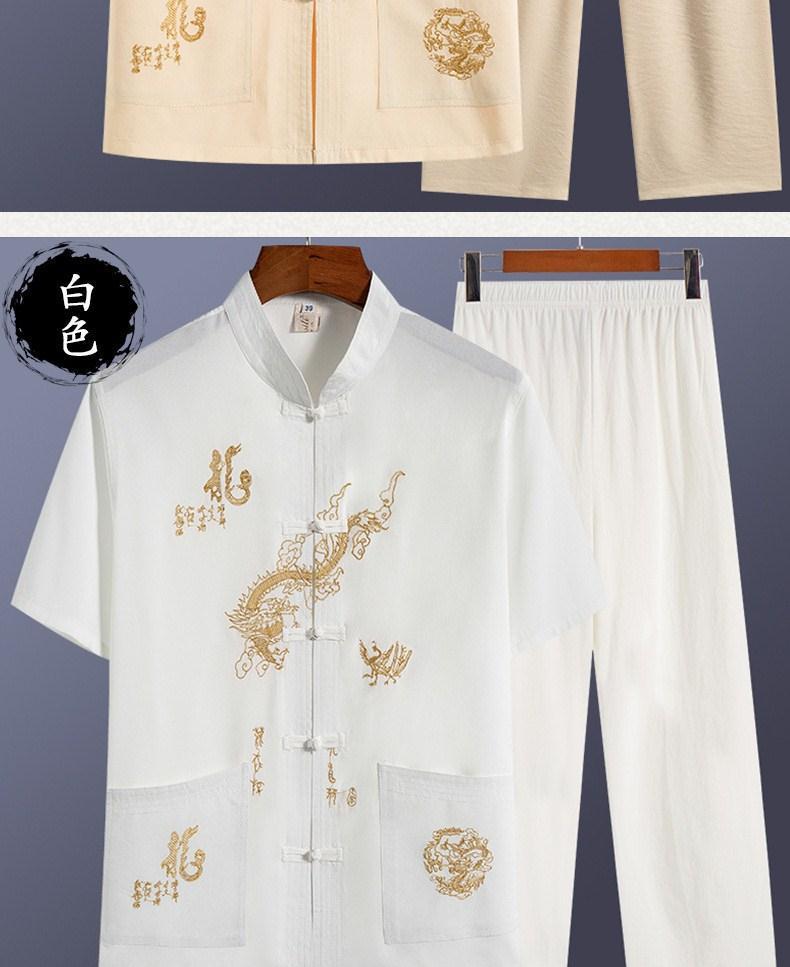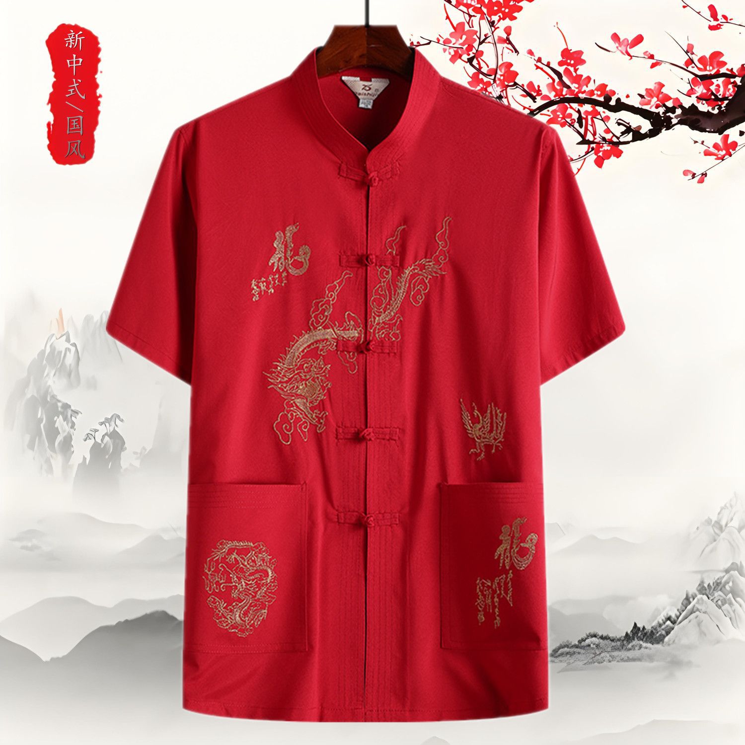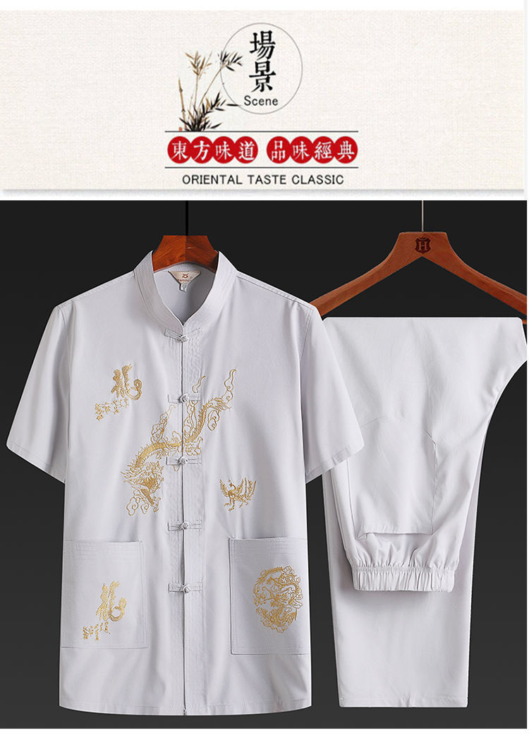 새로운 중국 여름 중년 및 노인 당나라 원피스 남자 반팔 세트 중국 스타일 자수 드래곤 아빠 원피스 노인 할아버지 여름 원피스스토어 가기