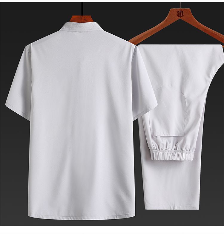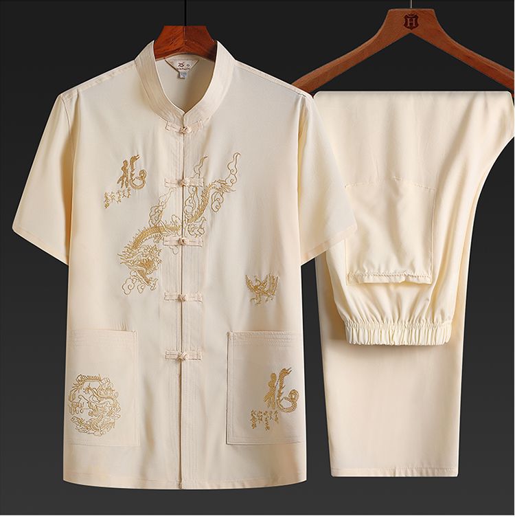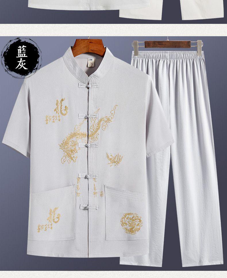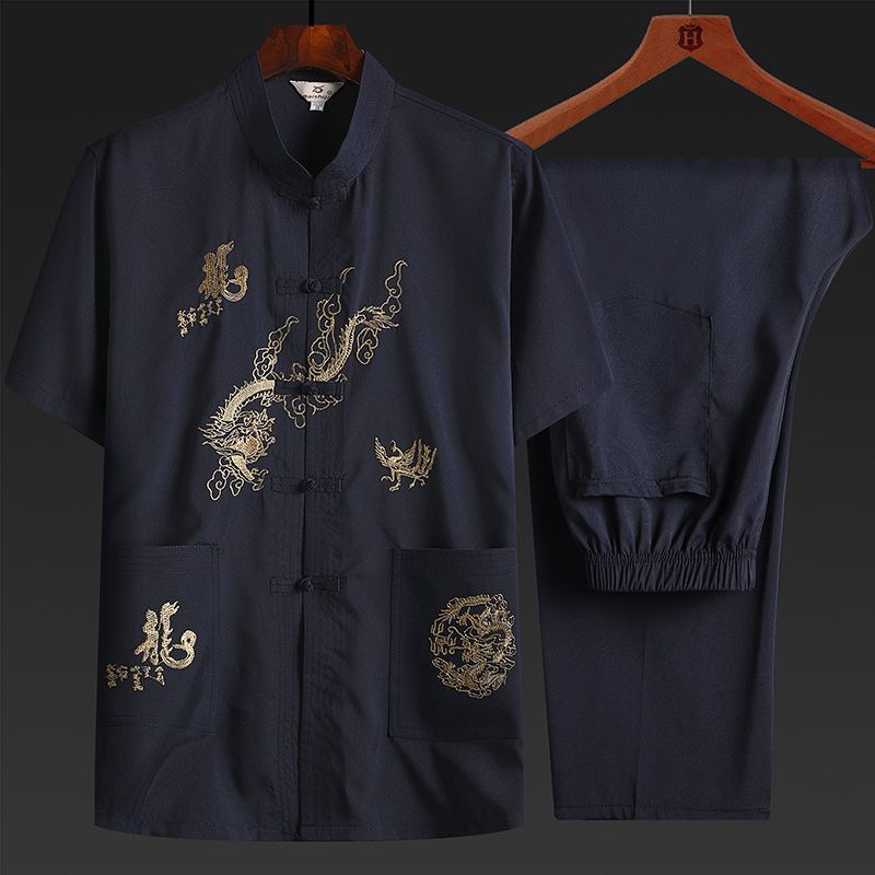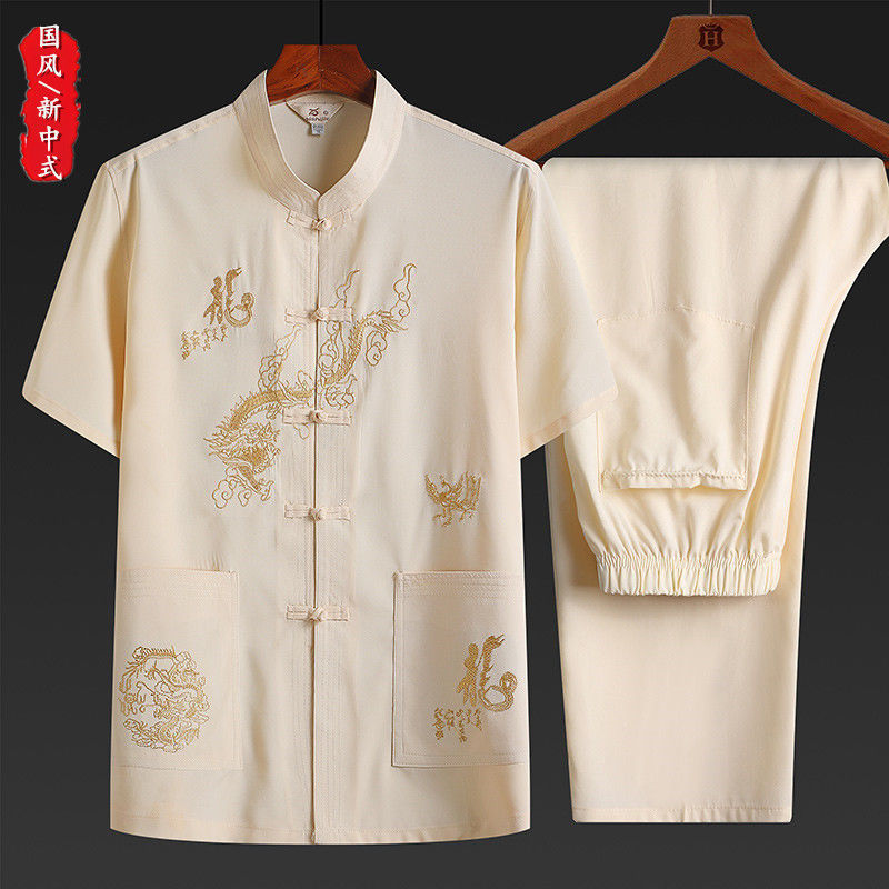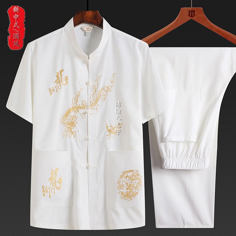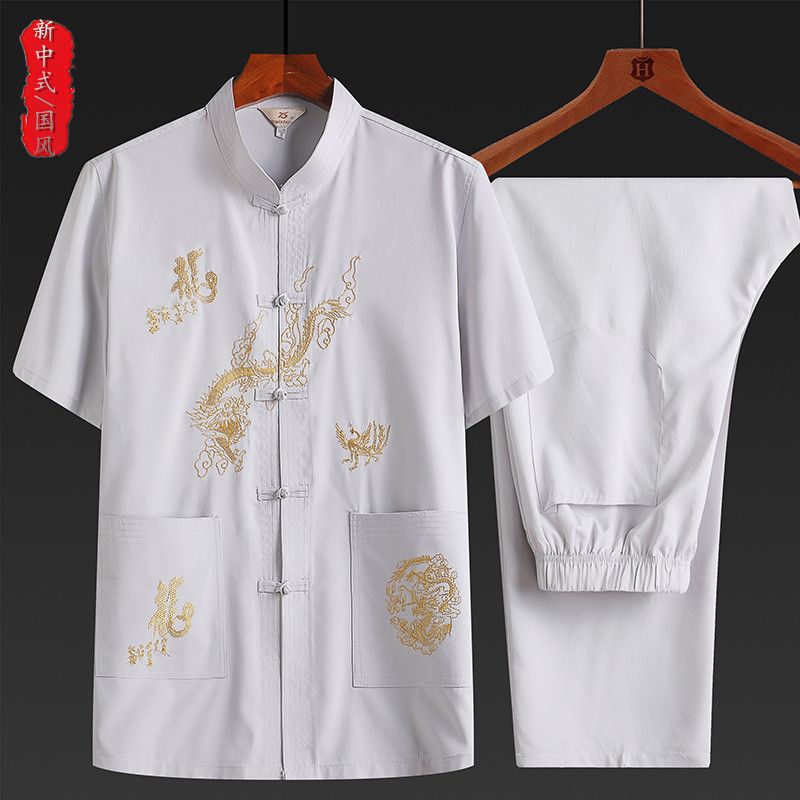 새로운 중국 여름 중년 및 노인 당나라 원피스 남자 반팔 세트 중국 스타일 자수 드래곤 아빠 원피스 노인 할아버지 여름 원피스