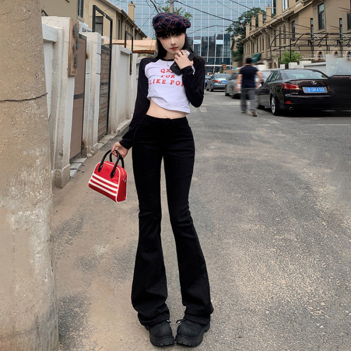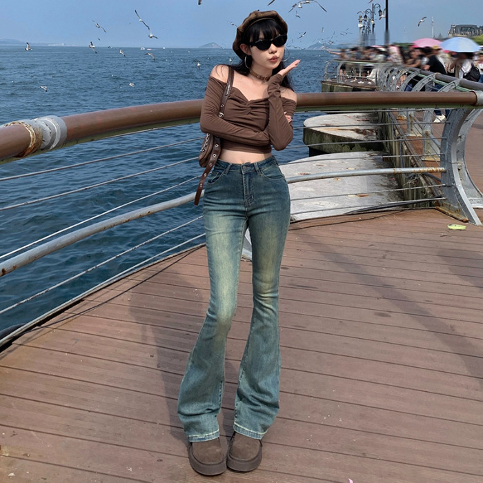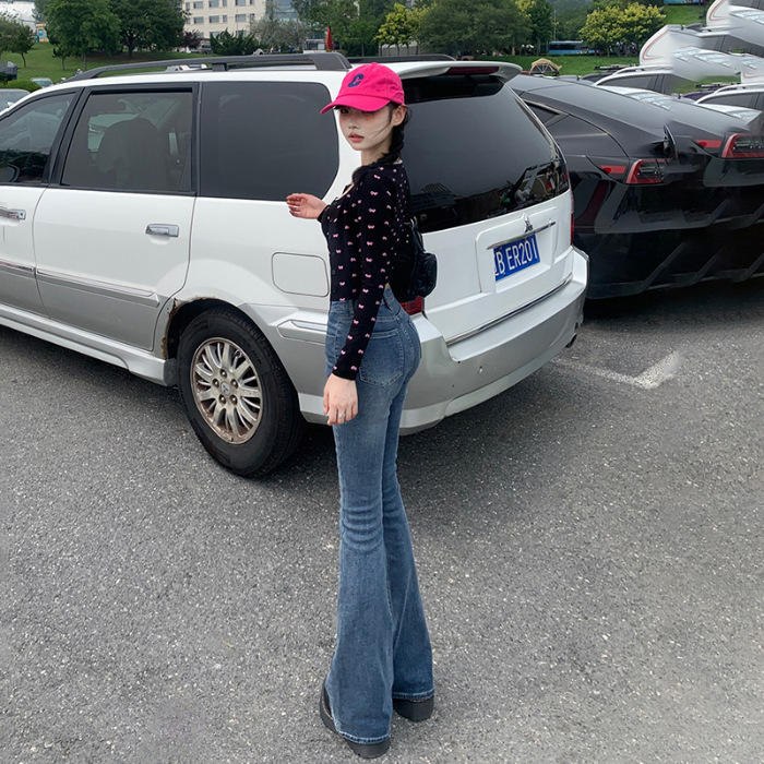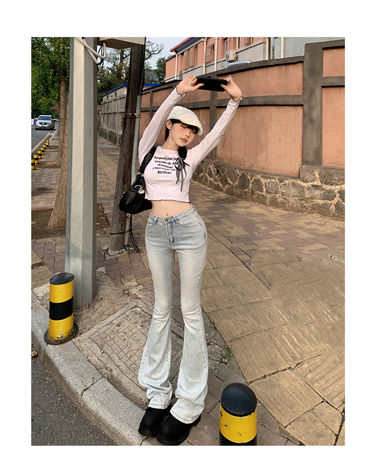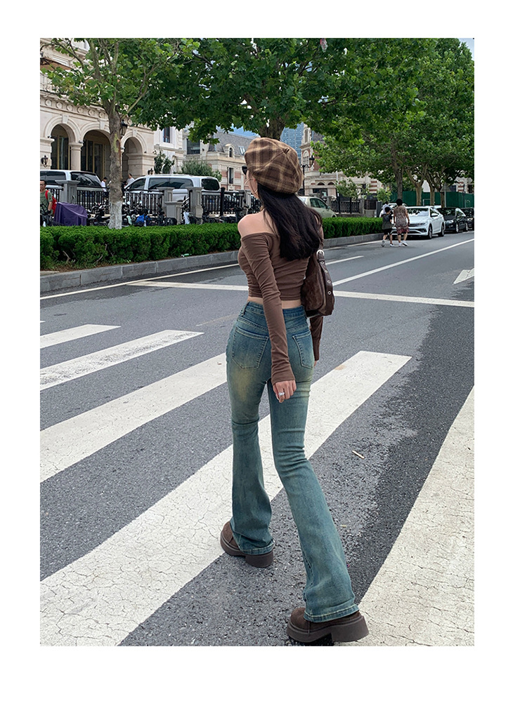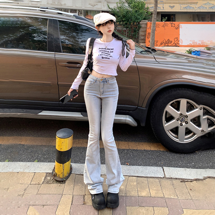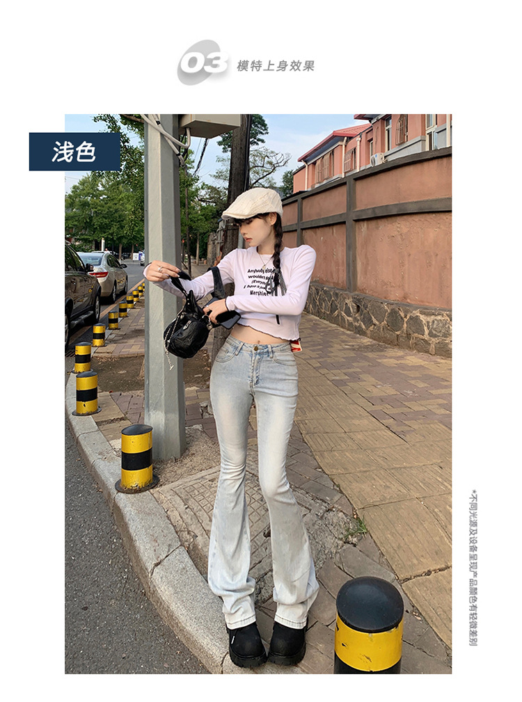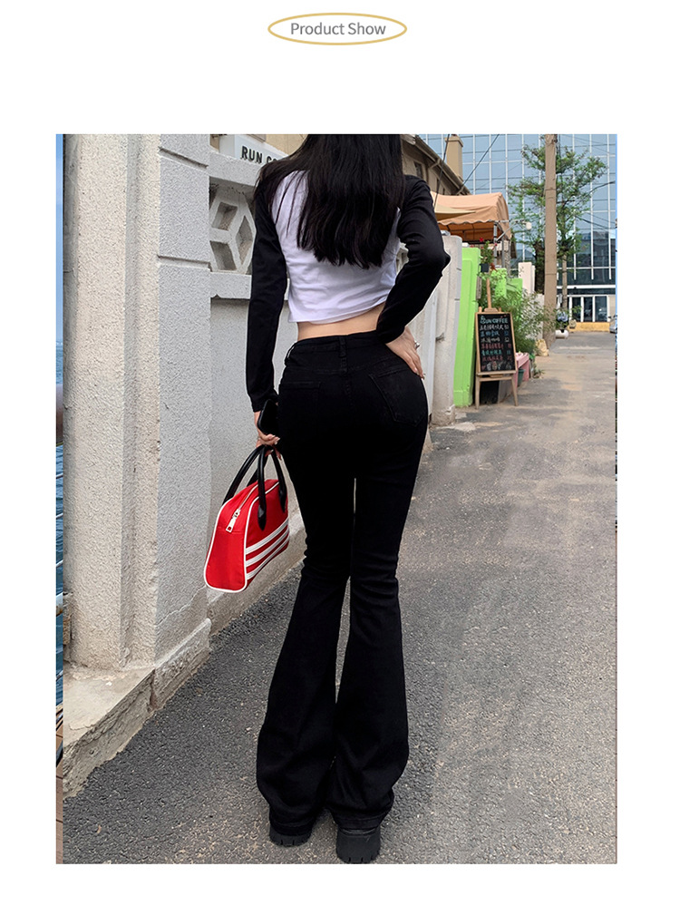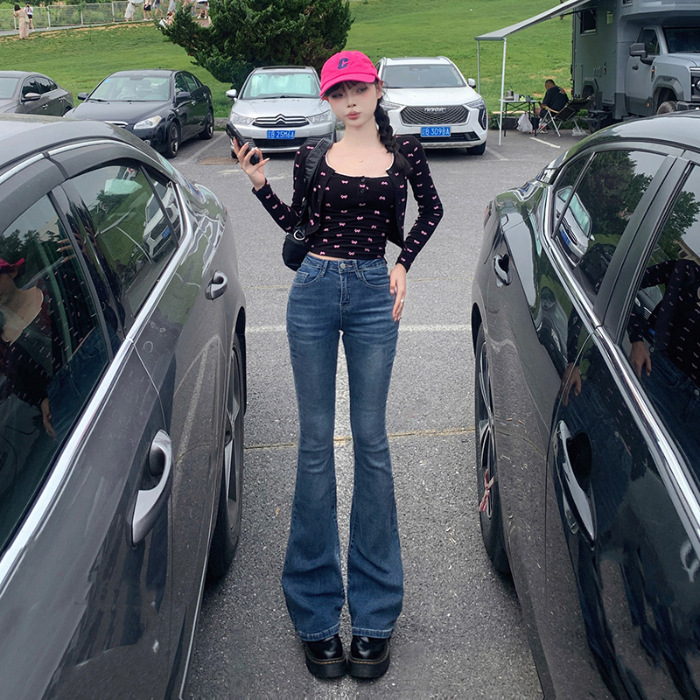 미국 빈티지 마이크로 라르 청바지 가을 높은 허리 슬리밍 슬림 핫 걸 플레어 팬츠 여성용 정사이즈 세탁스토어 가기
