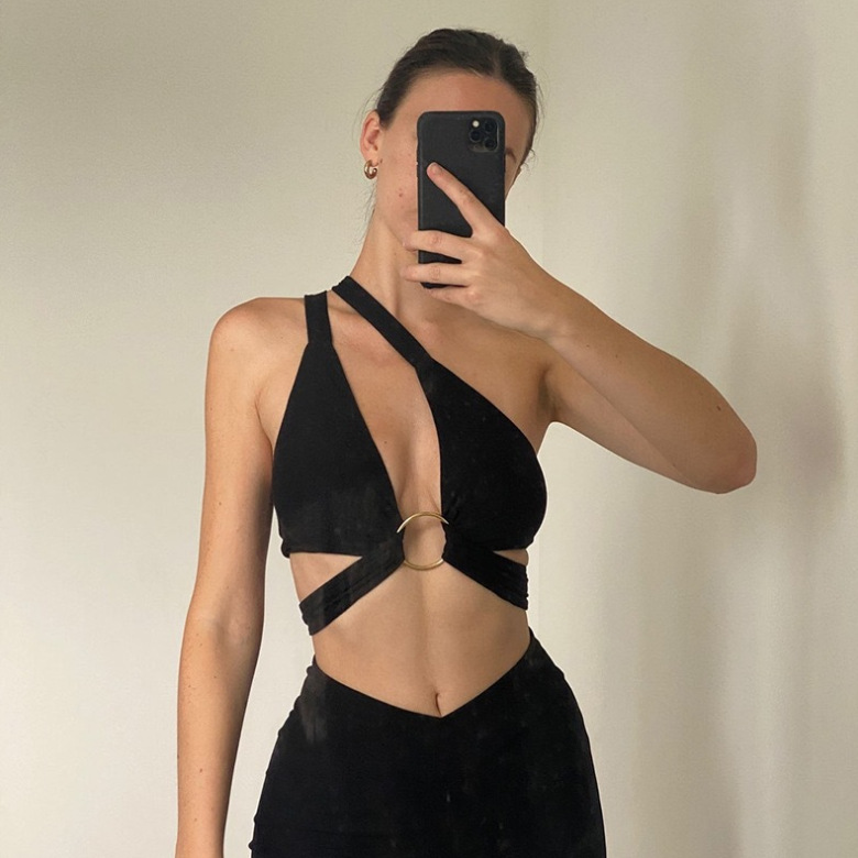 2023 년 여름 섹시한 유럽과 미국의 패션 단색 스트랩 작은 조끼 만료 된 허리와 배꼽 교수형 목 착용