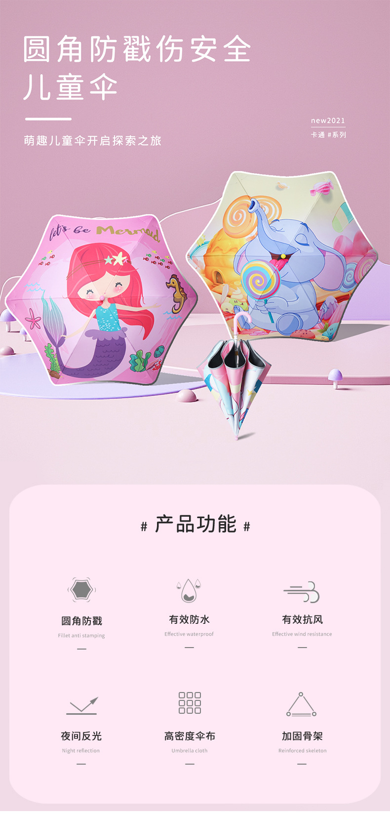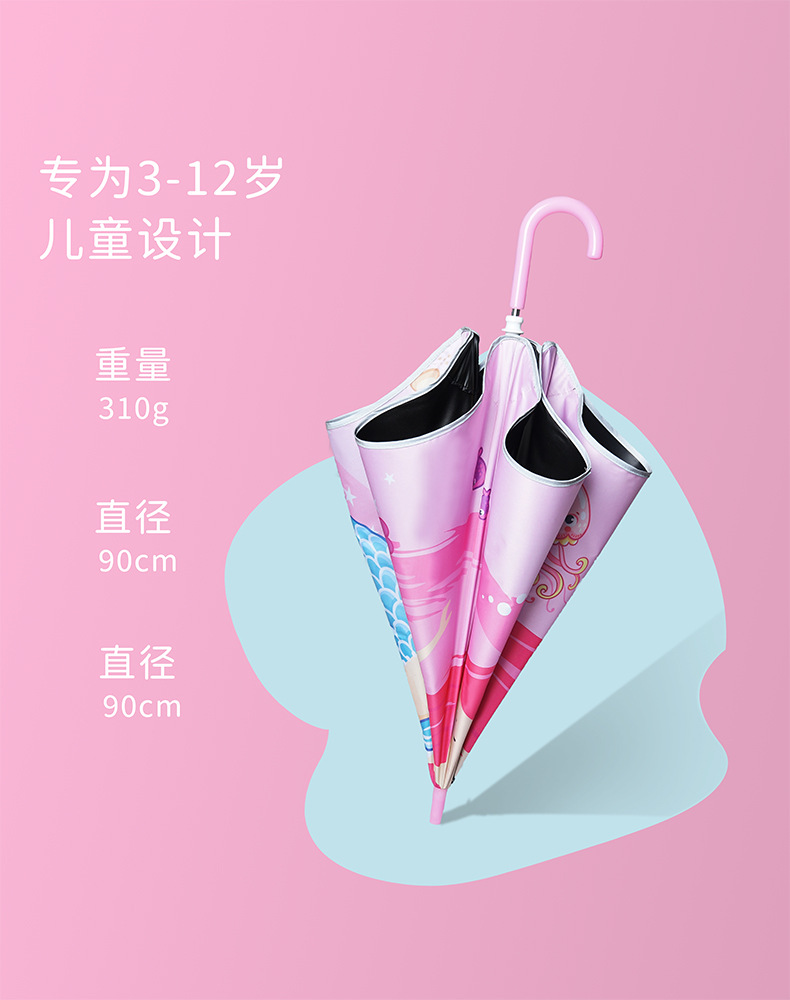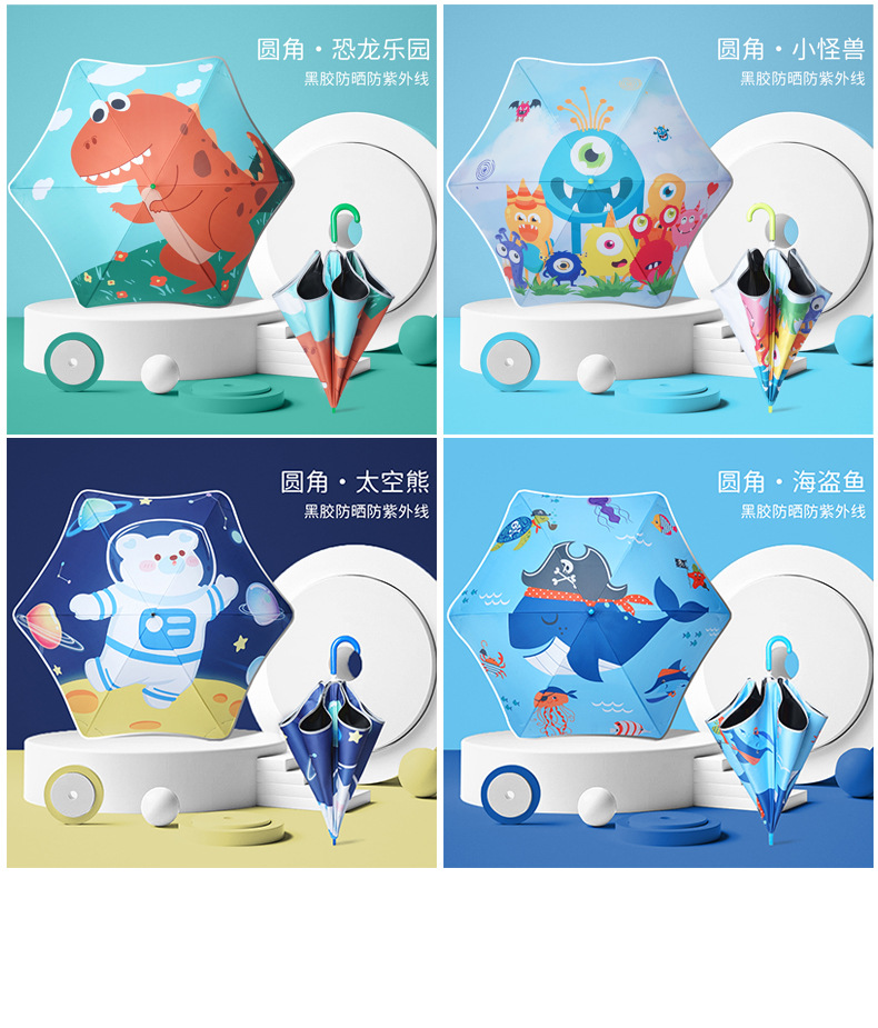 둥근 모서리가 있는 어린이용 우산, 만화 캐릭터가 있는 블랙 글로시 차양 우산, 반사 스트립이 있는 비/햇빛 겸용 안전 만화 우산스토어 가기