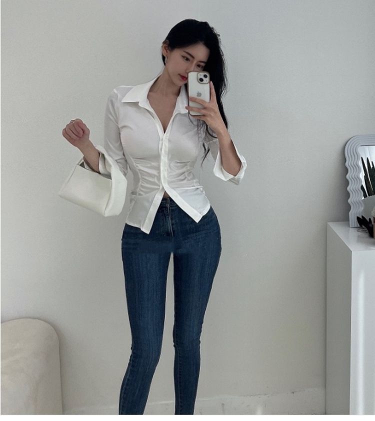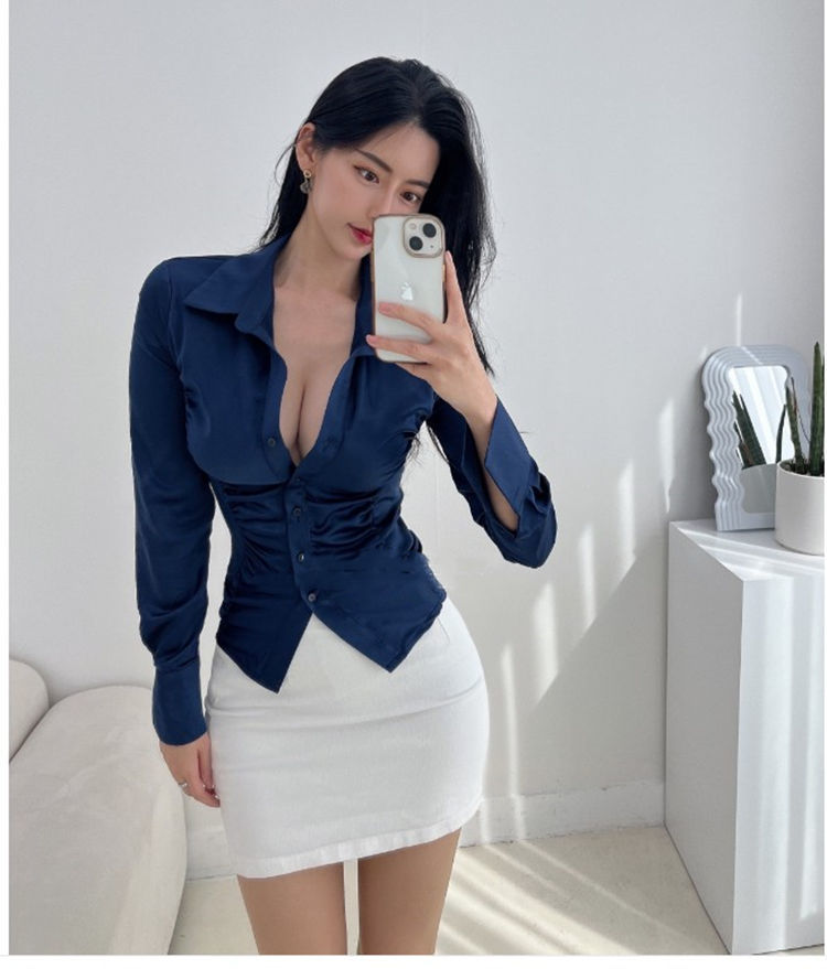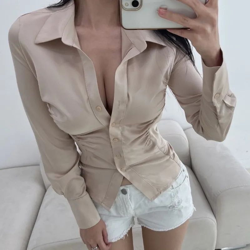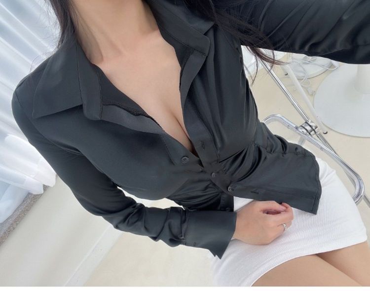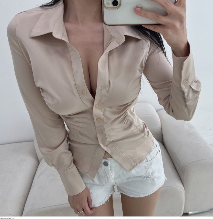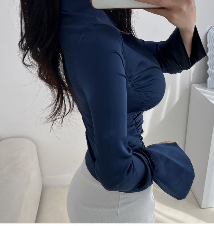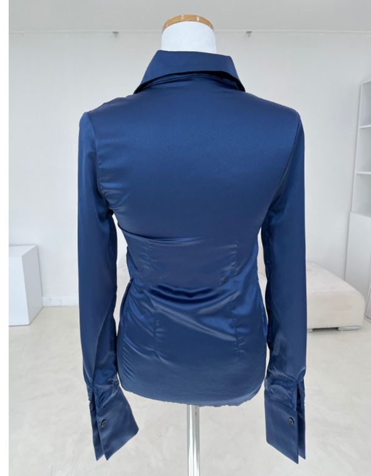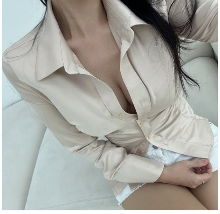 봄과 가을 새로운 한국식 우아한 프랑스 스타일 새틴 캐주얼 홍콩 스타일 슬림핏 슬리밍 여성용 긴팔 셔츠