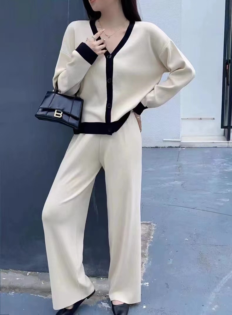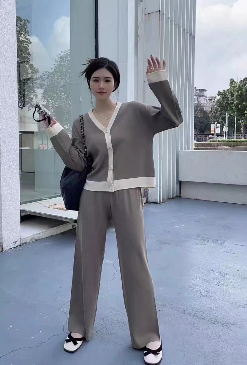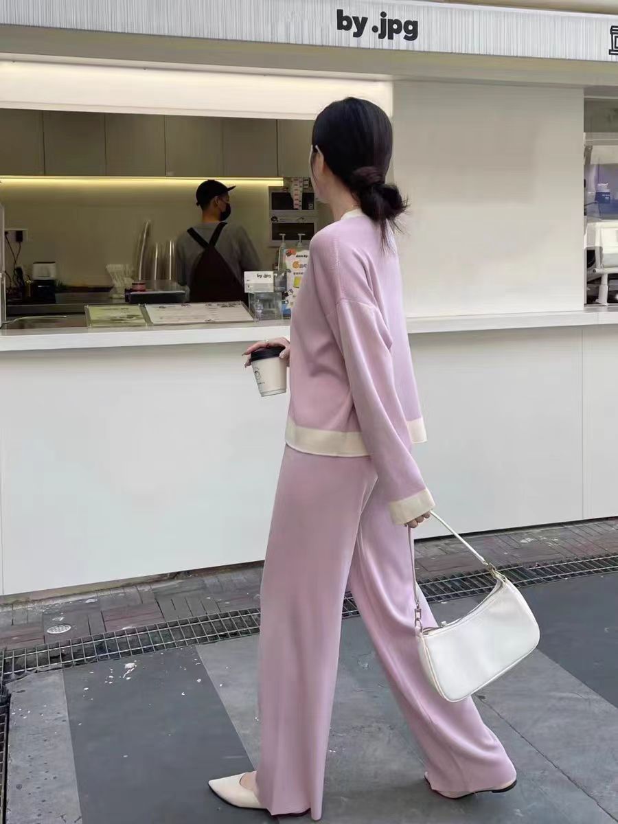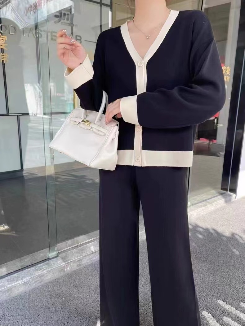 패션 세트 여성의 2024 새로운 스티칭 V 넥 긴 소매 니트 카디건 탑 + 캐주얼 와이드 레그 바지 투피스 세트스토어 가기