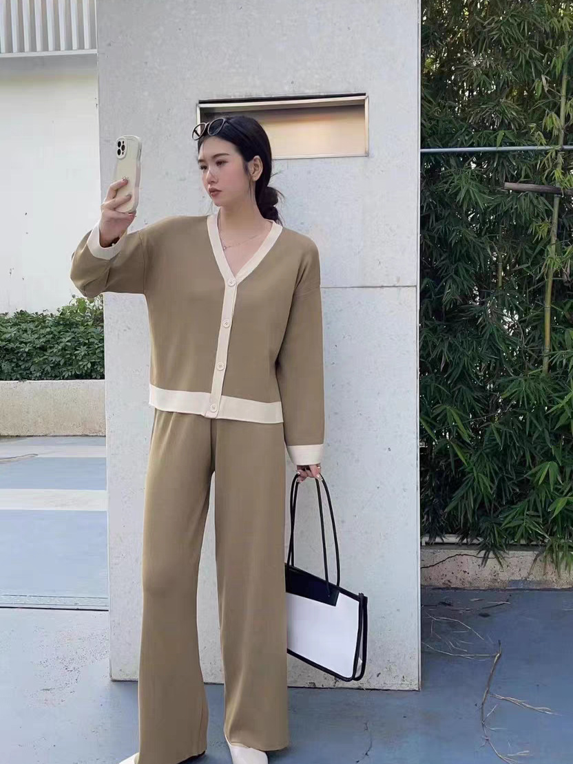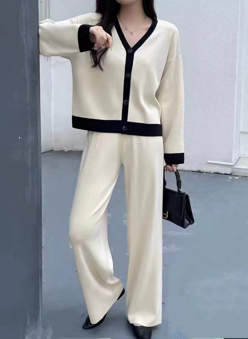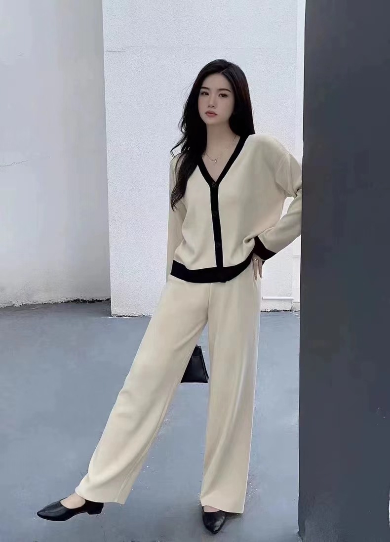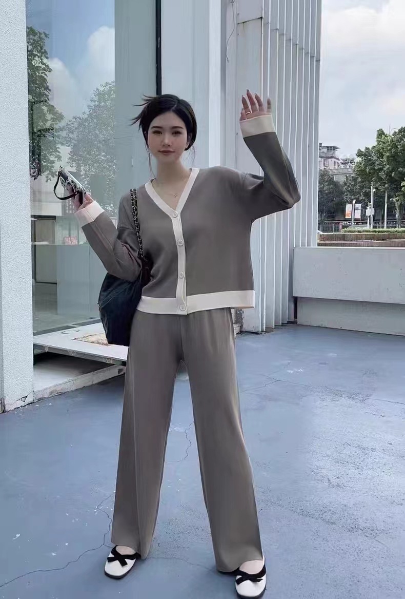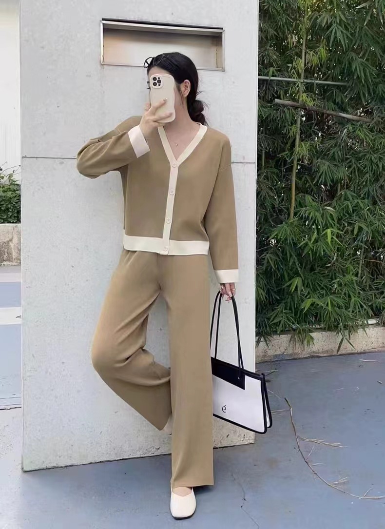 패션 세트 여성의 2024 새로운 스티칭 V 넥 긴 소매 니트 카디건 탑 + 캐주얼 와이드 레그 바지 투피스 세트스토어 가기