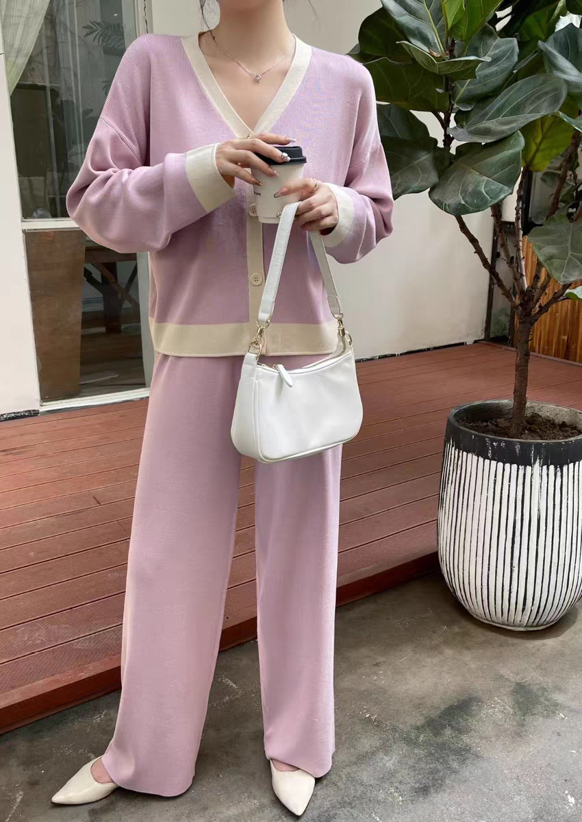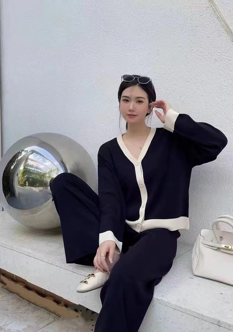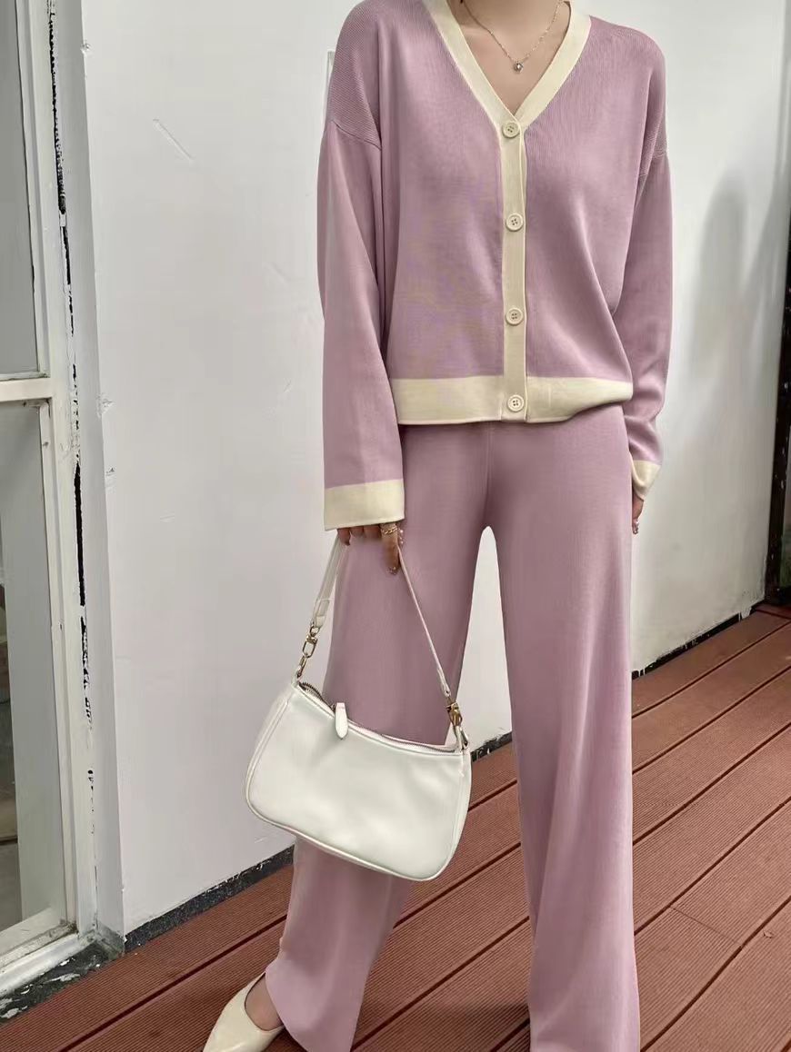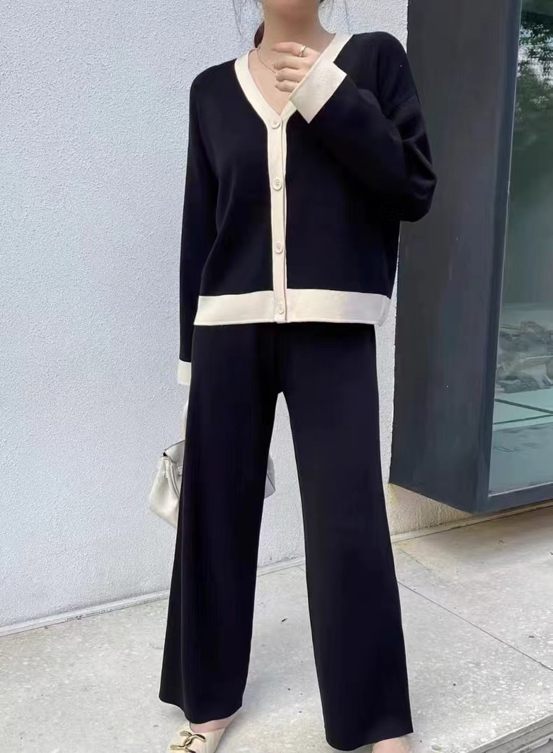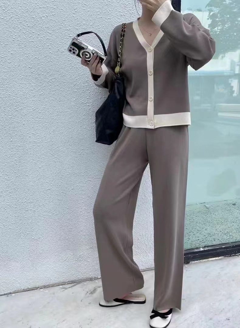 패션 세트 여성의 2024 새로운 스티칭 V 넥 긴 소매 니트 카디건 탑 + 캐주얼 와이드 레그 바지 투피스 세트