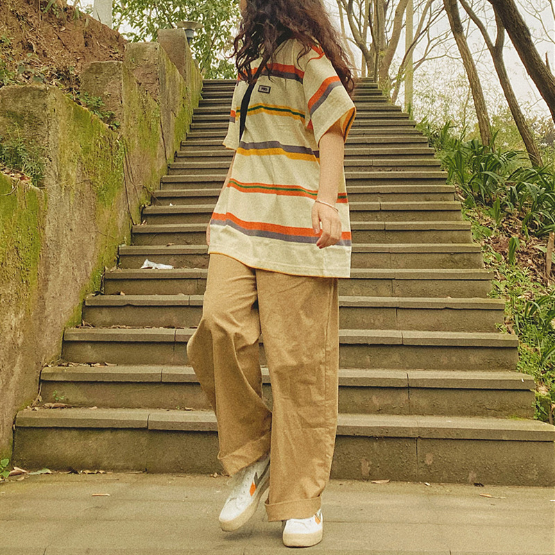 트렌디 한 Ins 일본 스타일 빈티지 캐주얼 바지 Bf 느슨한 넓은 다리 스트레이트 바지 2024 가을 작업 바지 단색 여성스토어 가기