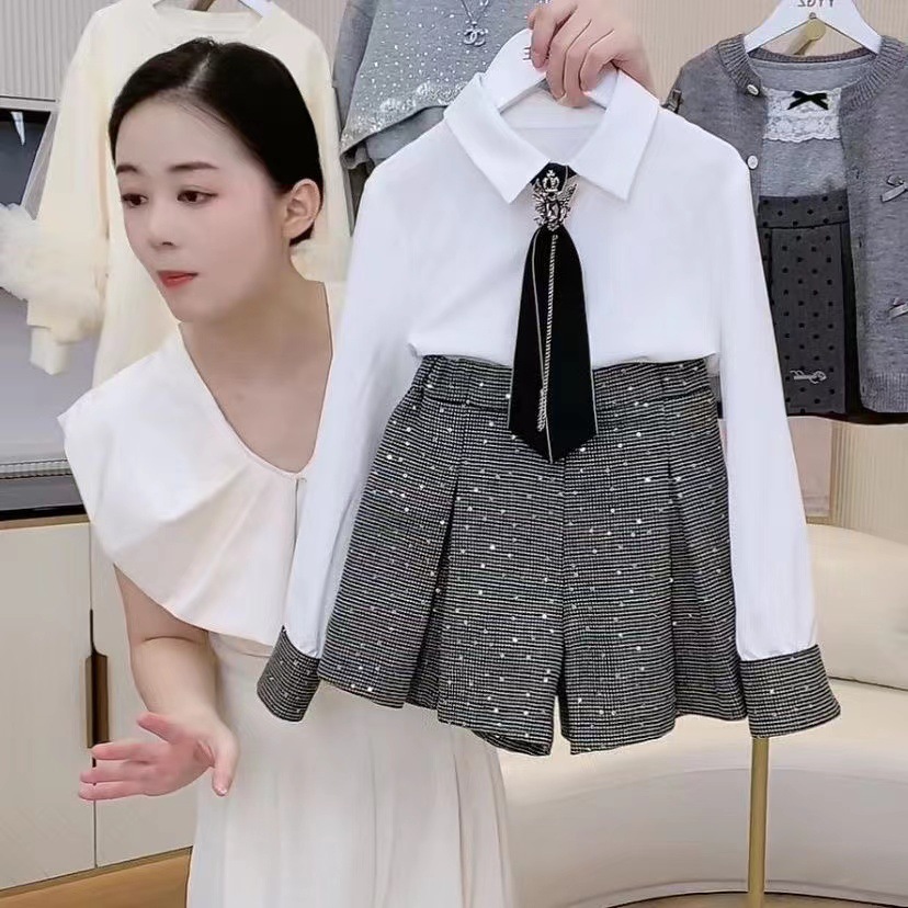 여자 가을 세트 2024 새로운 소녀 세련된 봄과 가을 유행 셔츠 어린이 조끼 짧은 바지 투피스 세트스토어 가기