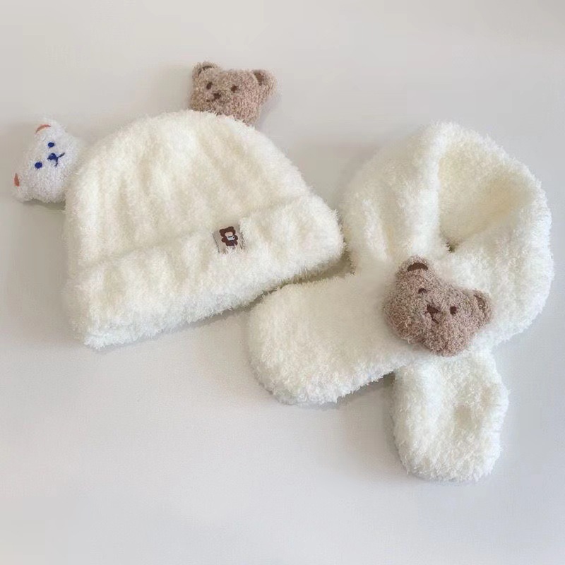 고급 감각 작은 곰 봉제 아기 모자 가을과 겨울 스카프 한 두 조각 세트 어린이 따뜻한 귀 보호 캡 슈퍼 귀여운스토어 가기