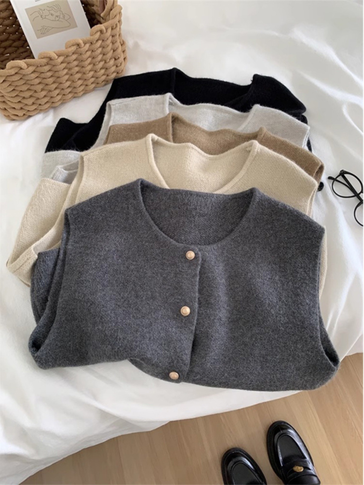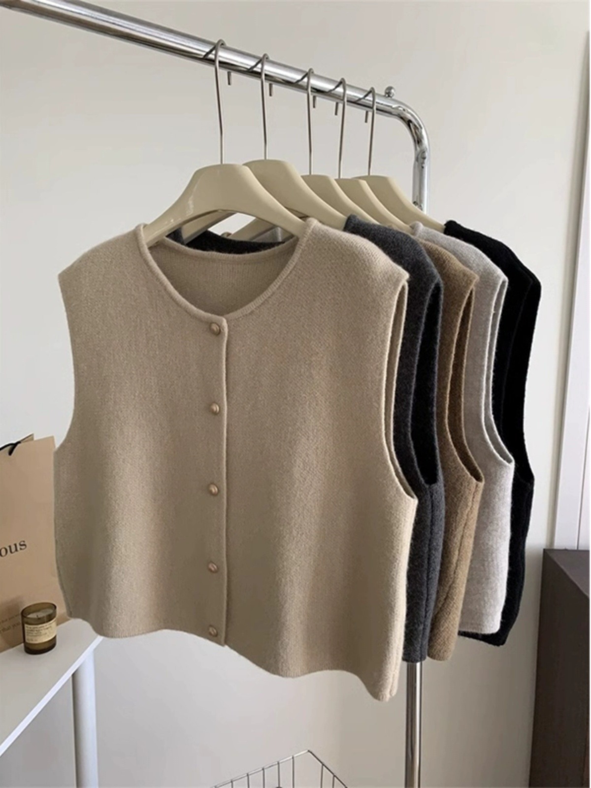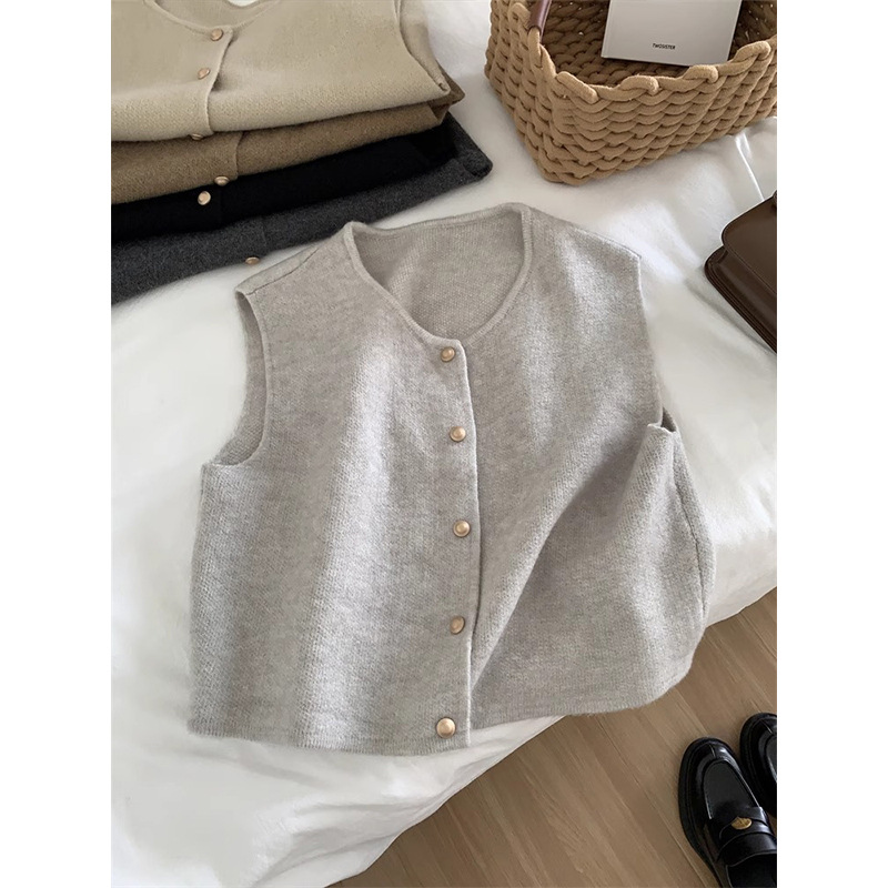프랑스 스타일 레트로 작은 골드 버튼 라운드 넥 니트 조끼 여자 느슨한 한국 스타일 올매치 부드러운 슬리밍 가을과 겨울 스태킹 스웨터