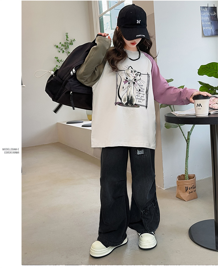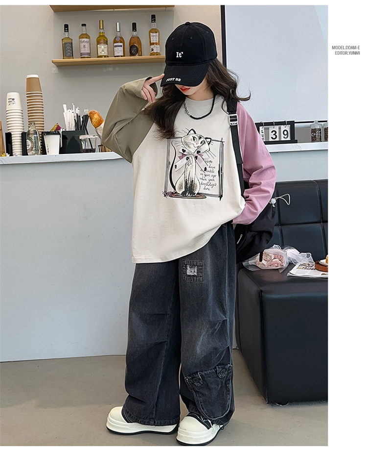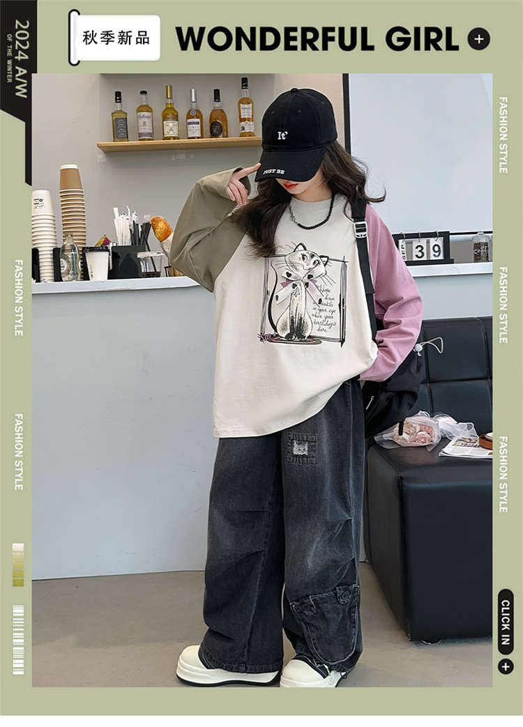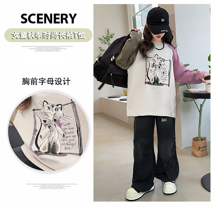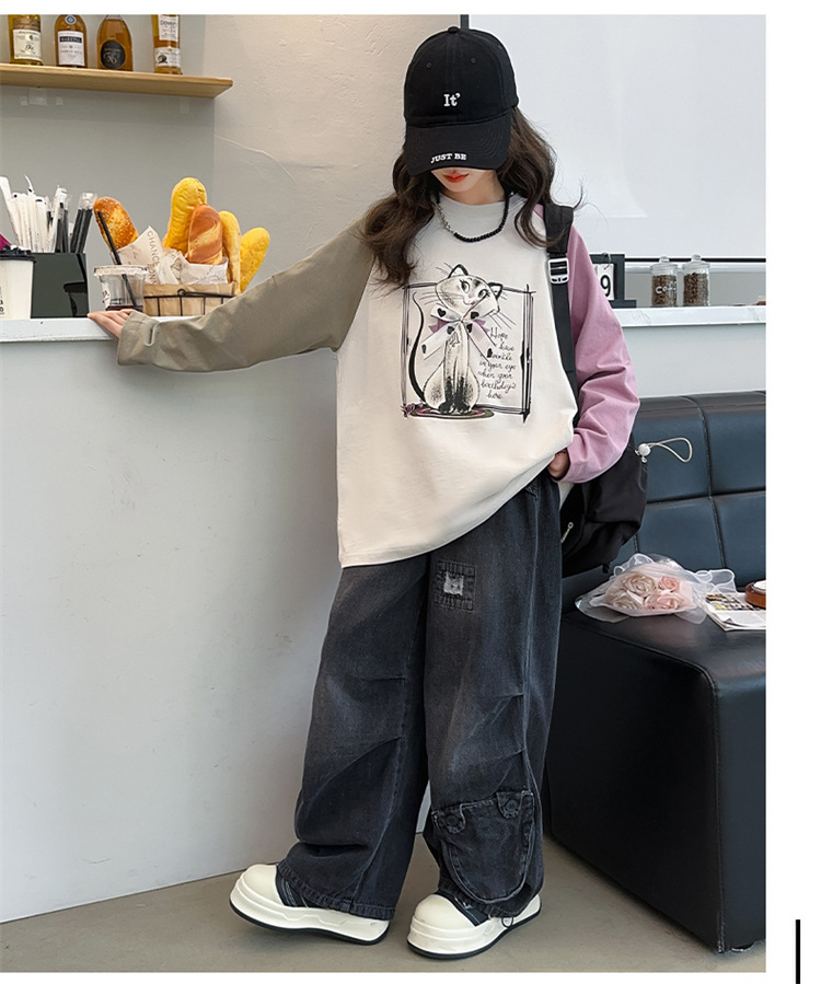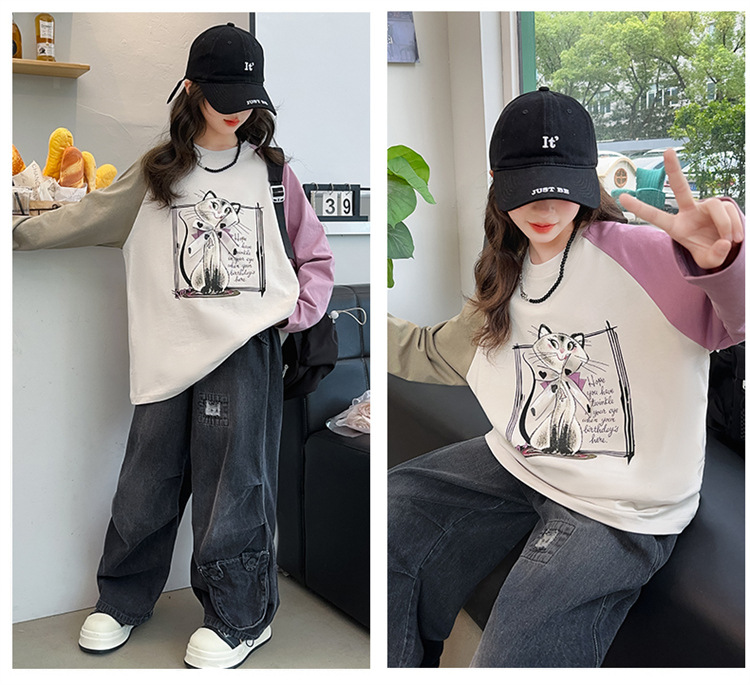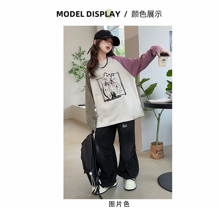 소녀의 봄과 가을베이스 셔츠 2024 새로운 세련된 어린이 패션 트렌디 화려한 컬러 애니메이션 프린트 투피스 세트스토어 가기