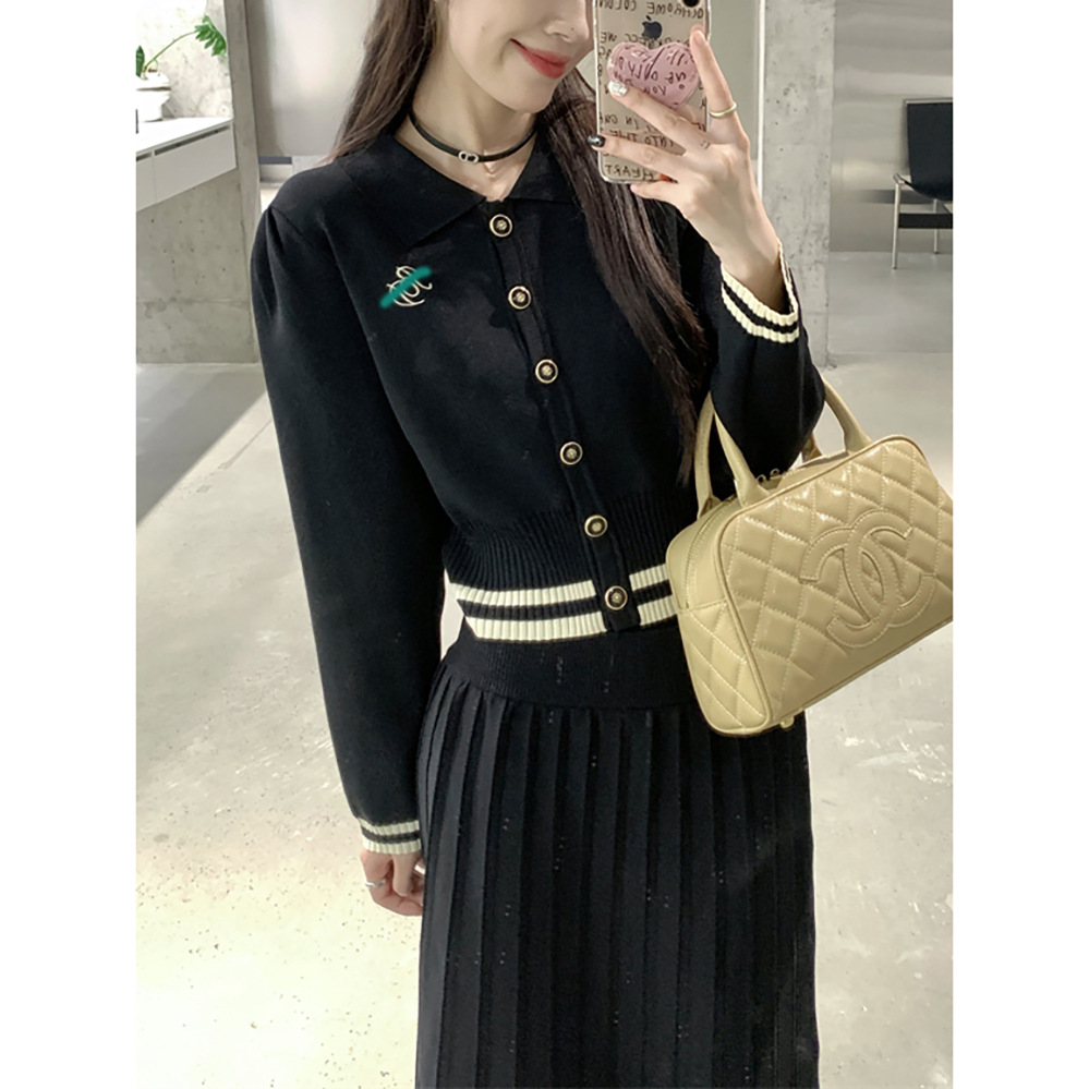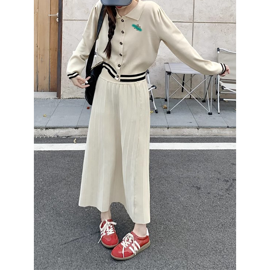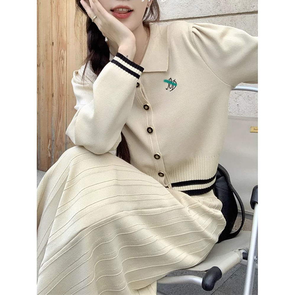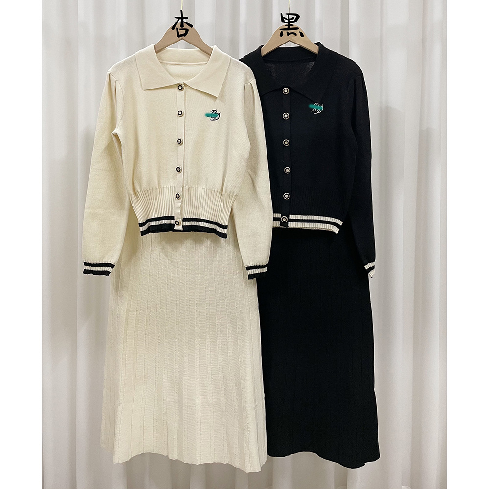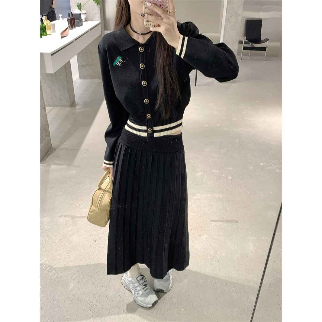 대학 스타일의 어린 소녀 세트 여성 가을 2024 새로운 대비 자수 니트 카디건 스커트 투피스 세트스토어 가기