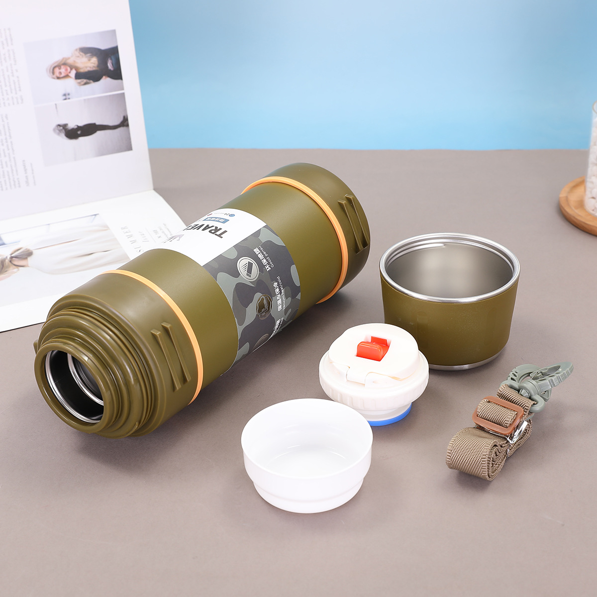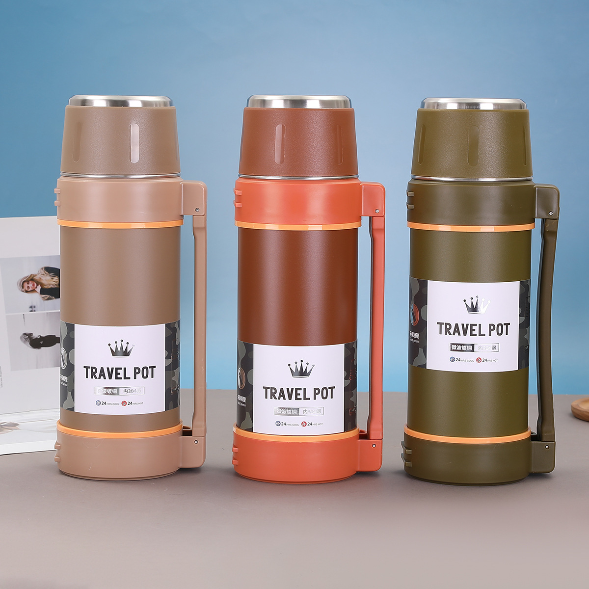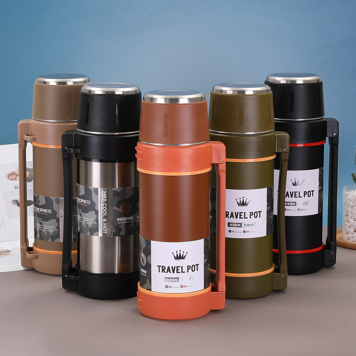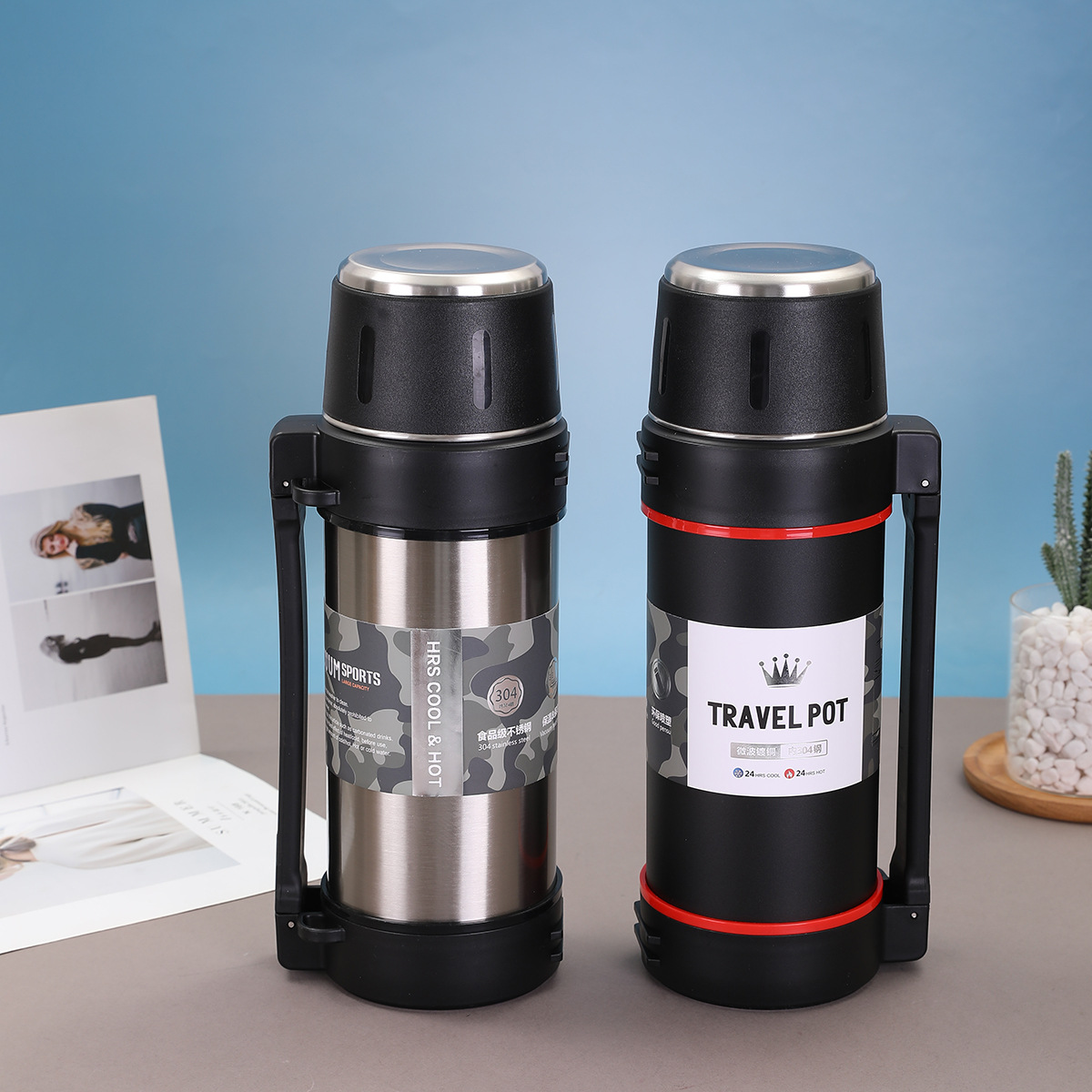 대용량 304 스테인레스 스틸 보온병 컵 한 뚜껑 이중 사용 야외 등산 여행 냄비 휴대용 스트랩 스포츠 워터 컵스토어 가기