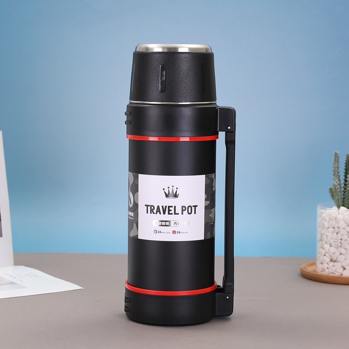 대용량 304 스테인레스 스틸 보온병 컵 한 뚜껑 이중 사용 야외 등산 여행 냄비 휴대용 스트랩 스포츠 워터 컵