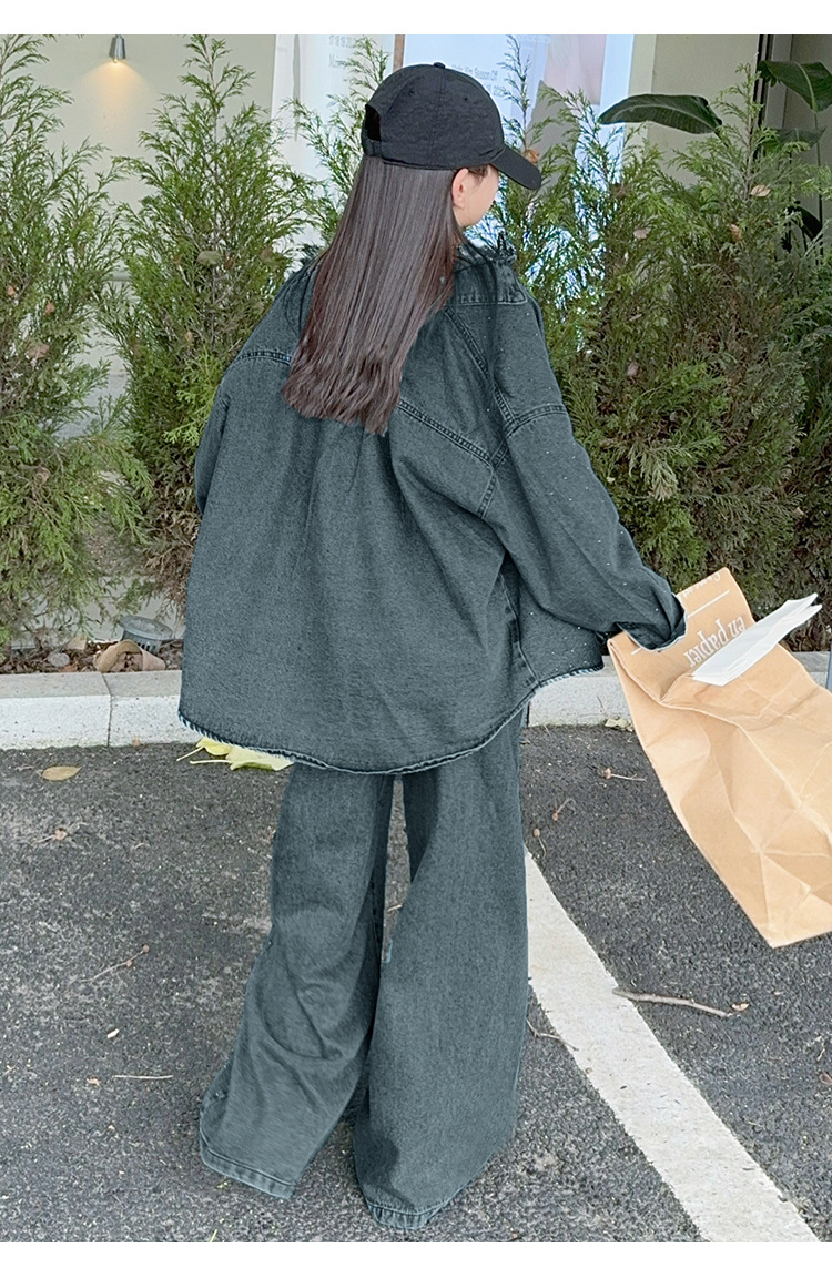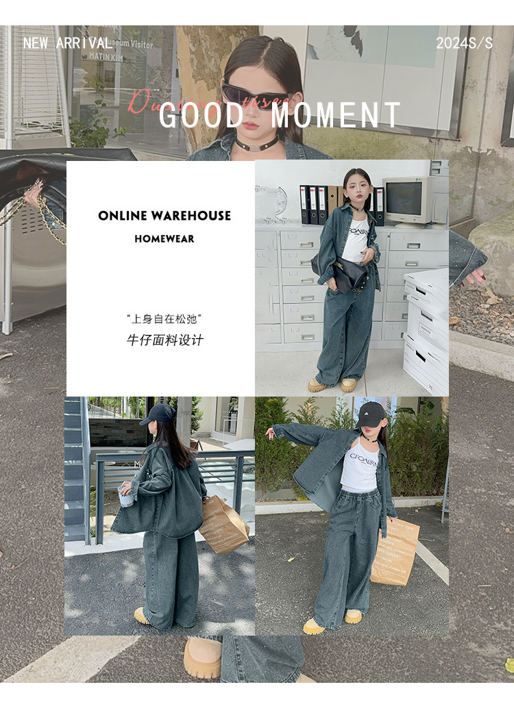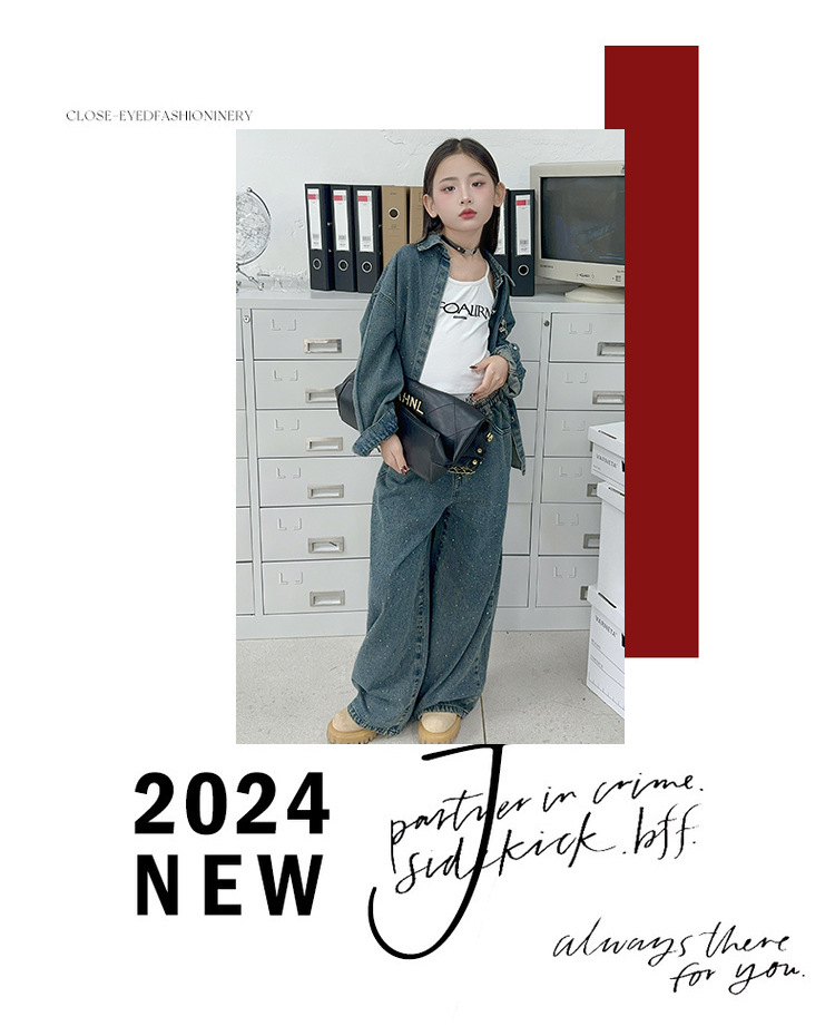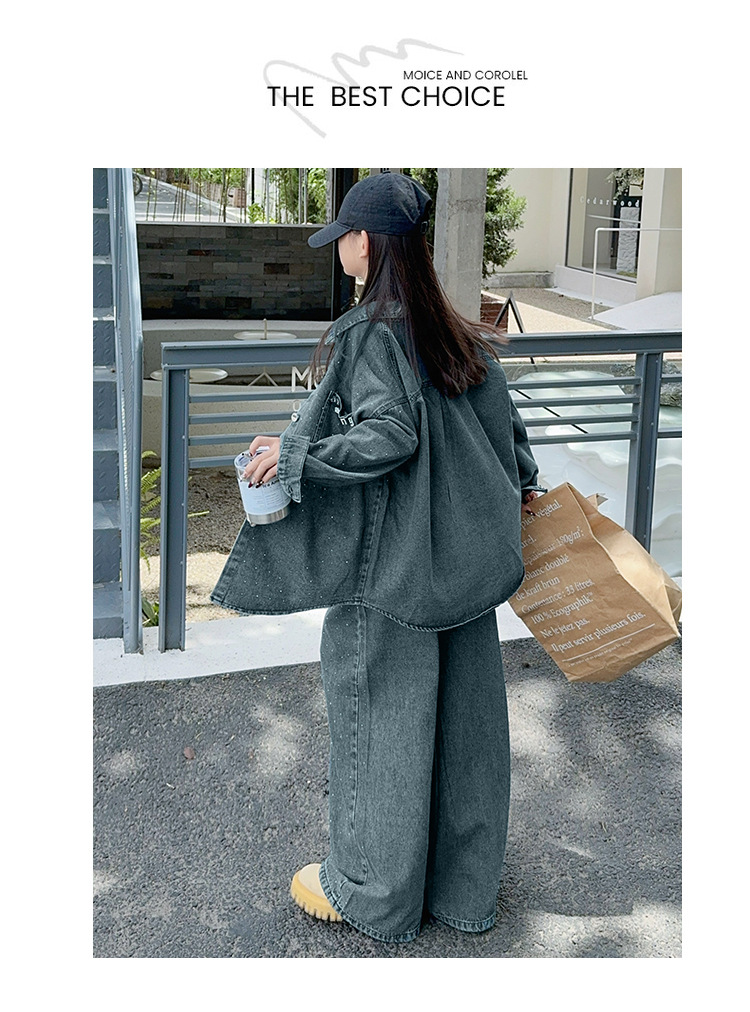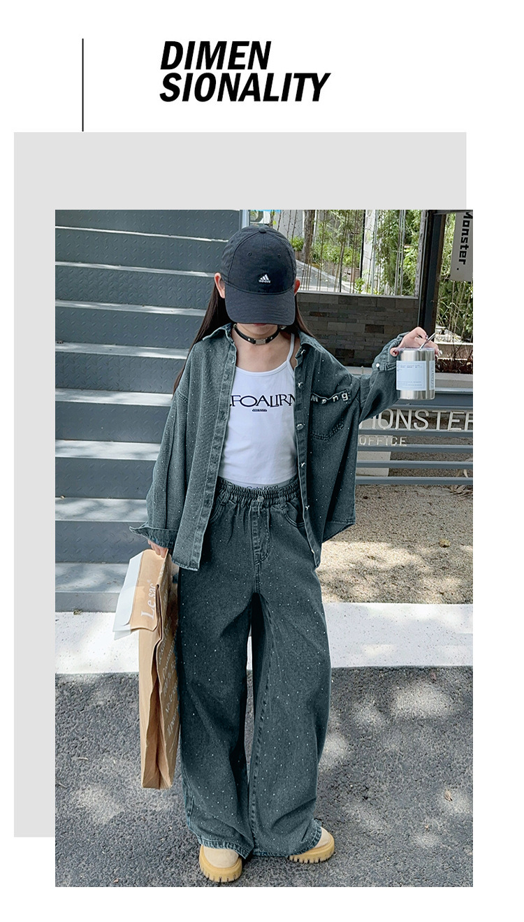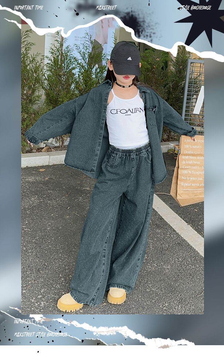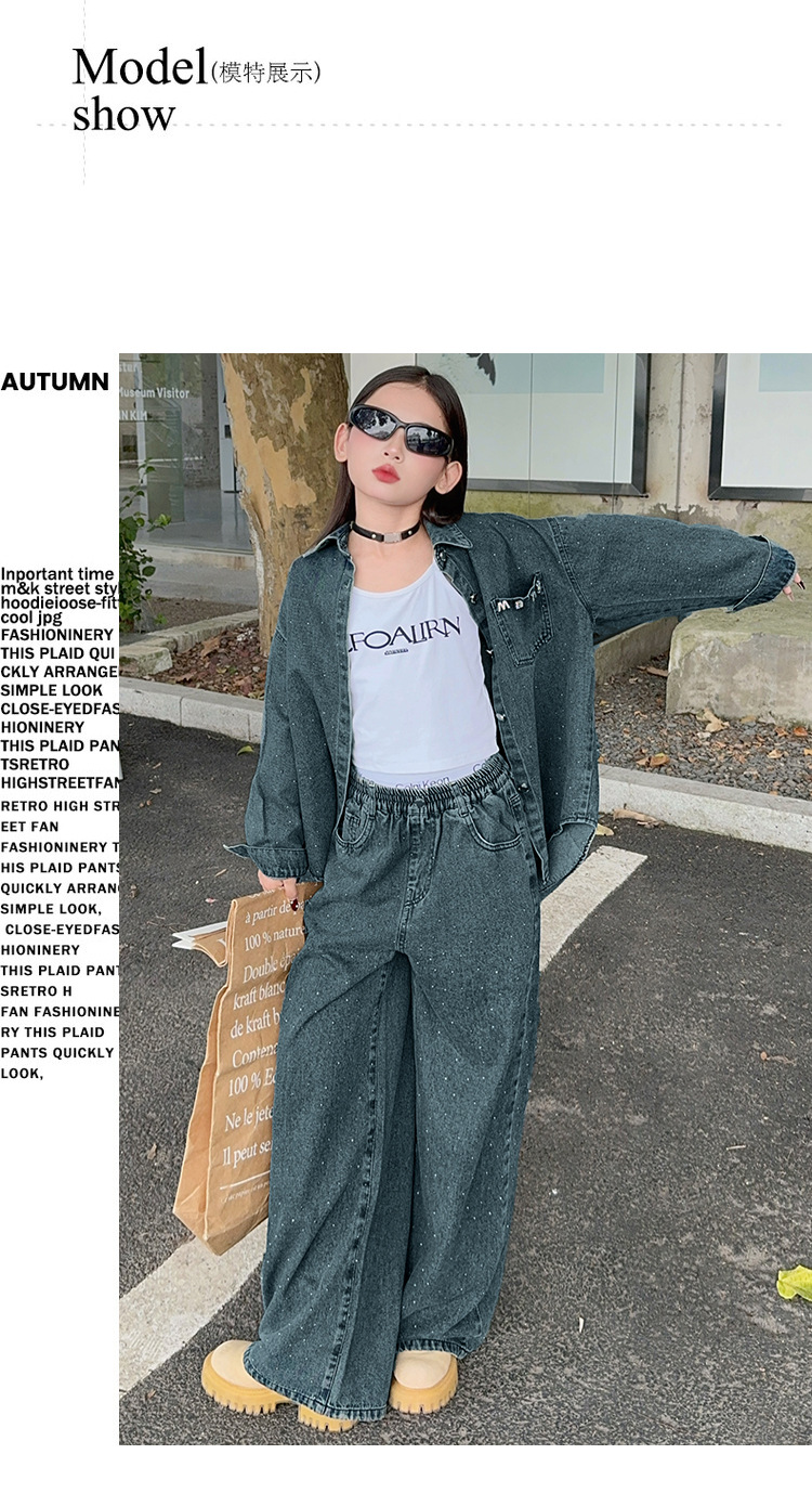 소녀 가을 데님 세트 2024 새로운 어린이 아메리칸 스타일 라인스톤 봄과 가을 중 큰 어린이 넓은 다리 바지 투피스 유행 세트스토어 가기
