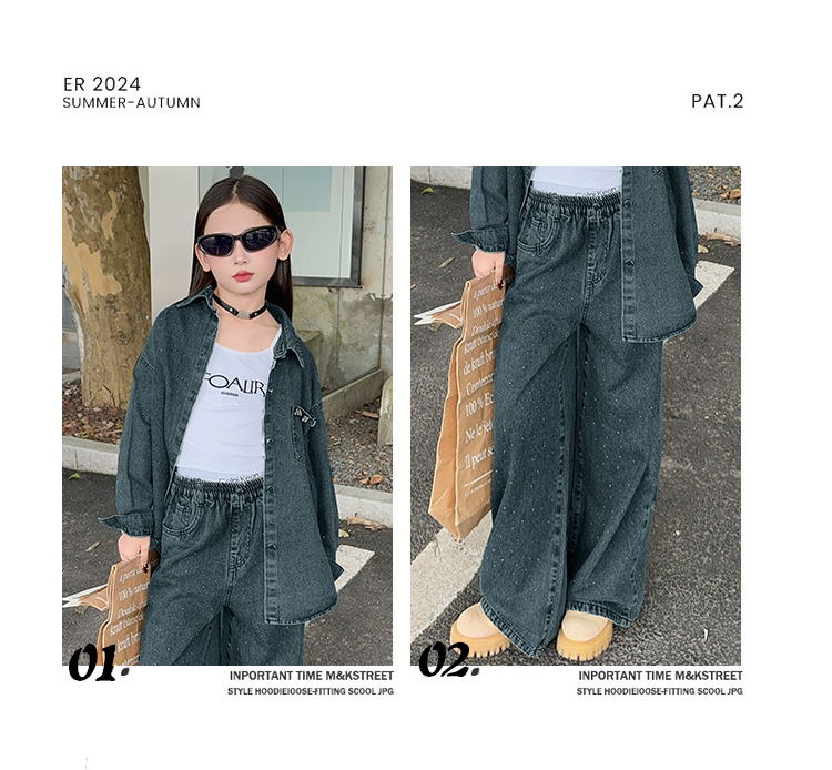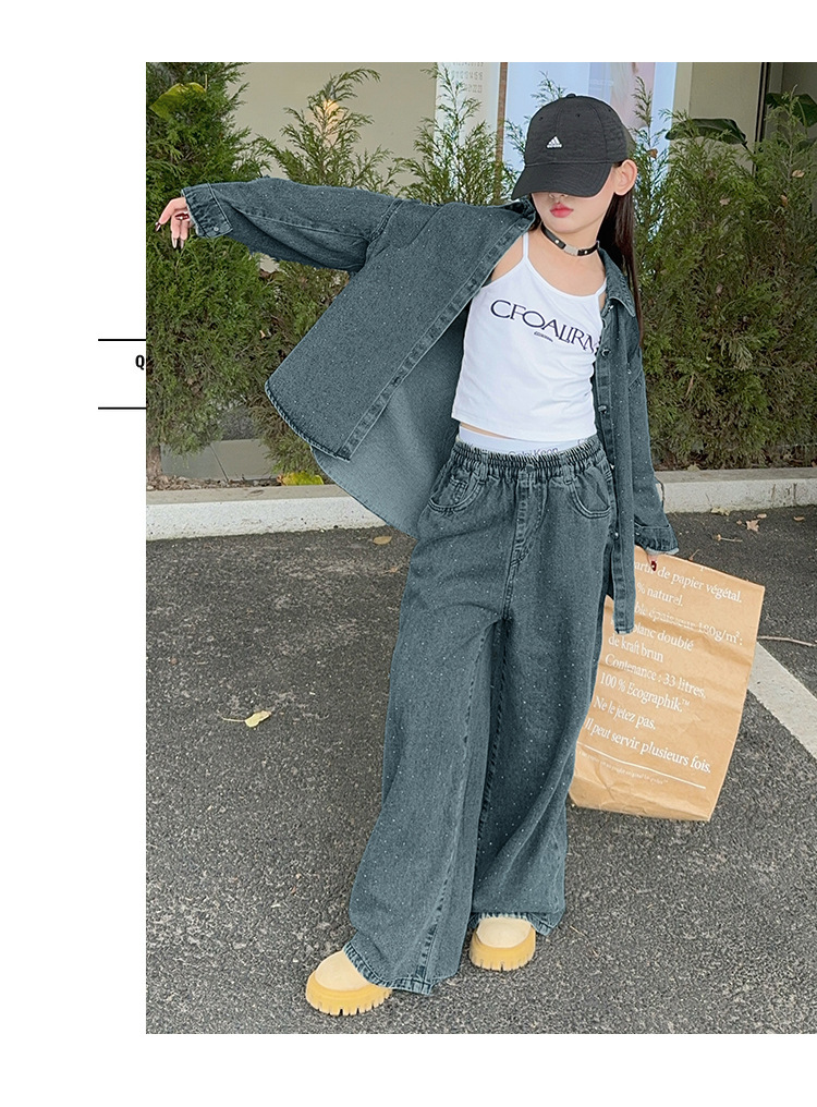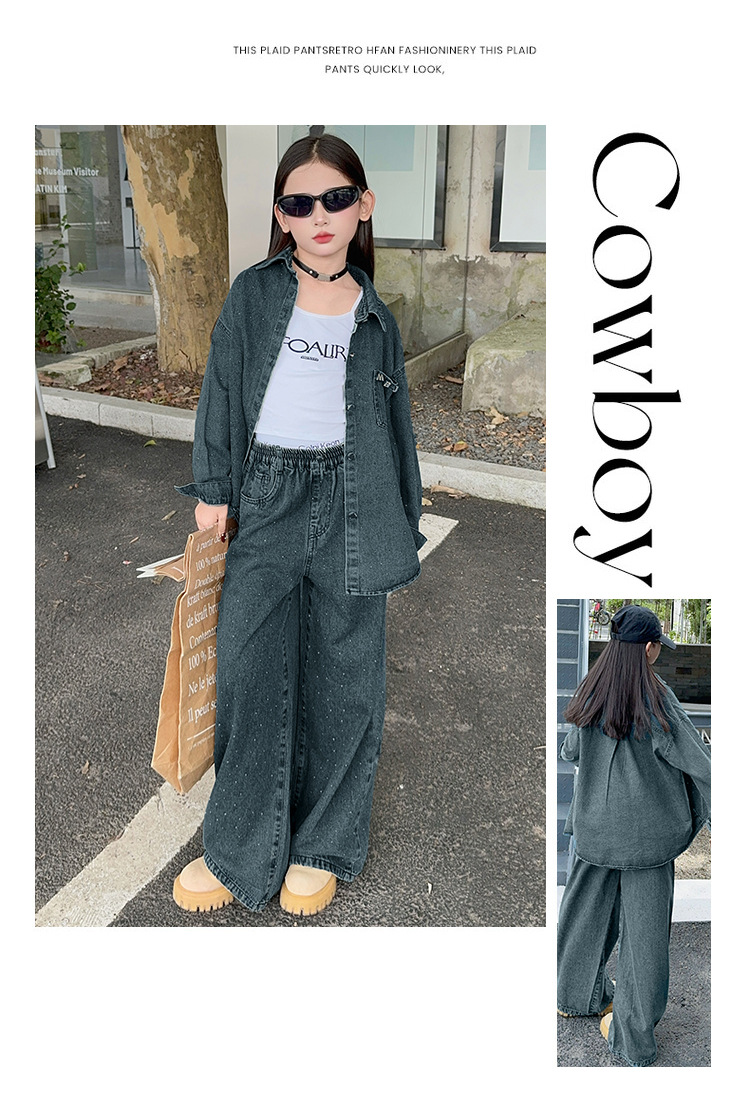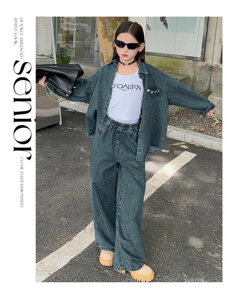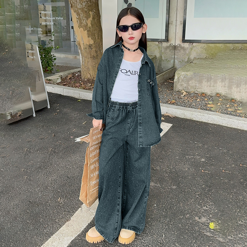 소녀 가을 데님 세트 2024 새로운 어린이 아메리칸 스타일 라인스톤 봄과 가을 중 큰 어린이 넓은 다리 바지 투피스 유행 세트