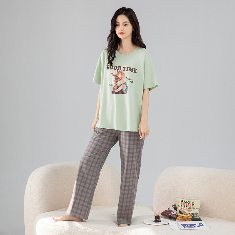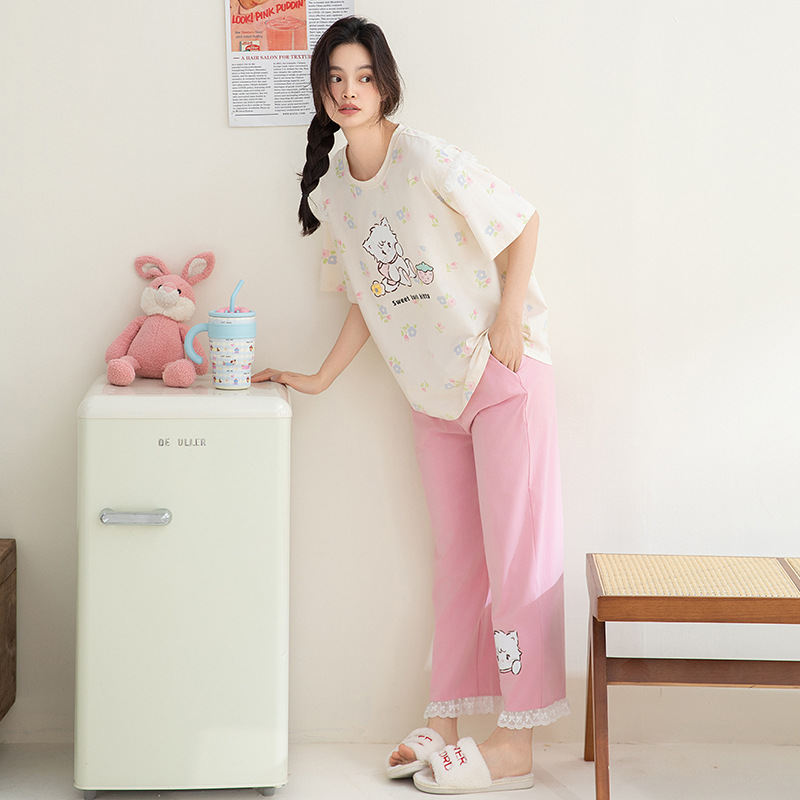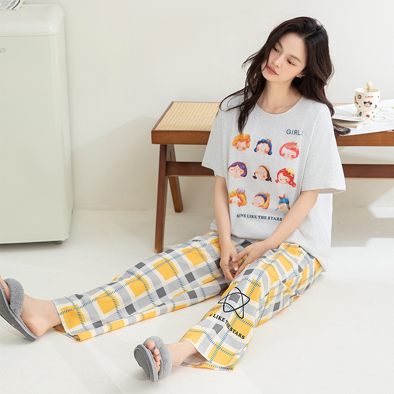 실제 매장에서 판매하는 고품질 95% 면 시원한 면 잠옷 여성용 여름 반팔 긴바지 대형 사이즈 루즈핏 캐주얼 홈웨어 세트스토어 가기