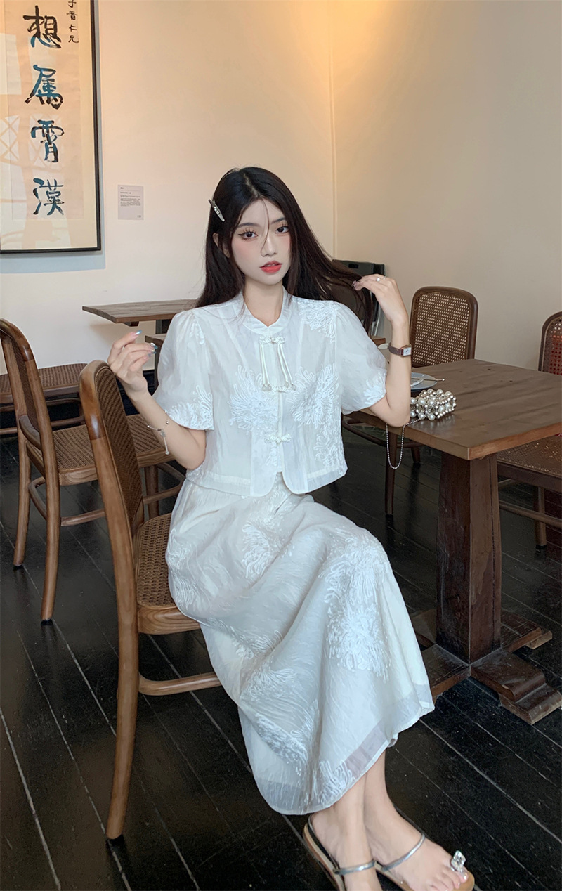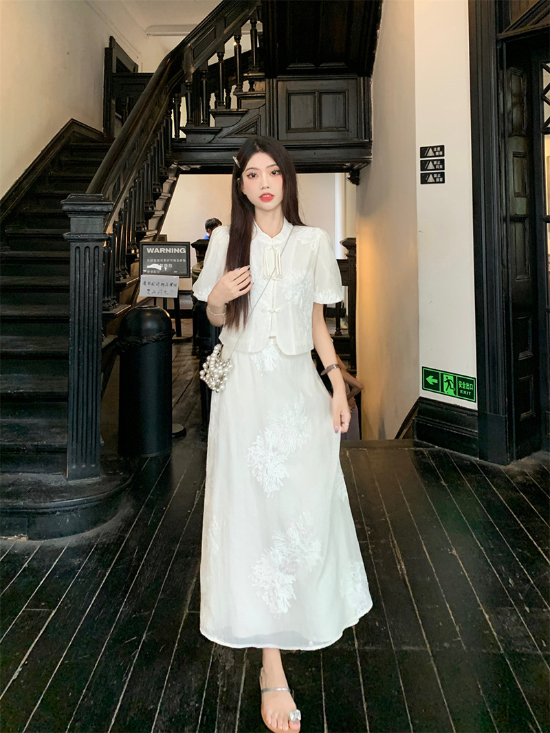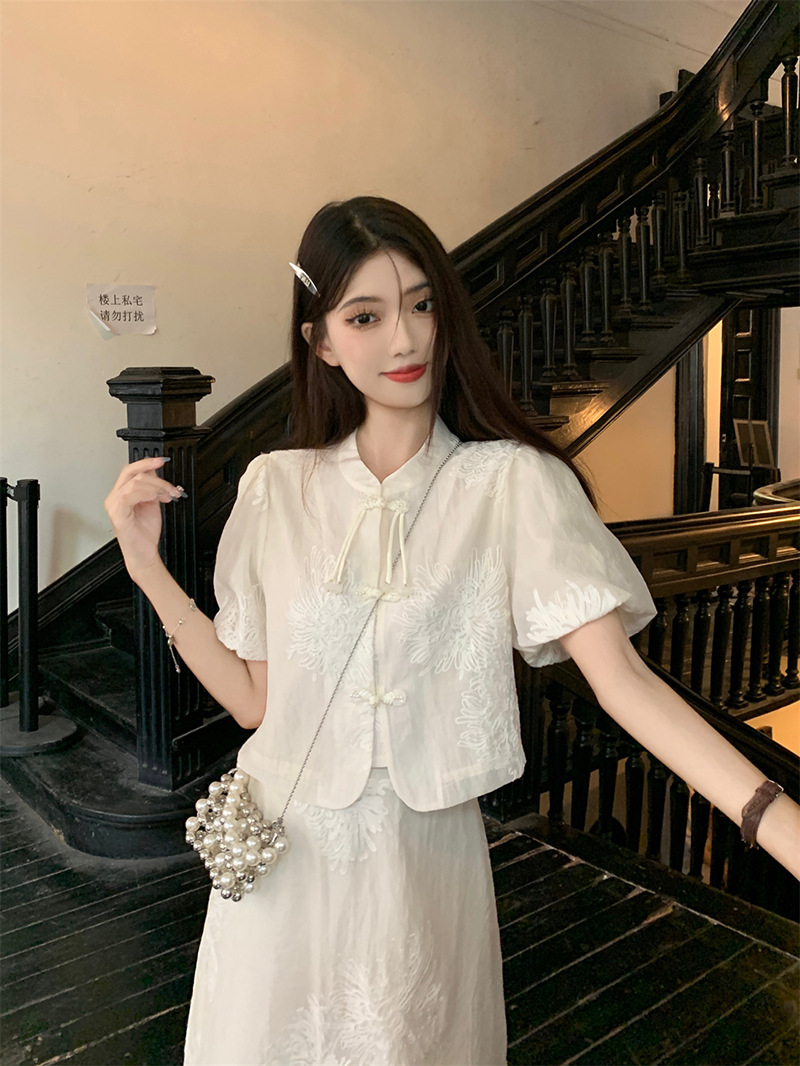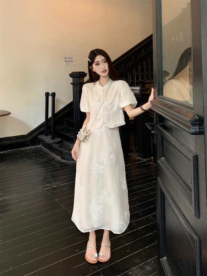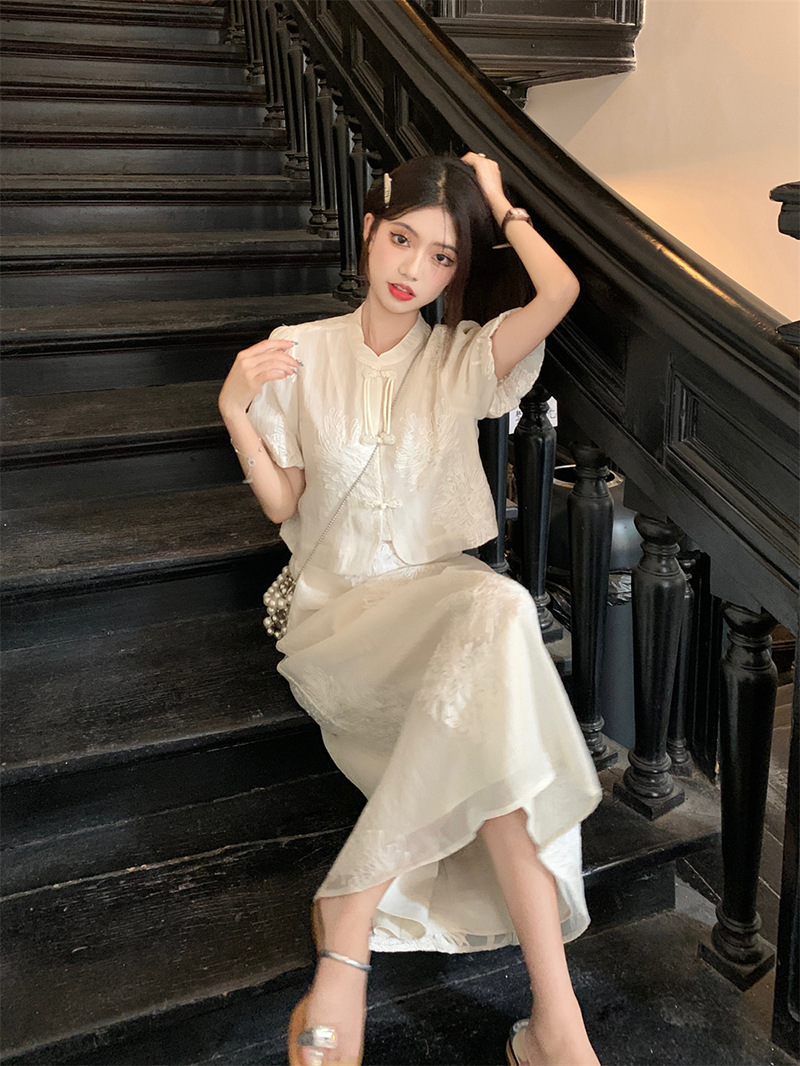 여름 2024 새로운 패션 세트 새로운 중국 술 버튼 우아한 짧은 소매 셔츠 높은 허리 절반 길이 원피스 여성스토어 가기