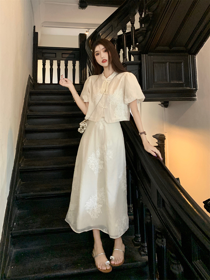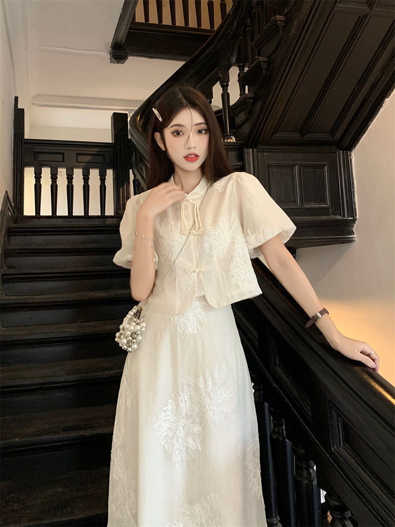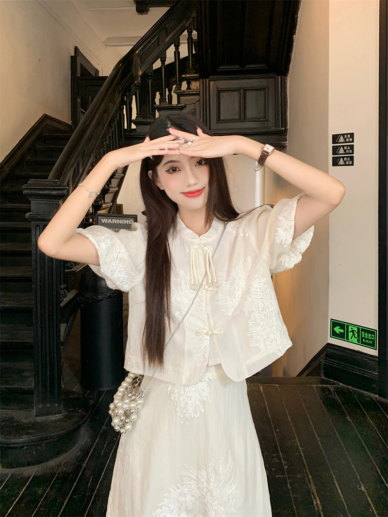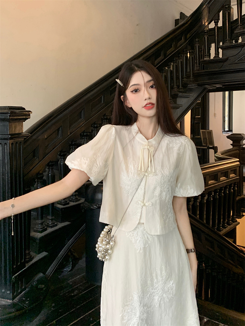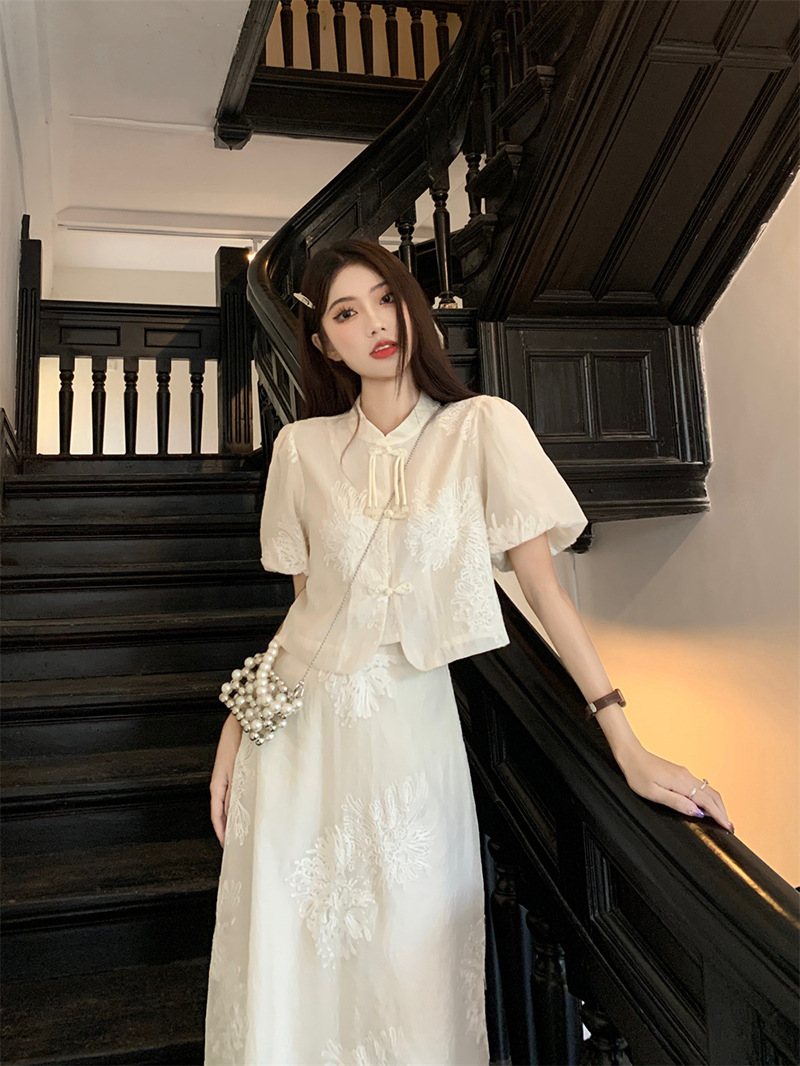 여름 2024 새로운 패션 세트 새로운 중국 술 버튼 우아한 짧은 소매 셔츠 높은 허리 절반 길이 원피스 여성스토어 가기
