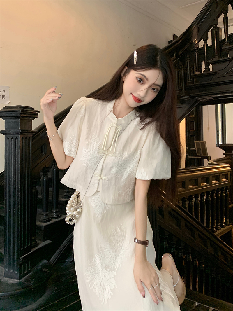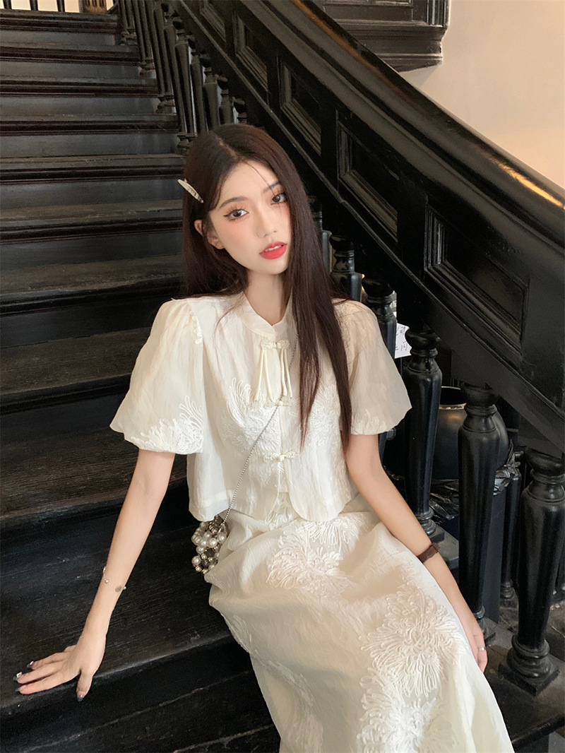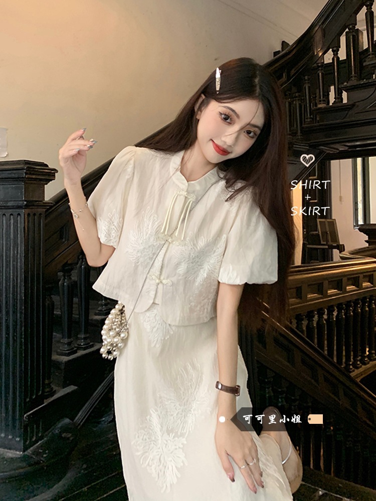 여름 2024 새로운 패션 세트 새로운 중국 술 버튼 우아한 짧은 소매 셔츠 높은 허리 절반 길이 원피스 여성