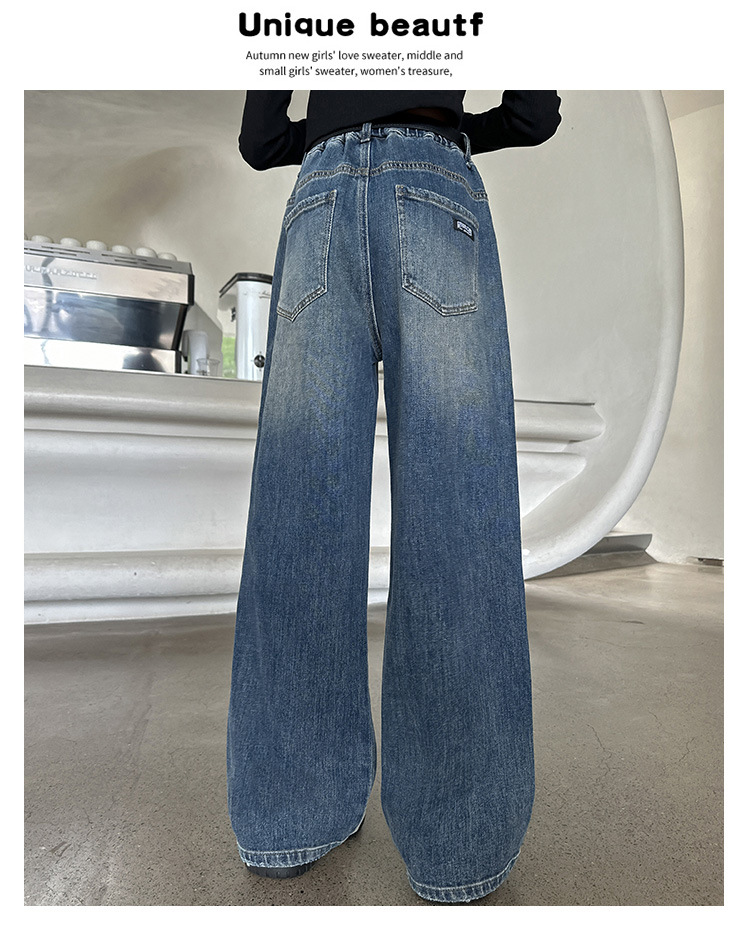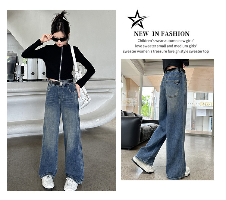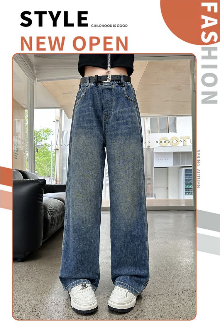 소녀 가을 바지 외부 착용 어린이 서양식 올매치 스트레이트 와이드 레그 바지 가을 큰 어린이 느슨한 청바지 봄과 가을