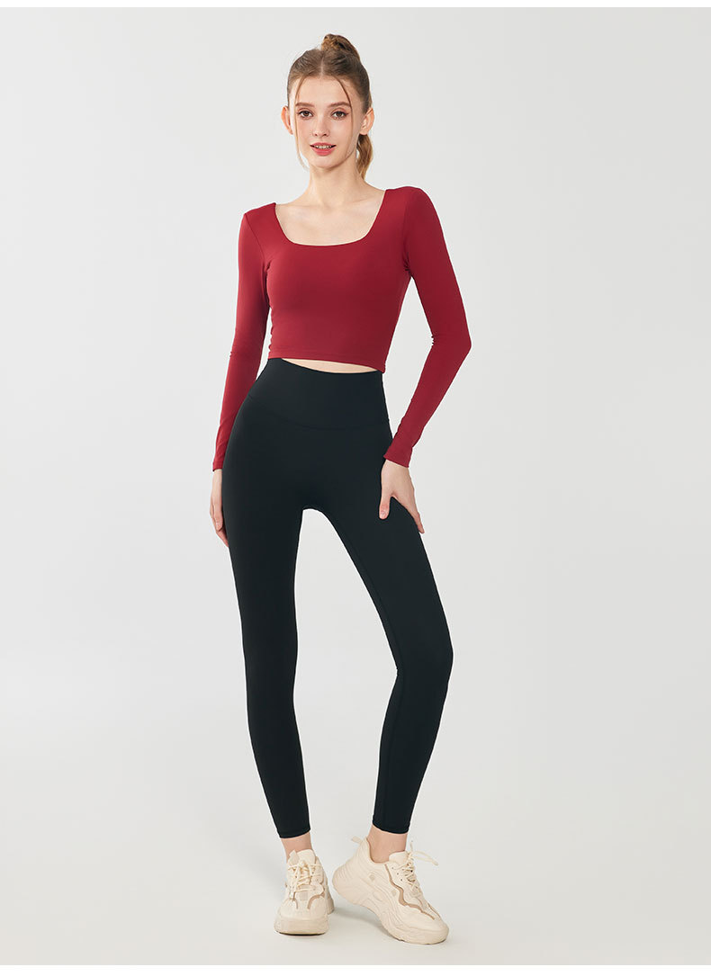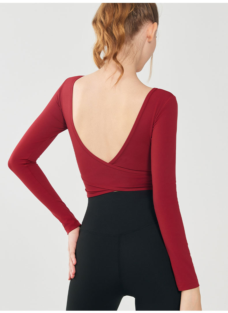 가을과 겨울 크로스 아름다운 백 요가 긴팔 여성용 벨트 가슴 패드 백리스 스퀘어 칼라 슬림 핏 아우터 착용 스포츠 티셔츠 피트니스 탑