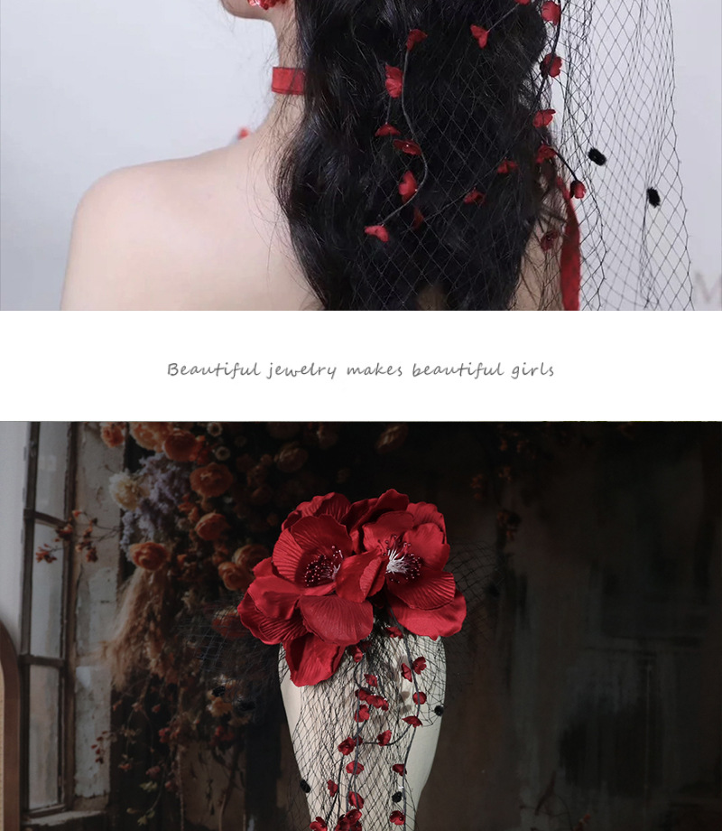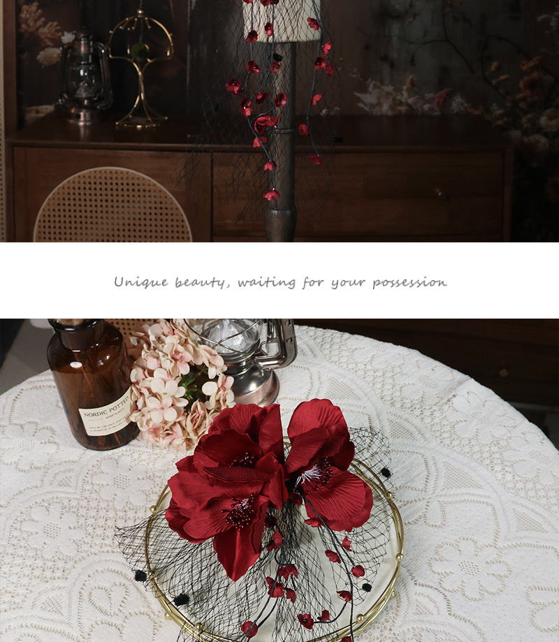 프랑스 복고풍 신부 머리 장식 손으로 만든 빨간 아이리스 꽃 머리핀 메시 활 헤드폰 웨딩 스타일 액세서리