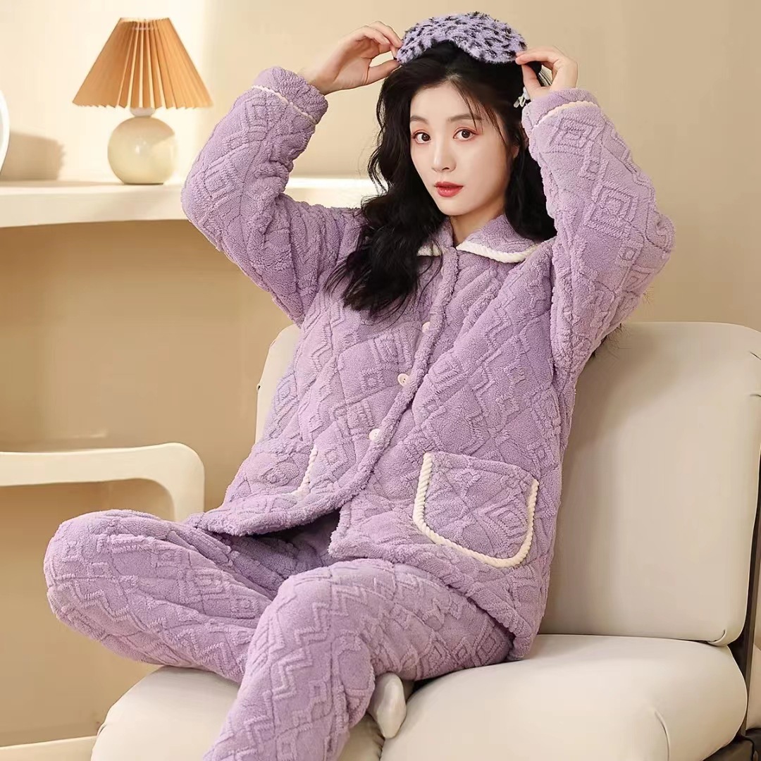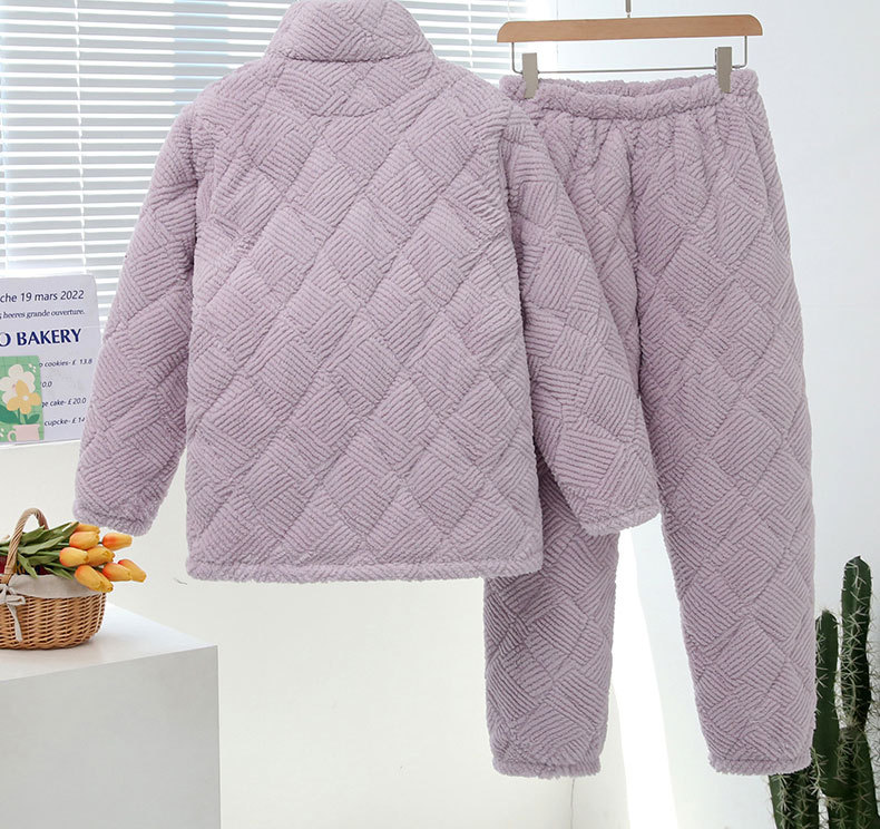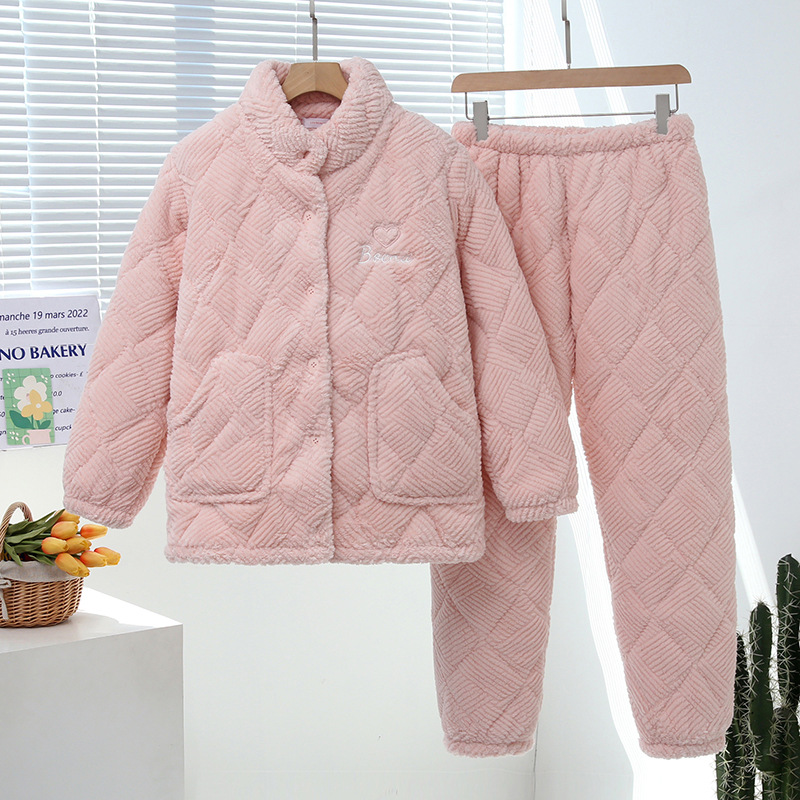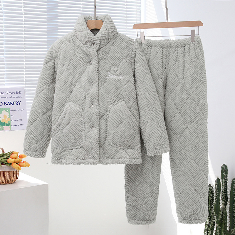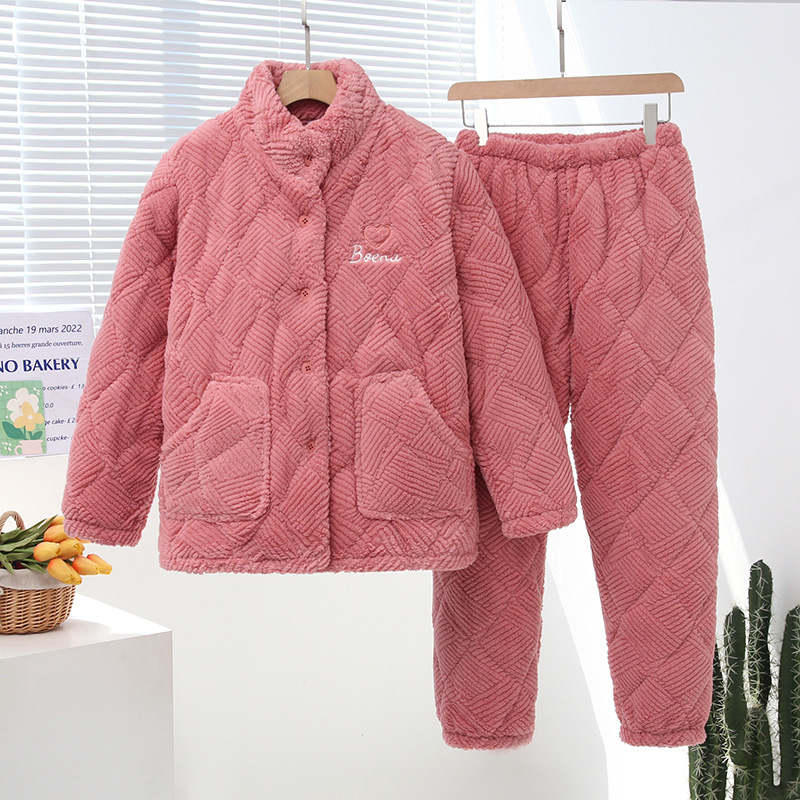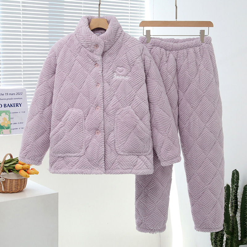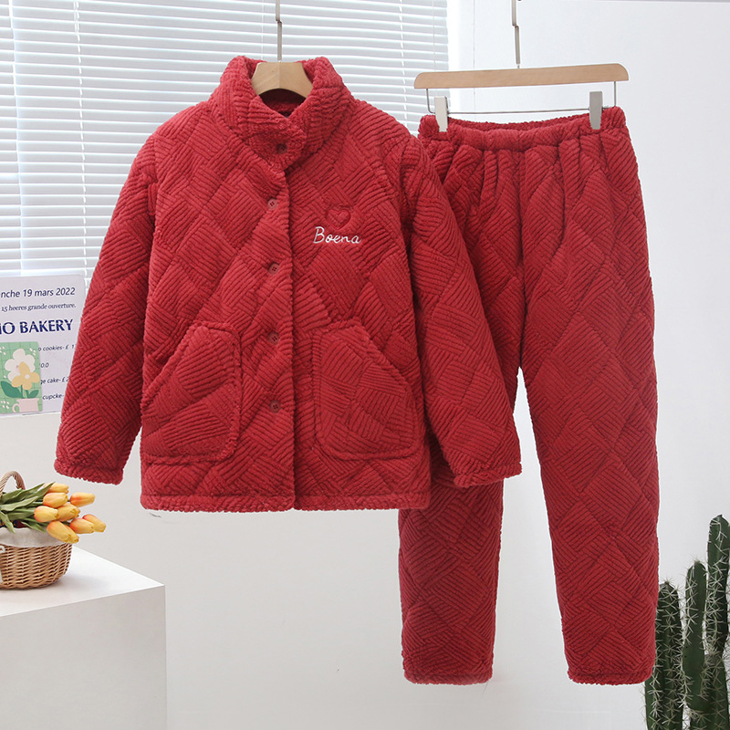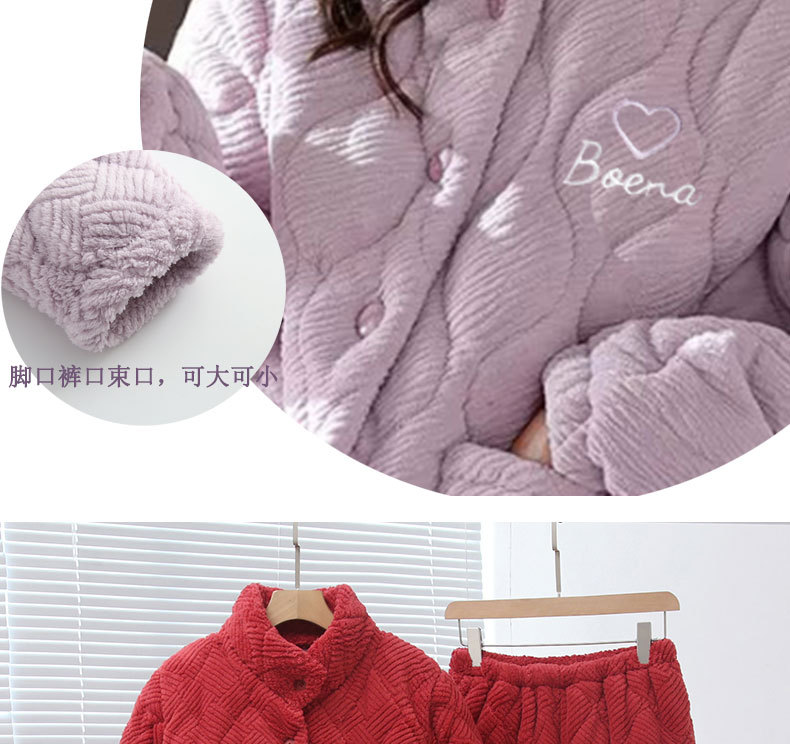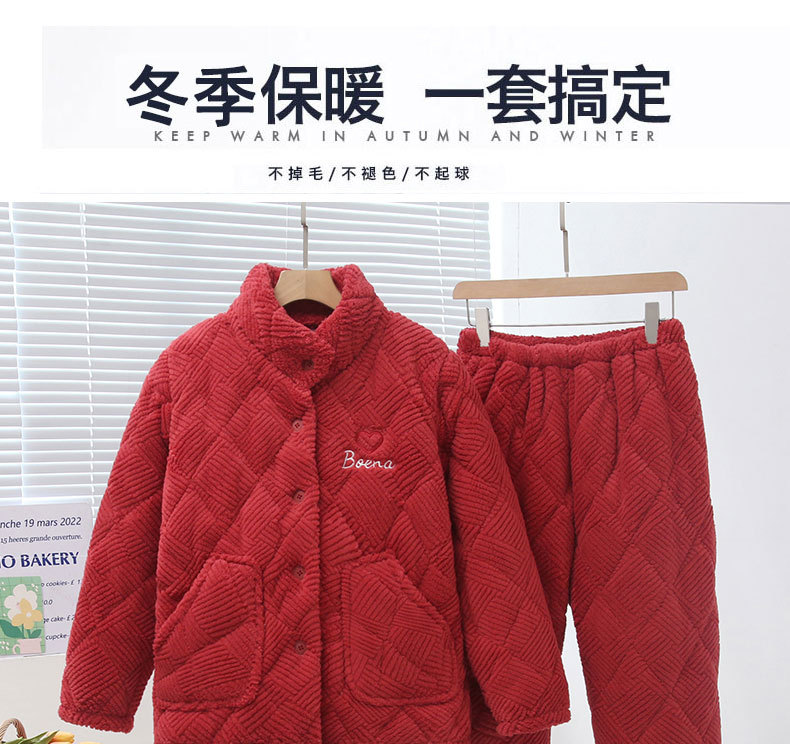 중국 스타일 중국 스타일 세로 칼라가 달린 3 층 퀼트 파자마 여성의 두꺼운 자수는 겨울 따뜻한 집 옷을 입을 수 세트스토어 가기