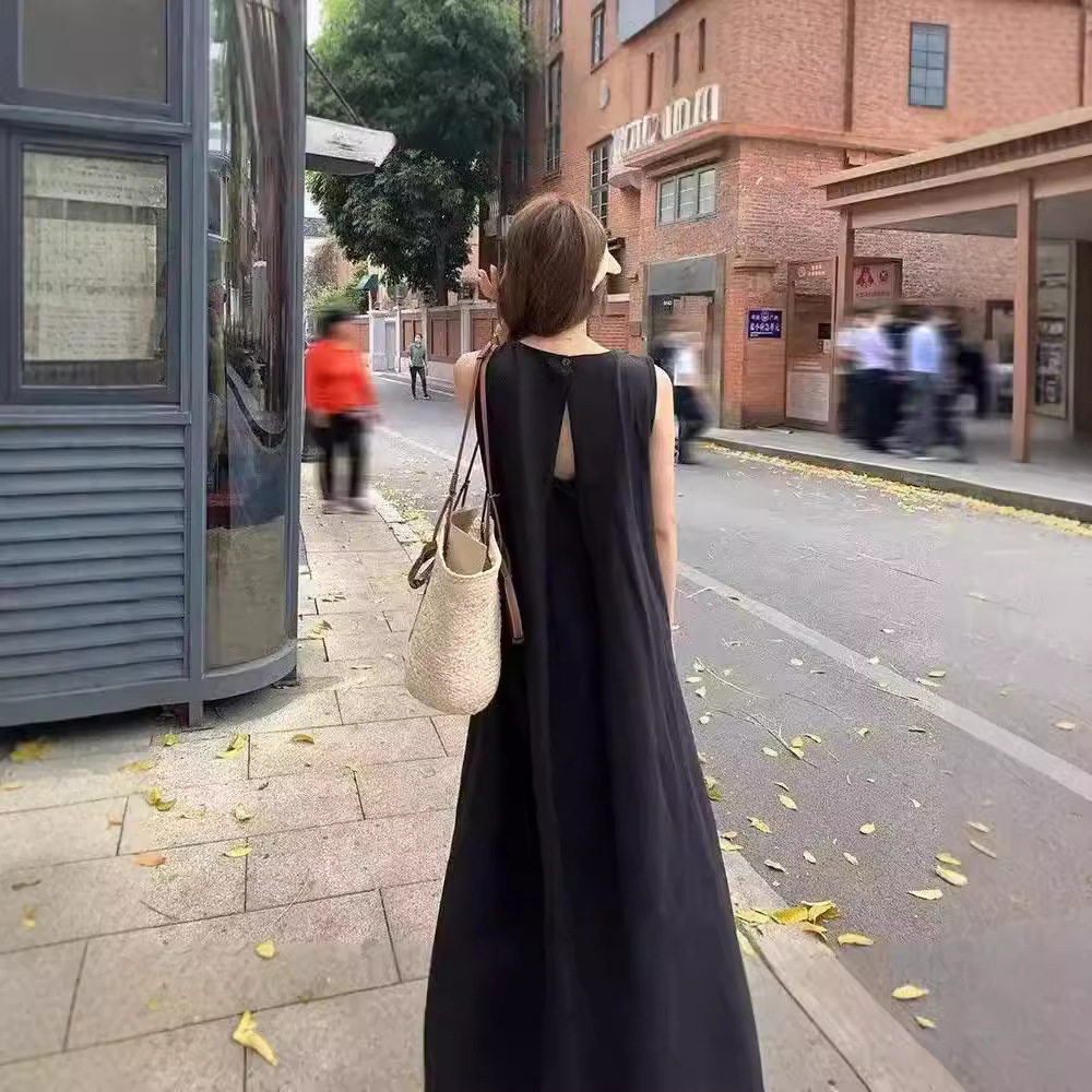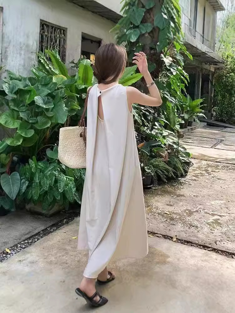 국경 도매 우아한 민소매 등받이 원피스 느슨한 새로운 스타일 신선한 빈 크루 넥 휴가 휴가 휴가 원피스 여성을위한