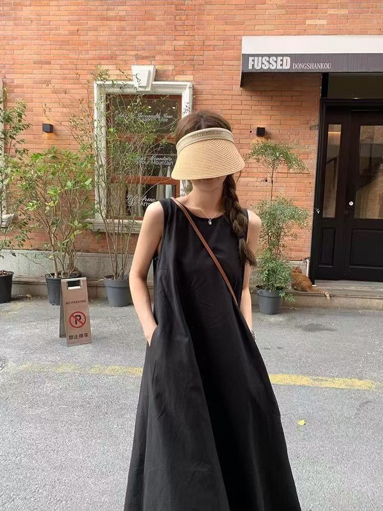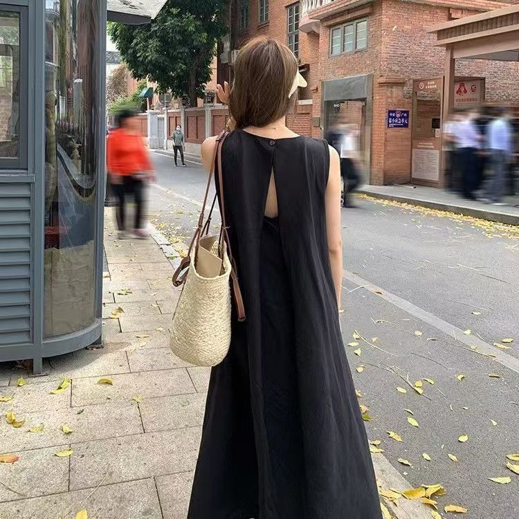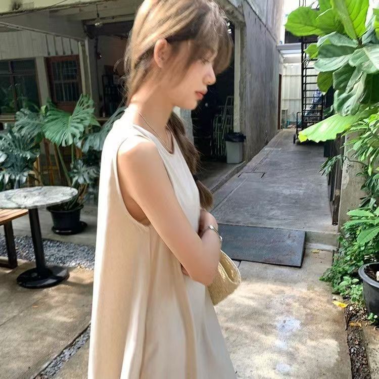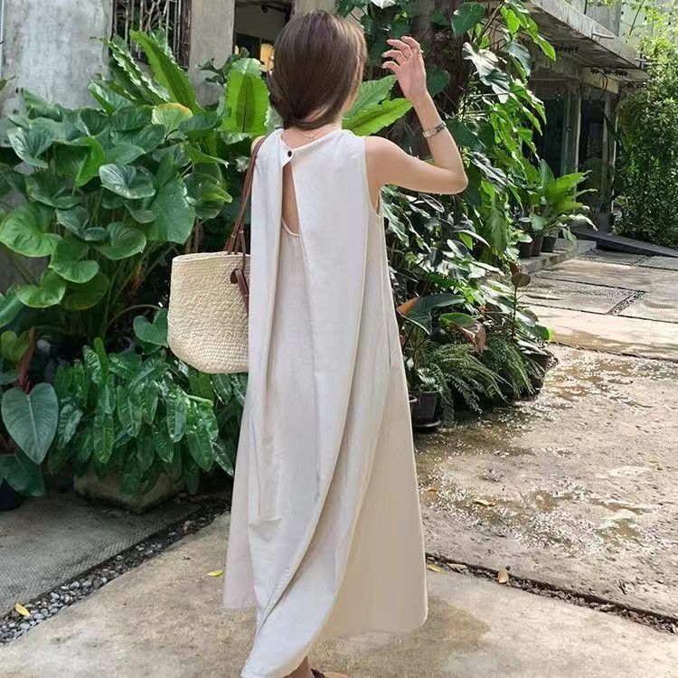 국경 도매 우아한 민소매 등받이 원피스 느슨한 새로운 스타일 신선한 빈 크루 넥 휴가 휴가 휴가 원피스 여성을위한스토어 가기