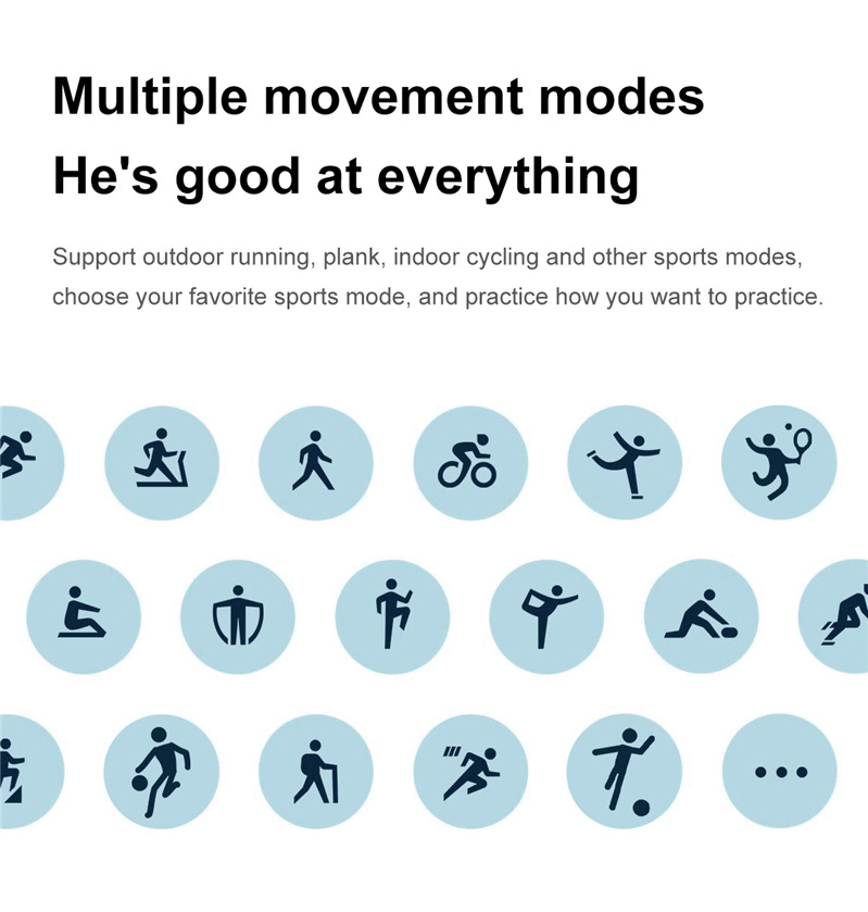 运动数据(计步、距离、卡路里)、室内运动(俯卧撑、室内跑步、平板撑、室内单车、跳绳、瑜伽、战绳、仰卧起坐、椭圆机)、户外运动(户外步行、户外跑步、户外骑行、登山、羽毛球、篮球、足球) |