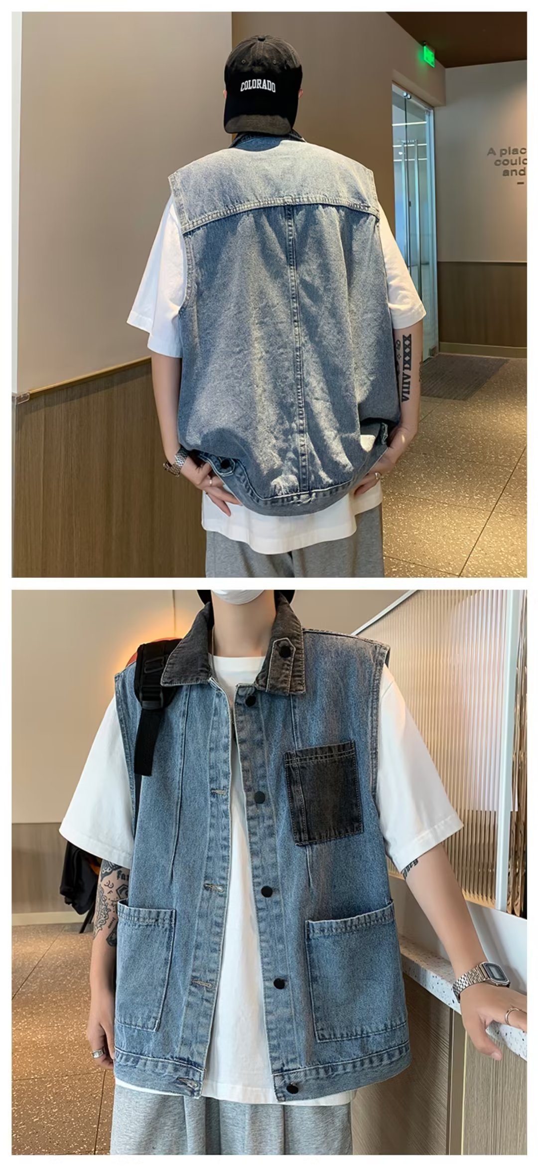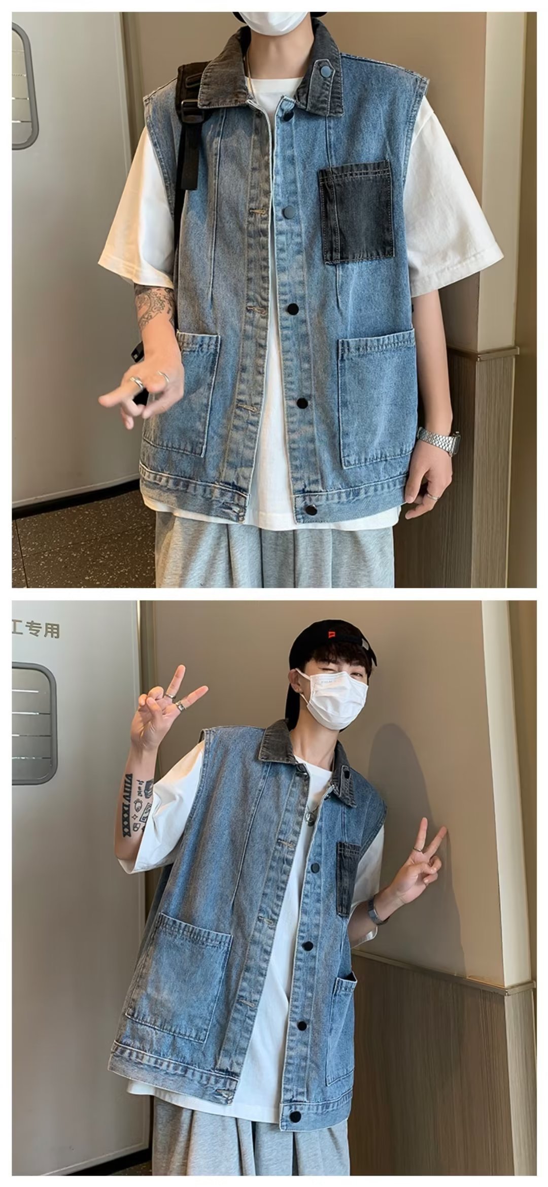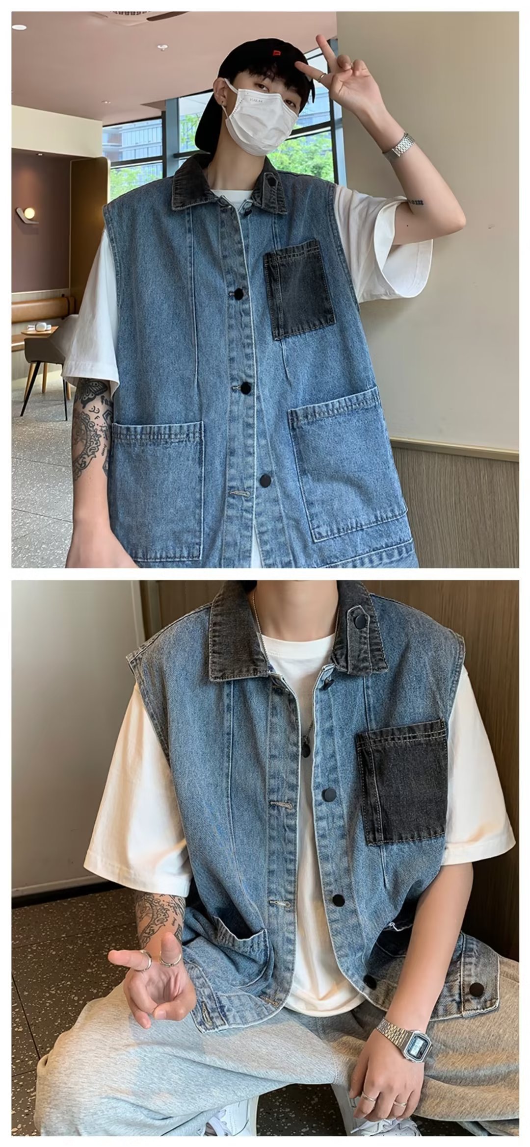 소년 컬러 블록 옷깃 데님 조끼 가을 코트 트렌디 브랜드 Ins 홍콩 스타일 느슨한 스티칭 포켓 웨이스트 코트 조끼